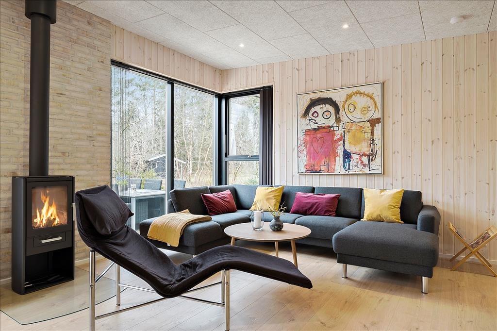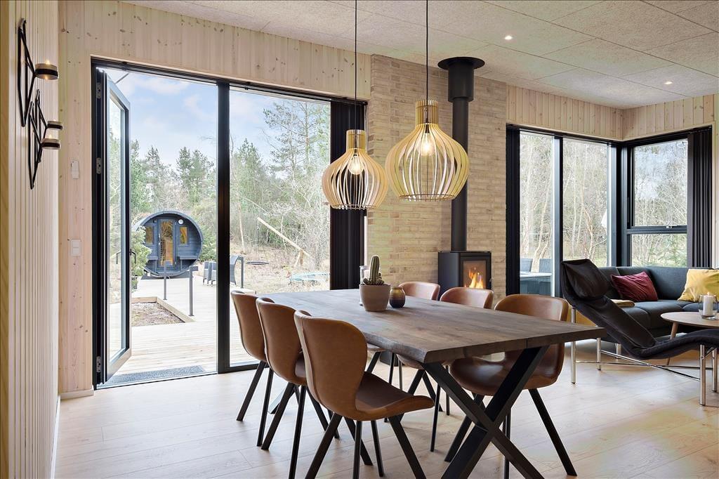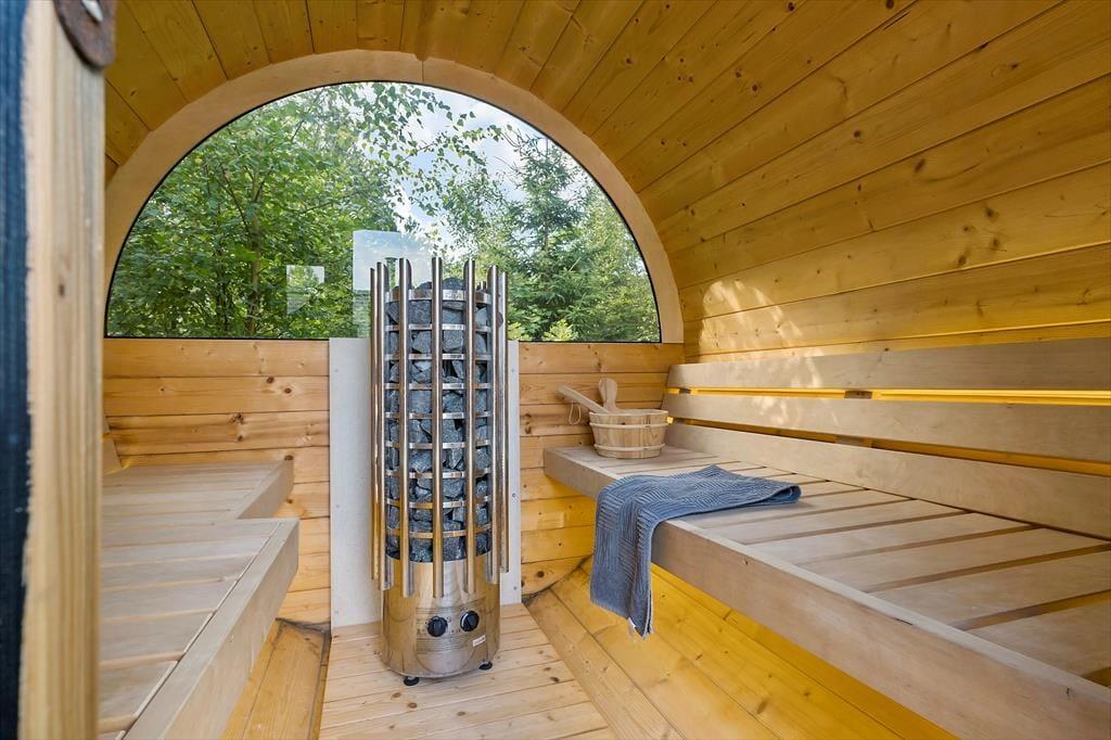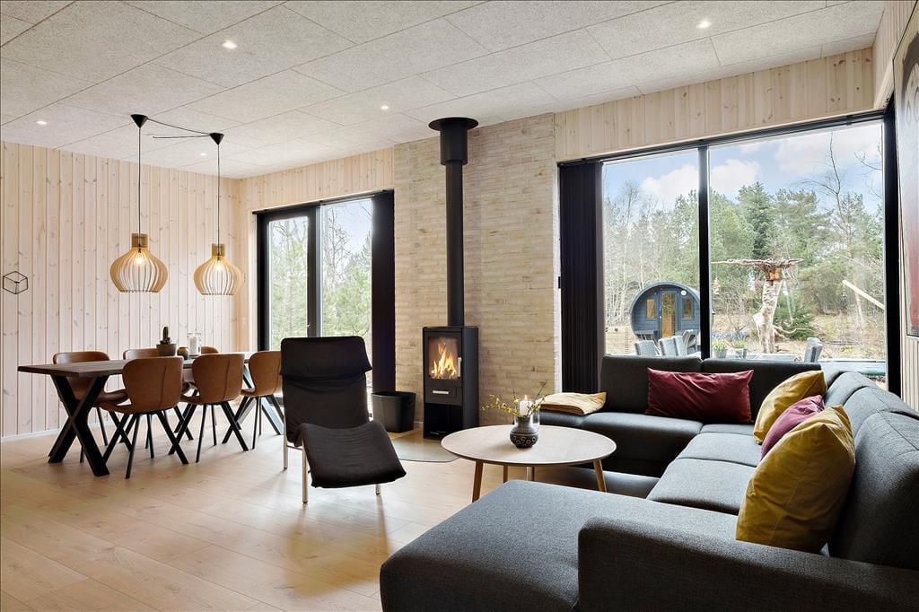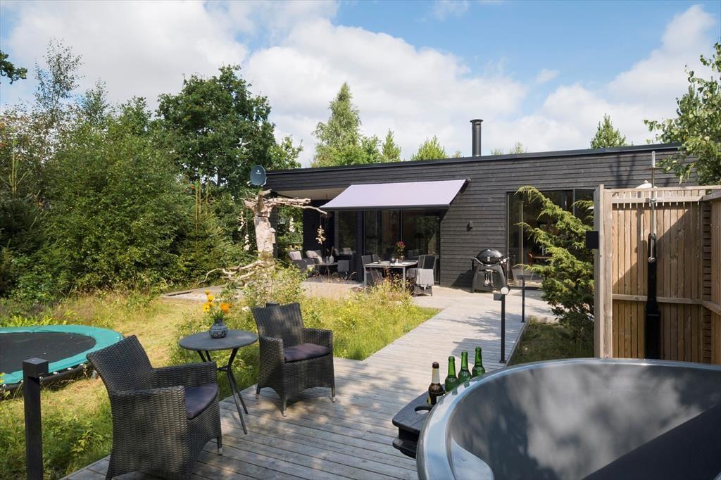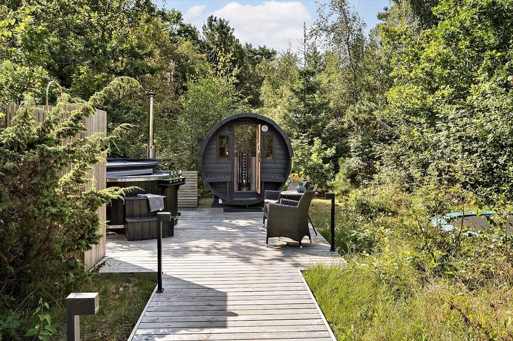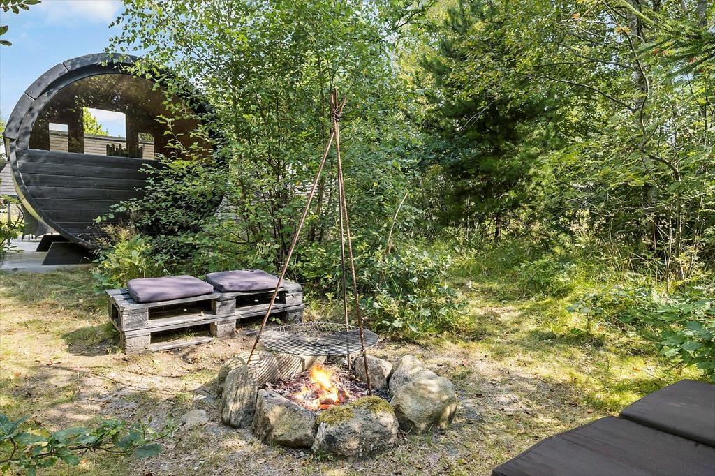 Selvom huset er nyt, har naturgrundens træer og buske stået der længe, og de rammer terrassearealerne ind på kønneste vis. En del af det store og solrige terrasseområde er indrettet som et herligt wellnessområde med brændeopvarmet vildmarksbad, udebruser og saunatønde – det føles velgørende at slappe af og læne sig tilbage i disse omgivelser! På grunden er der desuden bålplads og gode legefaciliteter inklusiv en nedgravet trampolin, og på terrassen sørger terrassevarmeren for, at I ikke bliver kolde, selvom temperaturen falder ved aftentid. Og som endnu en betænksom detalje er der elstik med 3600 WATT til opladning af elbiler på naturgrunden.