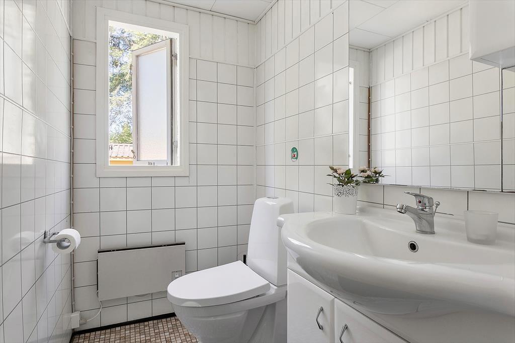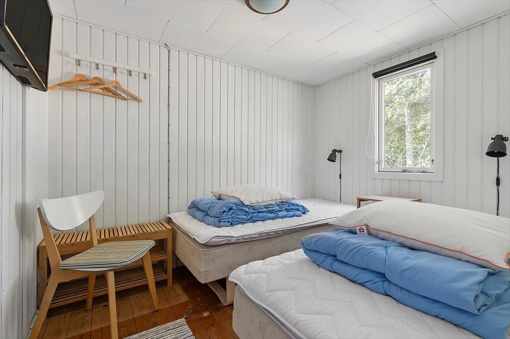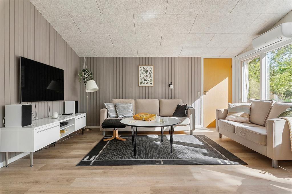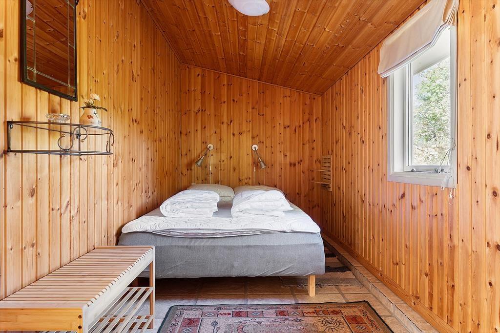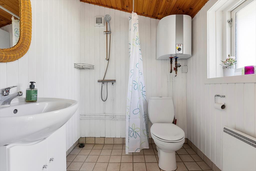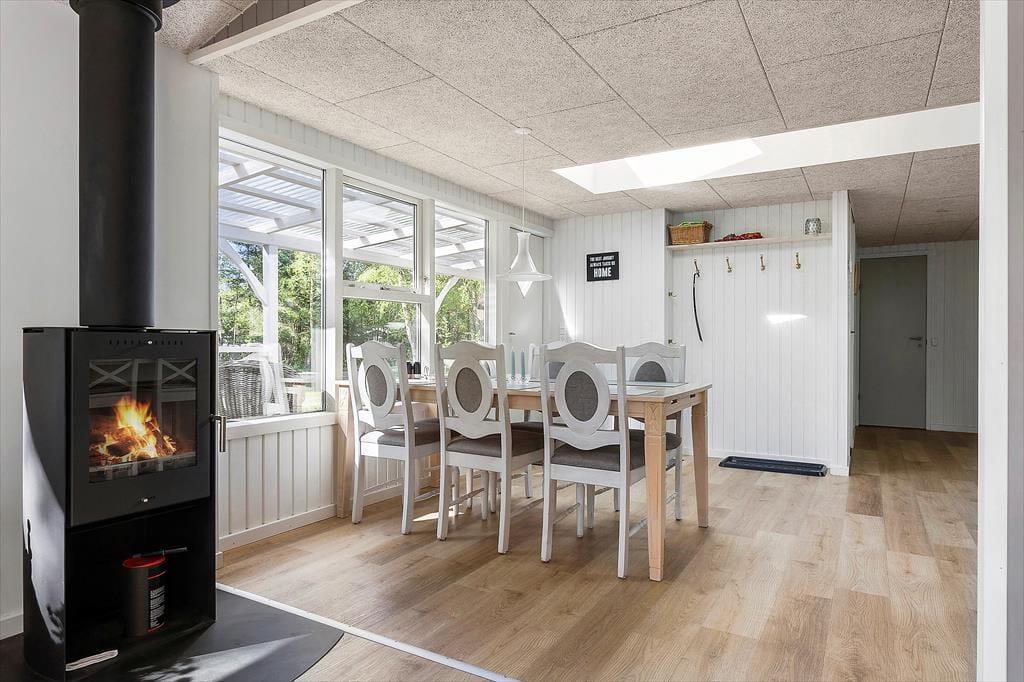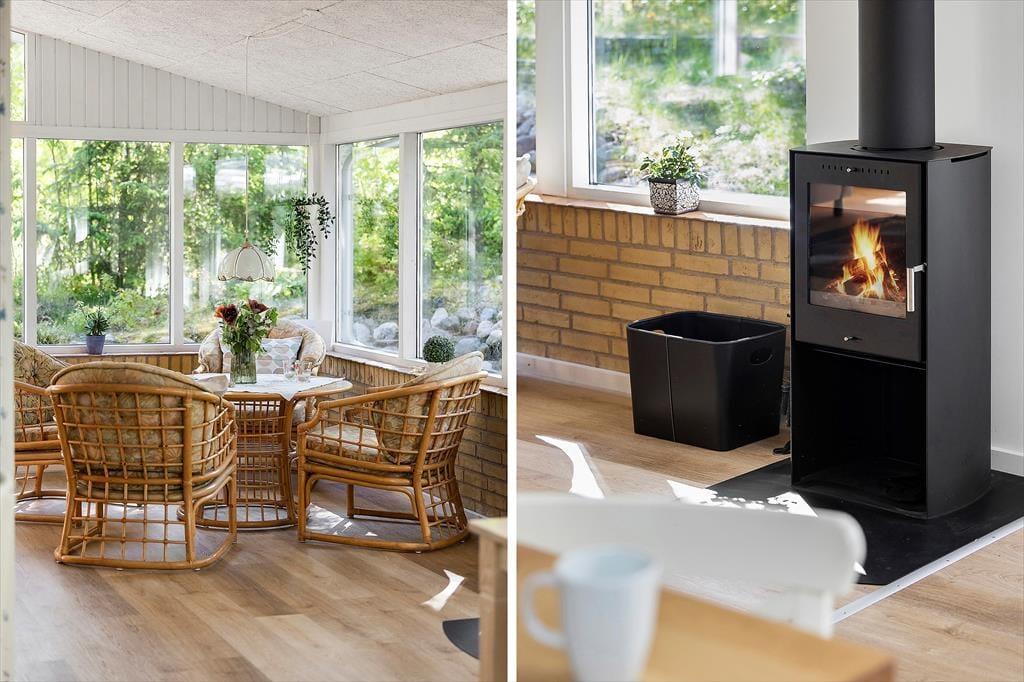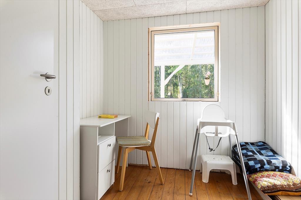 Sommerhusets opholdsafdeling er udstyret med store vinduer, så selv når I slapper af i sofaen eller står i køkkenet, kan I nyde nærheden til naturgrundens grønne frodighed. Opholdsafdelingen består af et stemningsfuldt køkken-alrum med brændeovn, og herfra er der direkte forbindelse til en opholdsstue med loft til kip og indfaldslys fra både øst og syd. De tre soveværelser ligger godt fordelt i huset, og der er også et gæstetoilet inden døre, og fra en overdækket terrasse har I adgang til et brusebadeværelse og et bryggers.