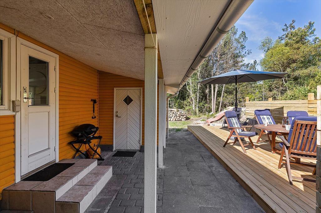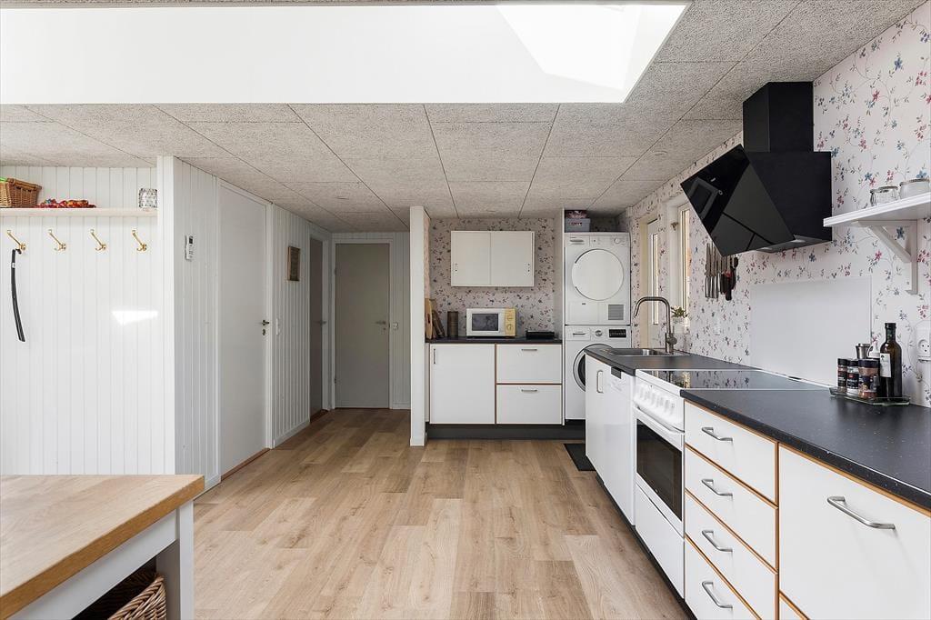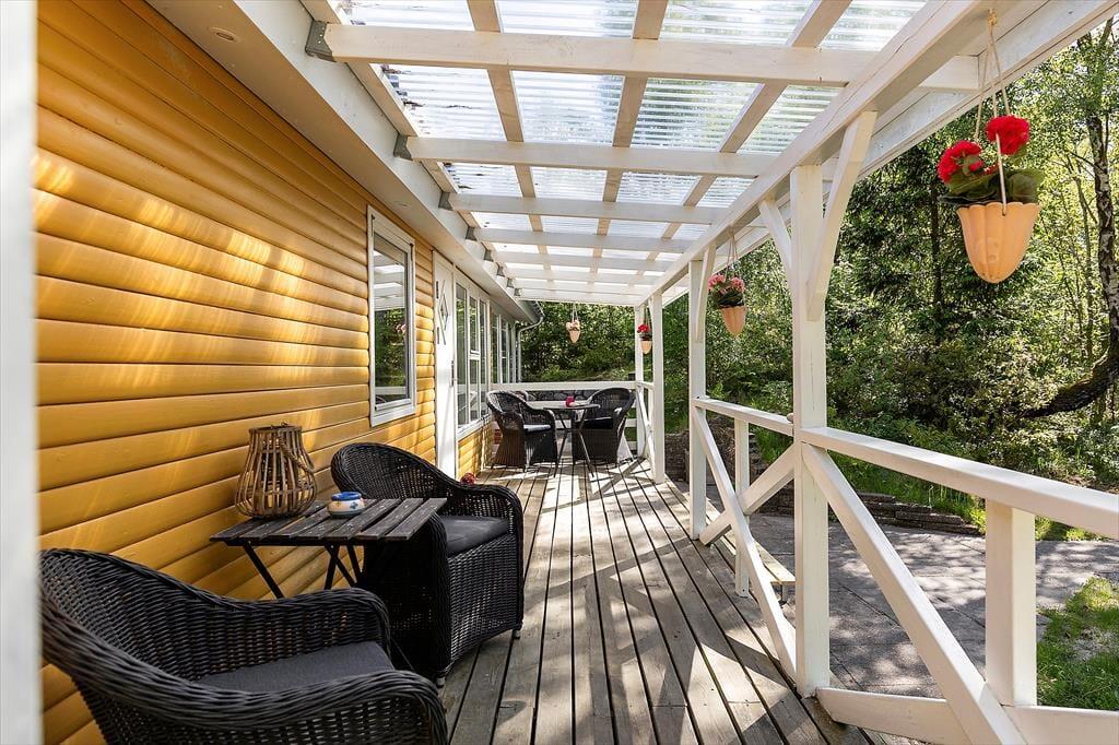 Mod syd ligger en overdækket terrasse, der hurtigt kan blive den foretrukne opholdsplads på lune dage og lyse sommeraftener. Vil I hellere sidde helt ude under åben himmel, kan I finde en solkrog på flisebelægningen, der breder sig rundt om huset – hvis ikke I bare slænger jer på græsset på den 1100 m2 store grund, hvor I er omgivet af høje løvtræer og anden naturskøn bevoksning.
