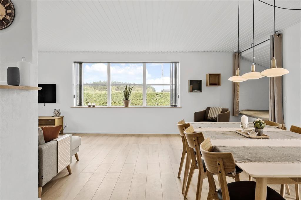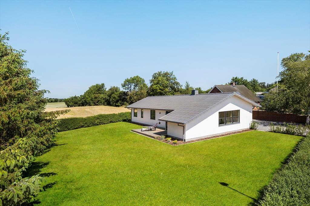 Fra stuen kan I træde lige ud på en vestvendt træterrasse og videre ned på havens gode græsplæne. På den anden side af hækken breder et åbent marklandskab sig, så I har noget kønt at kigge på, mens I slapper af i havestolene eller griller. Øst for sommerhuset kan I også slå jer ned på den store fliseterrasse, og ud mod vejen er der et grusareal til parkering.