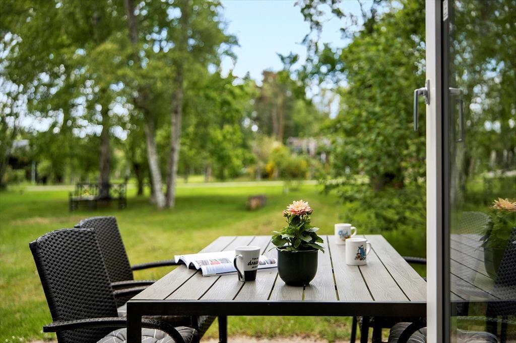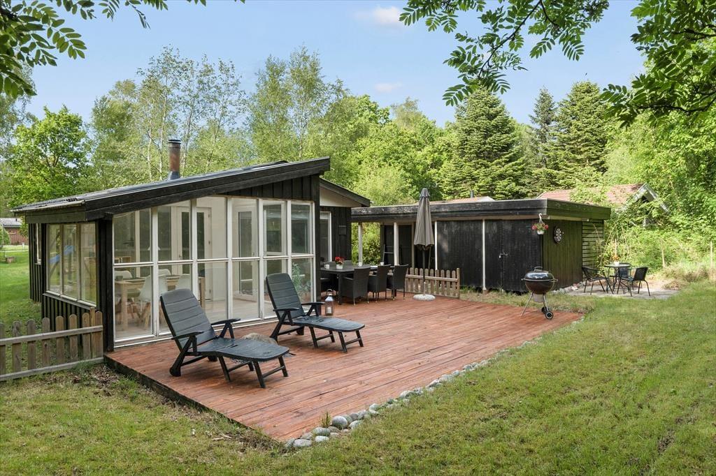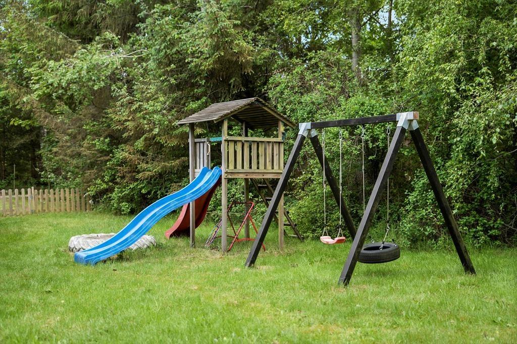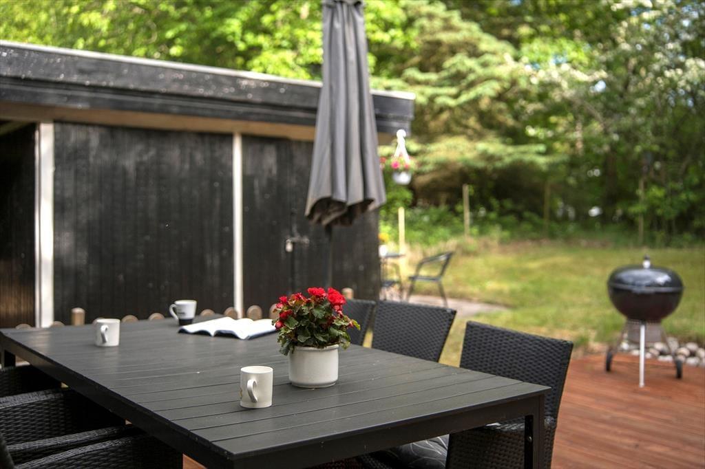 Fra havestuen kan I åbne glasdøren og træde lige ud på den store træterrasse, der er orienteret mod syd på den grønne naturgrund. Skal al driverlivet ikke foregå her, kan I også sætte jer på den anden side af huset, hvor I finder et mindre terrasseområde samt bålsted og legefaciliteter til børnene.