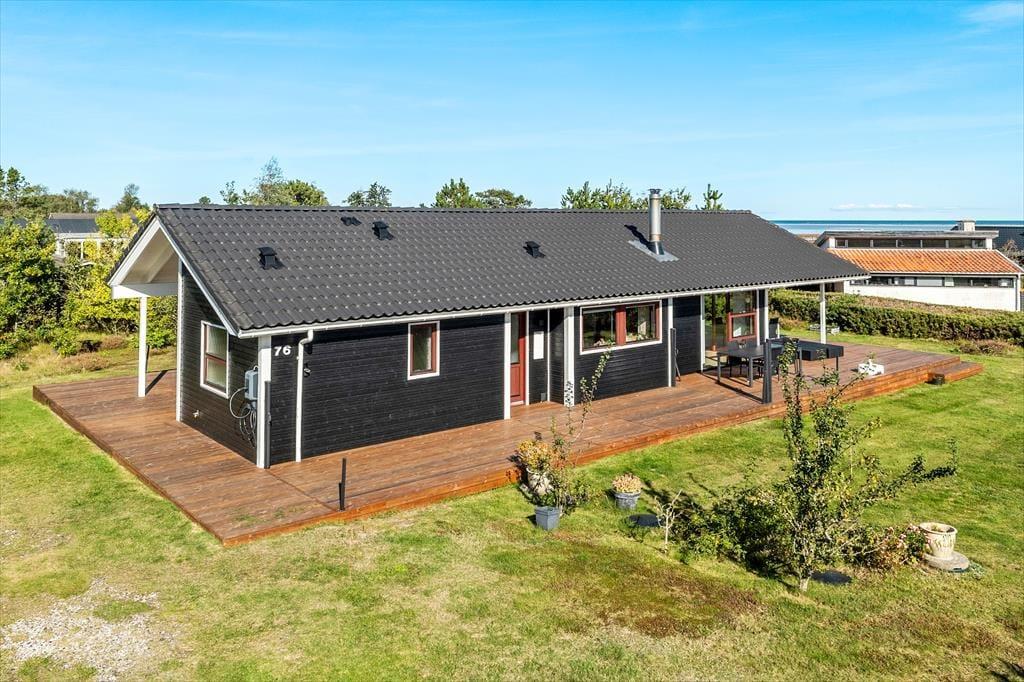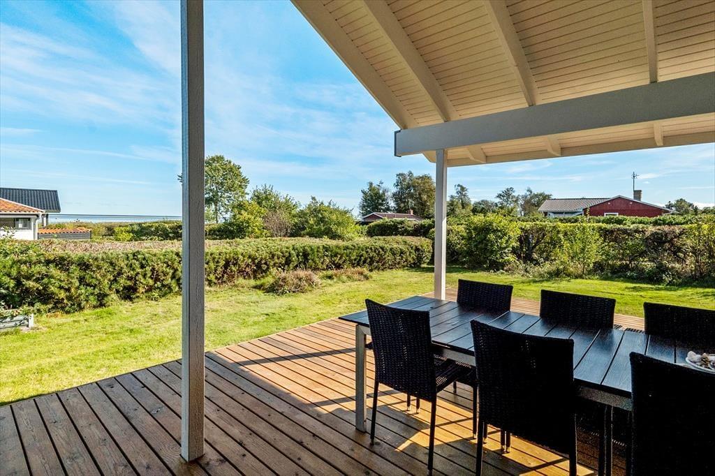 Udenfor venter en stor terrasse, hvor du kan slappe af i komfortable havemøbler og lade blikket vandre ud over havet. Terrassen er det oplagte sted at nyde dagens måltider – måske tilberedt på grillen, mens børnene leger på græsplænen. De børnevenlige faciliteter gør det nemt for hele familien at have en dejlig ferie. På den store naturgrund kan børnene løbe frit rundt og udforske området, mens du nyder roen og den friske luft. Det er også her, I kan samle jer om hyggelige havespil eller bare læne jer tilbage og lytte til fuglenes kvidre og havets beroligende bølgeskvulp. Livet udenfor er en naturlig forlængelse af opholdet indenfor, og du kan nemt tage formiddagskaffen med ud på terrassen eller nyde en stille stund med udsigt til solen, der glitrer i Kattegat.