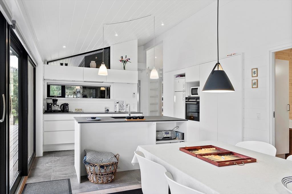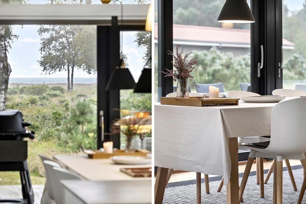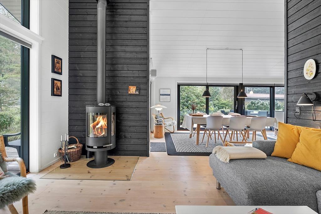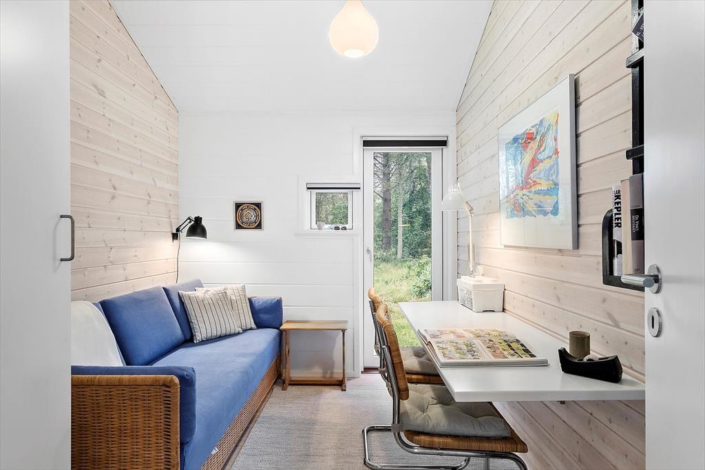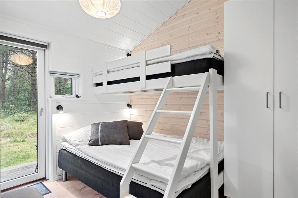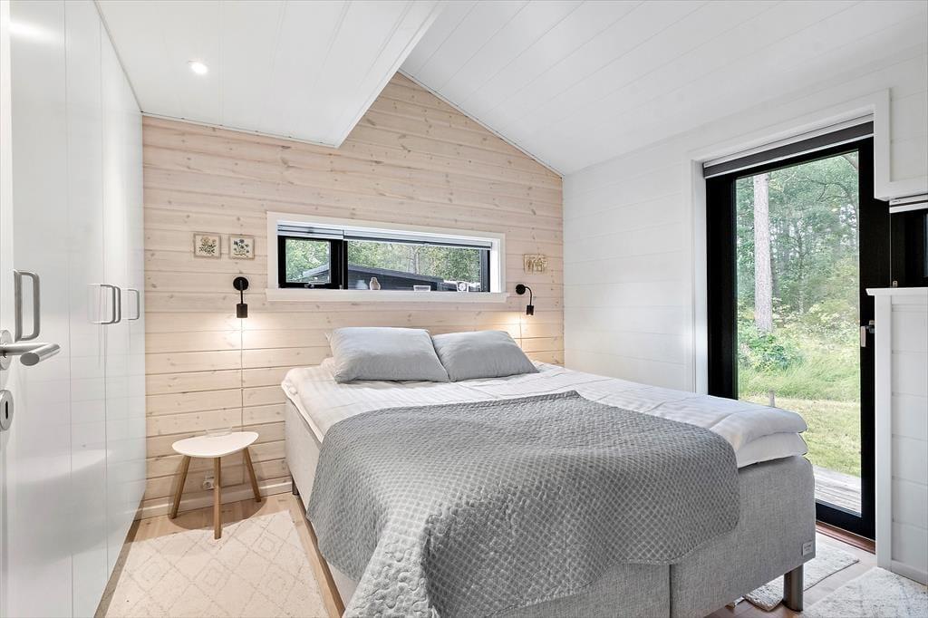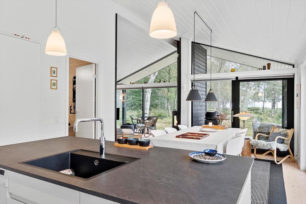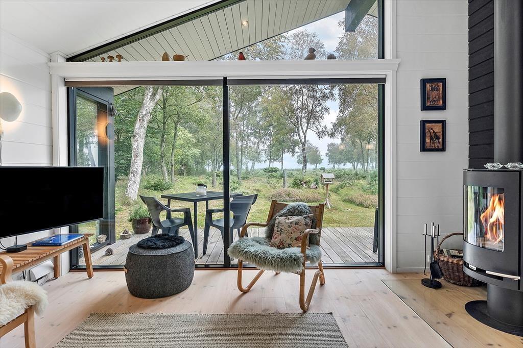 Der er meget godt at sige om det 92 m2 store sommerhus, der er opført i 2018 som et rigtigt kvalitetsbyggeri til fem personer. Alle rum er lyse og indbydende, og det pæne møblement er med til at skabe en skøn atmosfære inden døre. Det allervigtigste er nu næsten husets store, østvendte gavlvinduer, der sørger for, at I kan nyde synet af havet og naturgrundens bevoksning, når I slapper af nær stuens brændeovn eller hygger jer sammen ved spisebordet. Planløsningen i opholdsafdelingen er åben, så også fra det lækre køkken kan I kigge ud på de naturskønne omgivelser, når I skyller salat eller skærer kartofler. Et praktisk bryggers og et brusebadeværelse hører for øvrigt med til planløsningen foruden tre soveværelser, hvor I kan se frem til at sove godt og længe.
