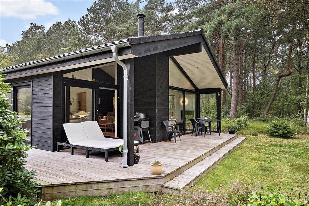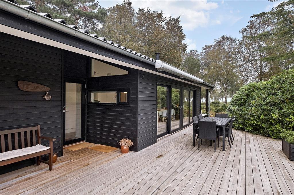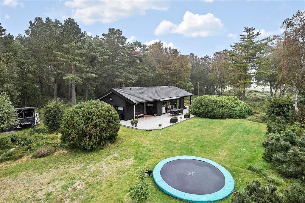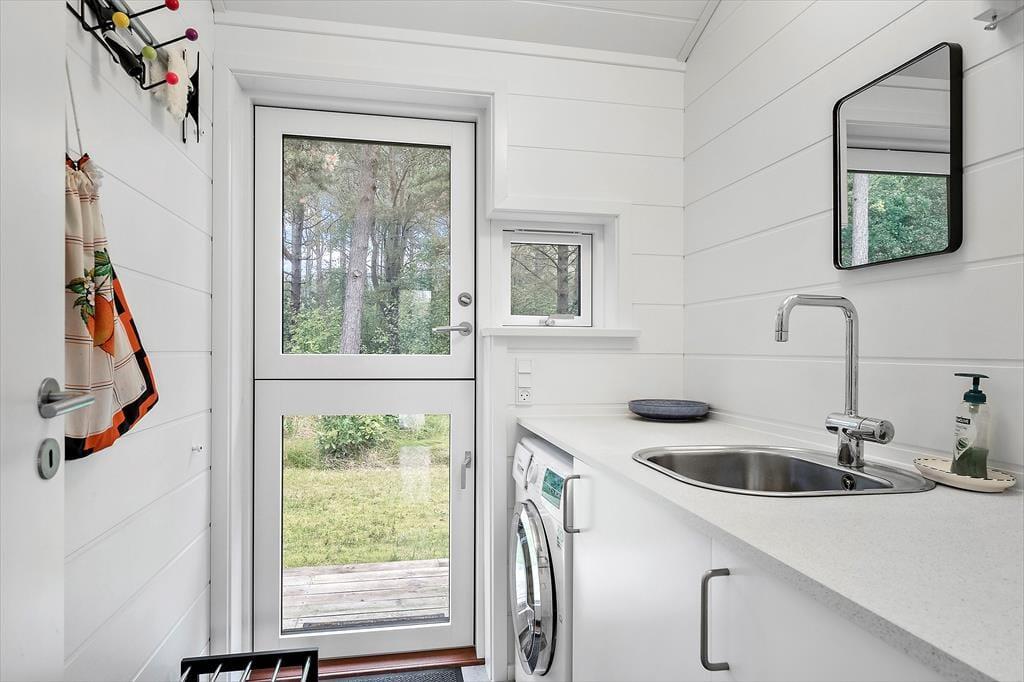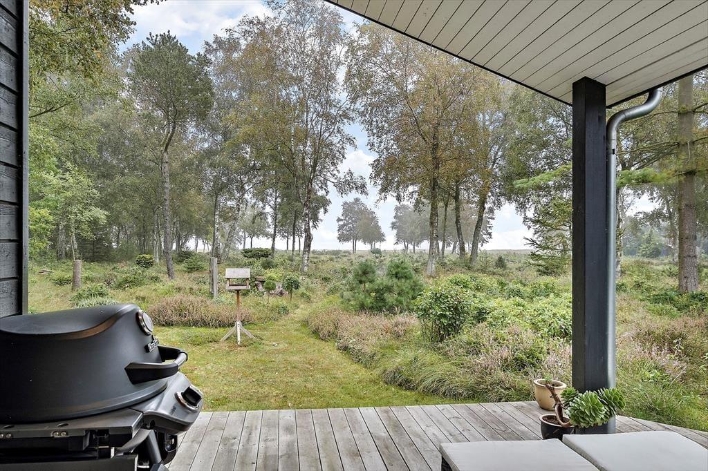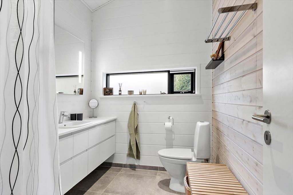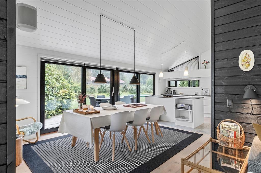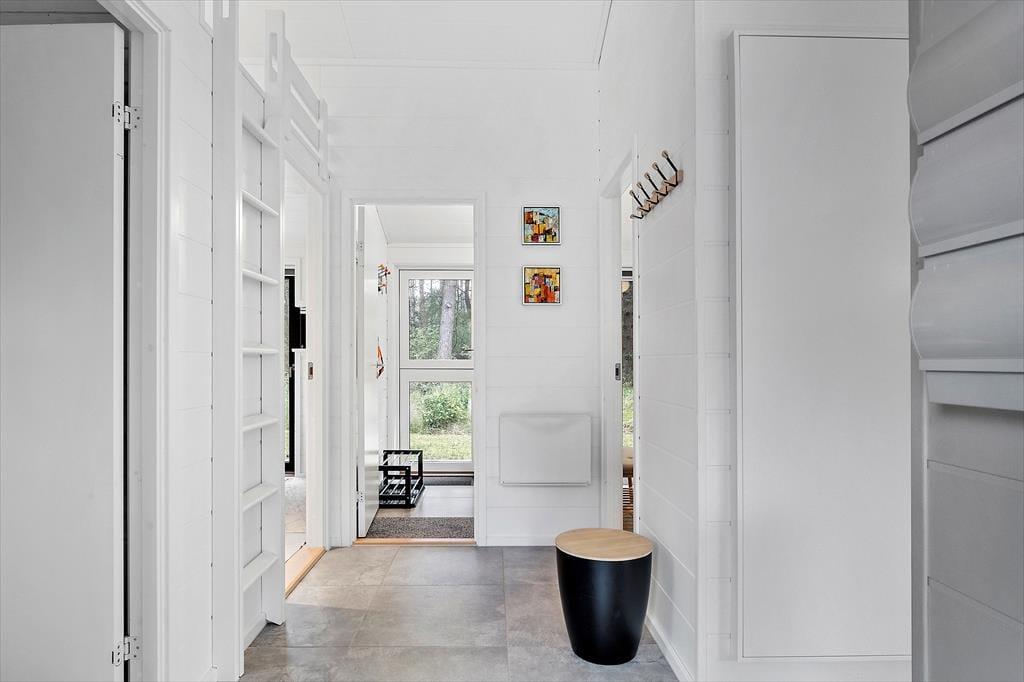 Der er meget godt at sige om det 92 m2 store sommerhus, der er opført i 2018 som et rigtigt kvalitetsbyggeri til fem personer. Alle rum er lyse og indbydende, og det pæne møblement er med til at skabe en skøn atmosfære inden døre. Det allervigtigste er nu næsten husets store, østvendte gavlvinduer, der sørger for, at I kan nyde synet af havet og naturgrundens bevoksning, når I slapper af nær stuens brændeovn eller hygger jer sammen ved spisebordet. Planløsningen i opholdsafdelingen er åben, så også fra det lækre køkken kan I kigge ud på de naturskønne omgivelser, når I skyller salat eller skærer kartofler. Et praktisk bryggers og et brusebadeværelse hører for øvrigt med til planløsningen foruden tre soveværelser, hvor I kan se frem til at sove godt og længe.