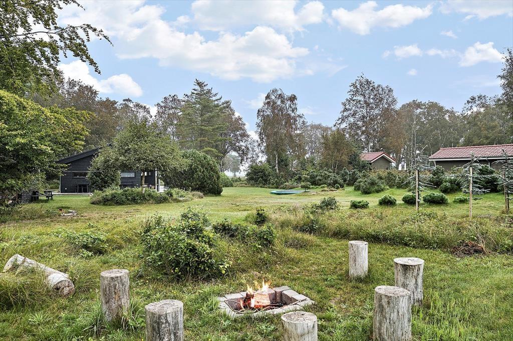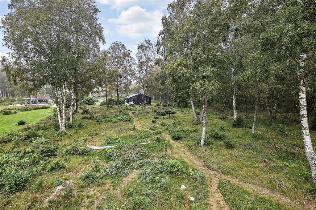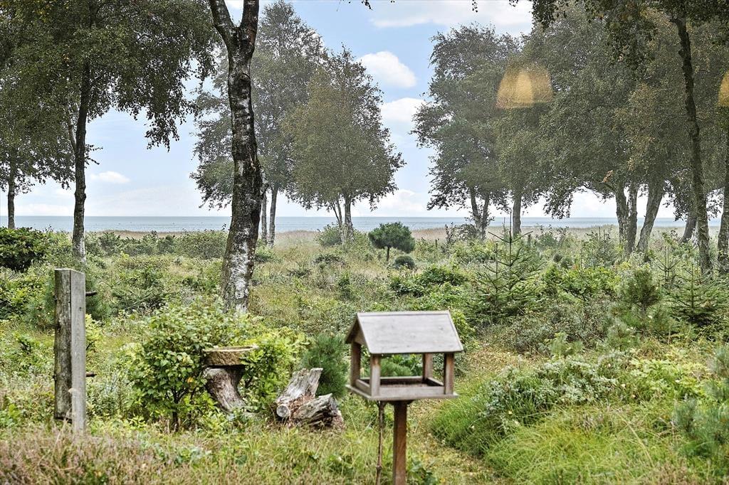 Sommerhuset ligger på en stor og frodig naturgrund med birketræer, en stor rododendron og anden skøn bevoksning. Mellem stammerne kan I se ud på havet, og en sti fører jer direkte ned på strandengen – med mindre I foretrækker at blive på sommerhusets solrige terrasse eller hygge jer ved bålstedet. Græsplænen nær huset indbyder til leg og havespil, og så er der for øvrigt en udendørs bruser på grunden, hvis I får lyst til at skylle jer under åben himmel.