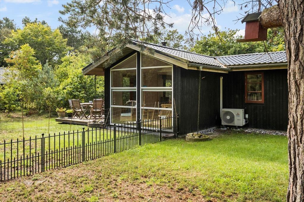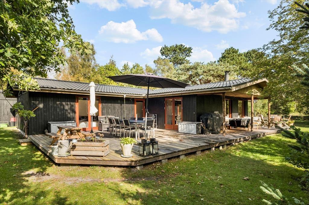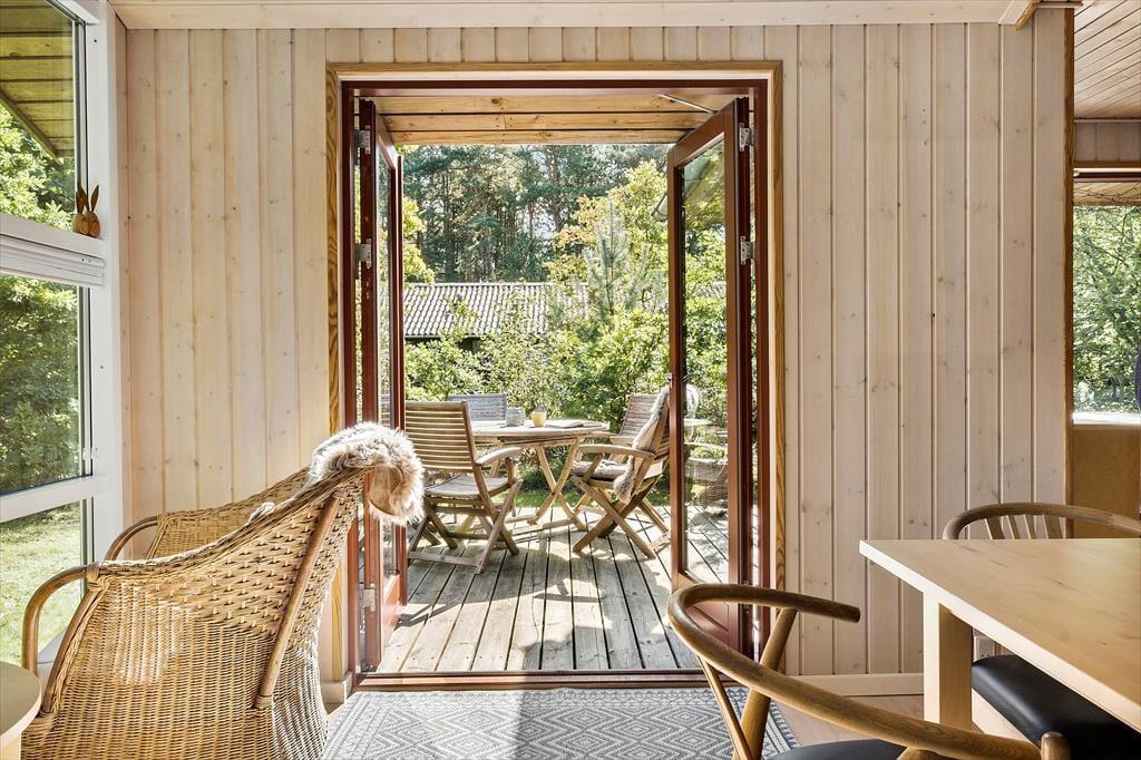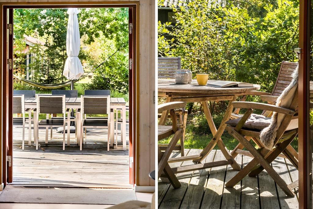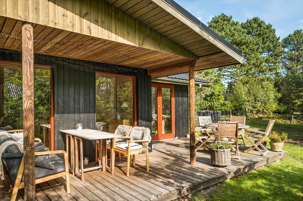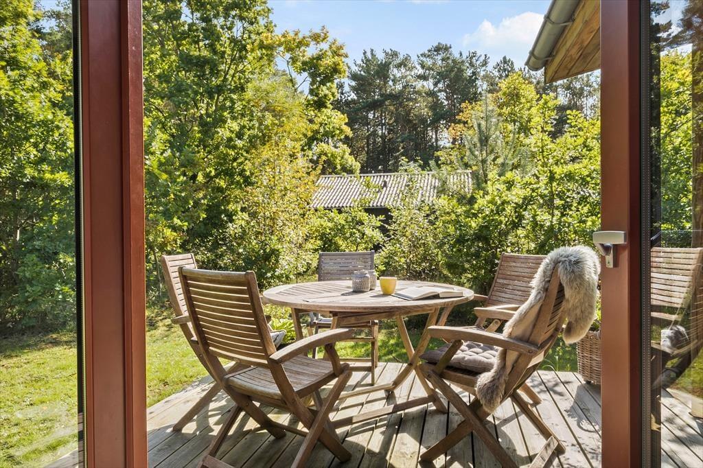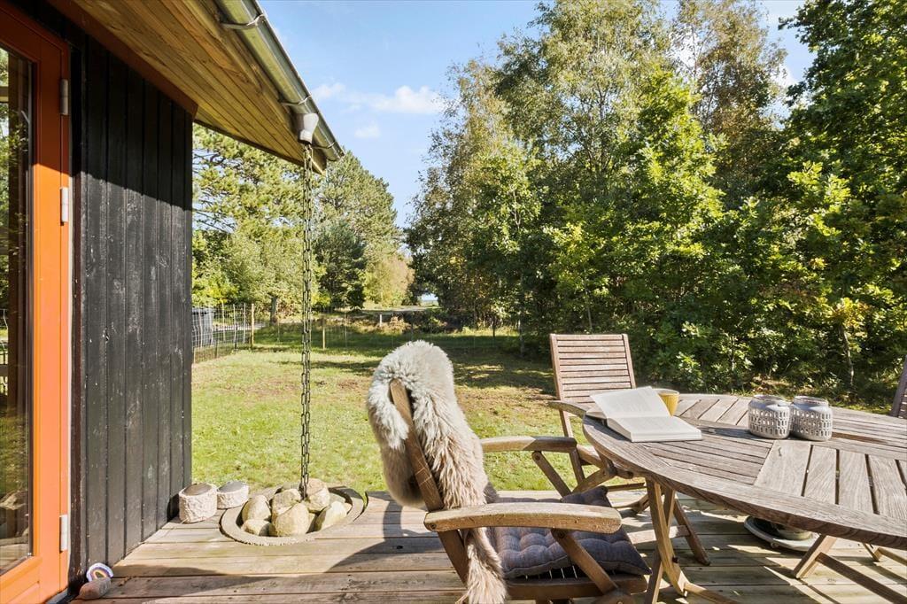 Fra stuen og to af soveværelserne har I direkte adgang til det store og skønne terrassemiljø, der breder sig syd for sommerhuset. Her får I glæde af solen det meste af dagen, og der er også et overdækket areal, hvor I kan rykke ind, hvis en lille byge skulle passere over Helberskov. Baghaven er for øvrigt aflukket, så hunde kan gå frit, og foran huset er der god plads til at parkere.