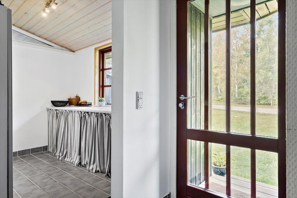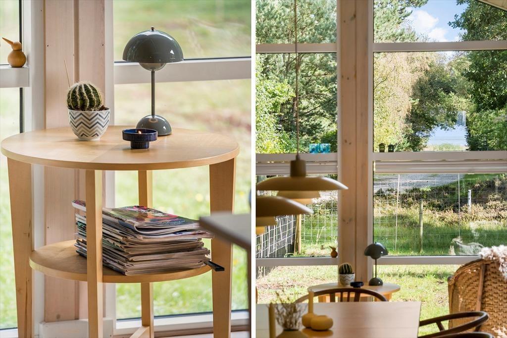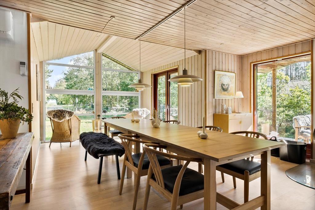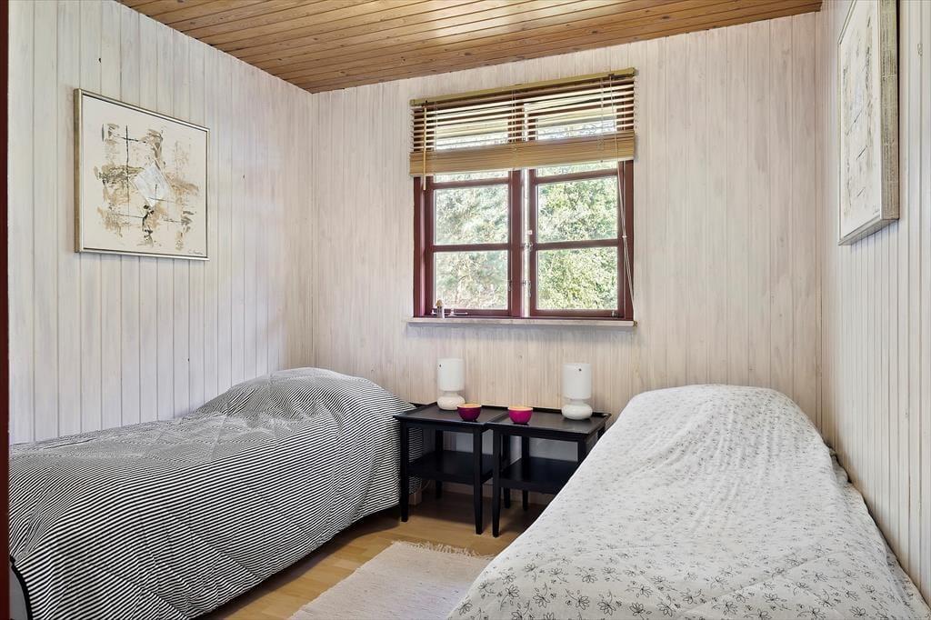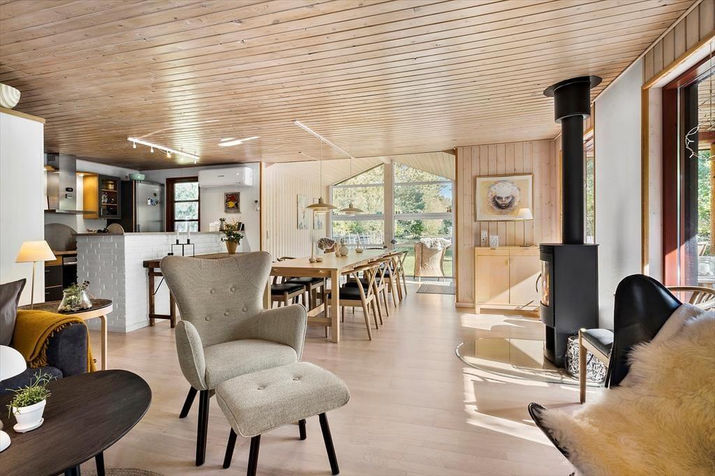 Det 114 m2 store sommerhuset ligger bare 300 meter fra strandengen i Helberskov, og fra stuen kan I se ned for enden af vejen, hvor havet viser sig i åbningen mellem træerne. Stuens høje vinduer sørger samtidig for et godt lysindfald, og både brændeovnen og det pæne møblement bidrager til den rare atmosfære. Et veludstyret køkken er integreret med stuen, mens tre soveværelser, to badeværelser og et bryggers udgør resten af planløsningen. Det ene badeværelse ligger privat i forlængelse af det største soveværelse, mens det andet er praktisk placeret ved entréen.