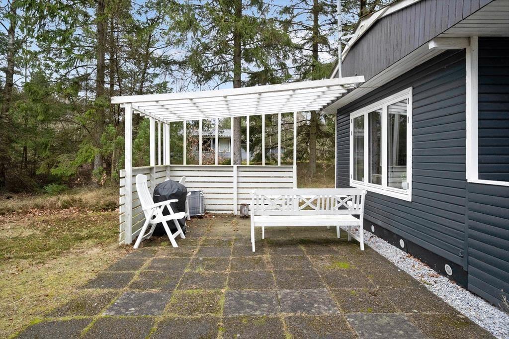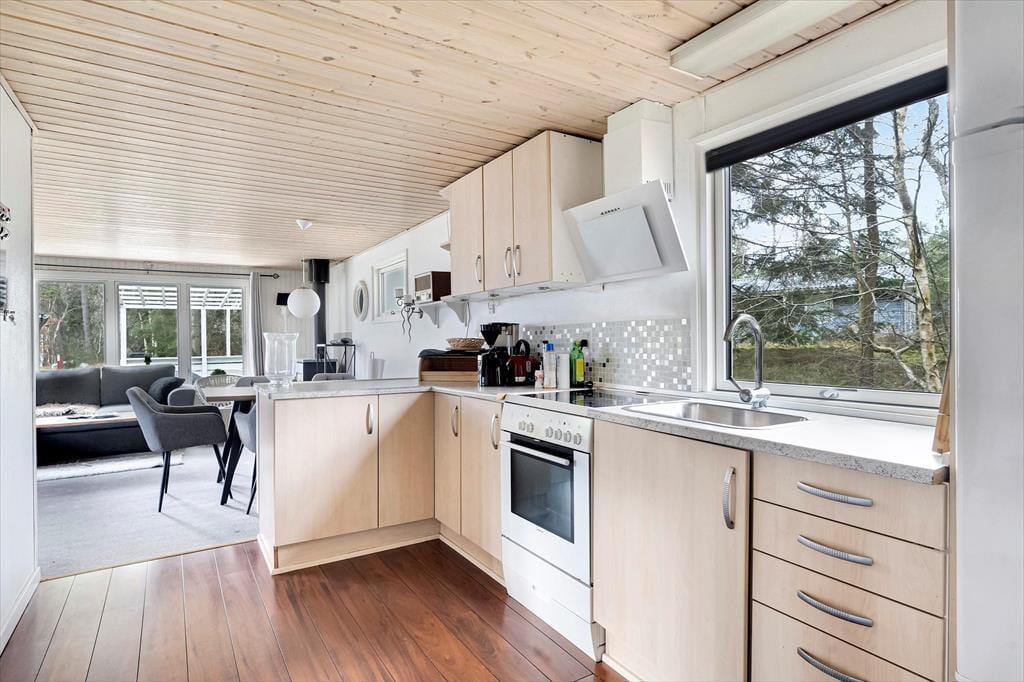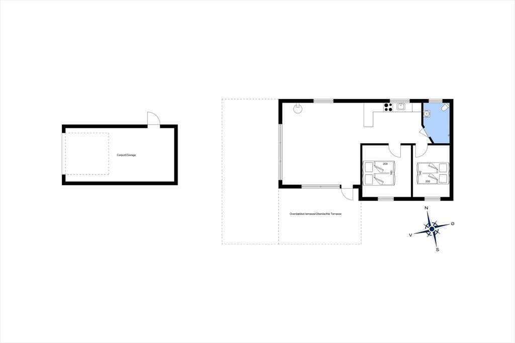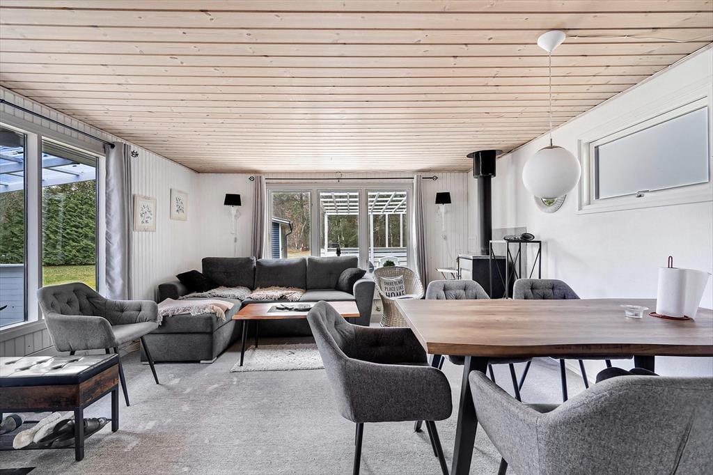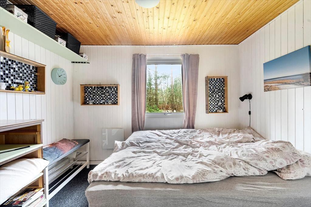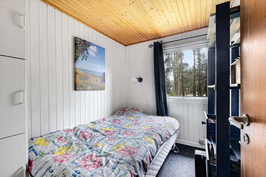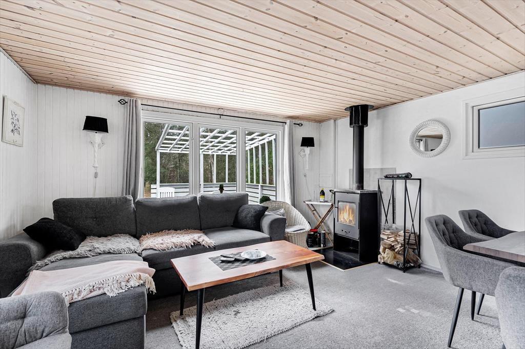 Sommerhusets 50 m2 er godt udnyttet, så det er muligt at samles fire personer til en dejlig og afslappende ferie. På begge soveværelser er der dobbeltseng, mens badeværelset er med bruser, og i køkkenet har I alt det nødvendige for at lave noget lækkert til morgenmad og dagens øvrige måltider. Har I mest af alt lyst til at blive i stuen til en hyggedag inden døre, kan I tænde op i brændeovnen og finde bøger, brætspil og strikketøj frem fra jeres bagage. På væggen hænger et fladskærms-tv, hvis I trænger til underholdning – og hvis I alligevel får lyst til lidt frisk luft, kan I åbne døren og smutte direkte ud på terrassen.