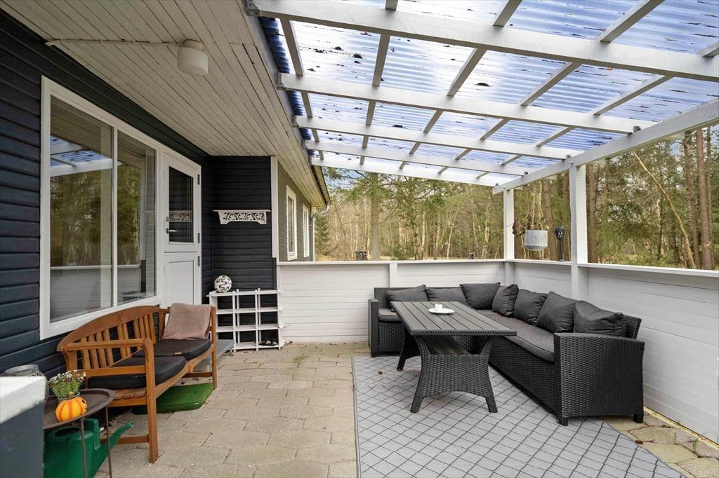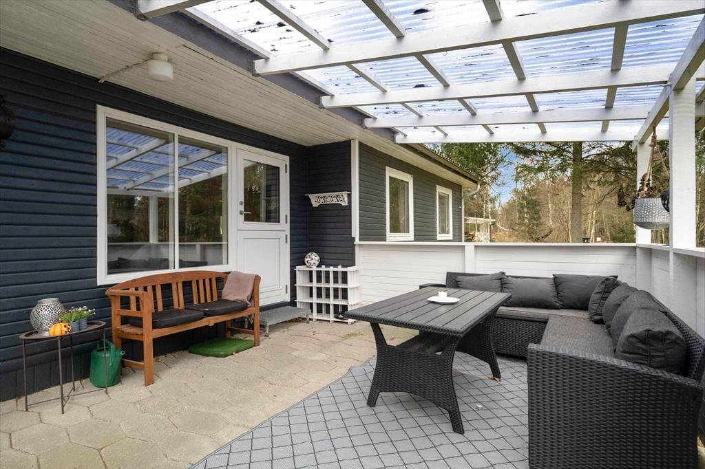Fra stuen har I direkte adgang til en overdækket terrasse med loungemøbler og delvis afskærmning. Foretrækker I at sidde under åben himmel, er der selvfølgelig også mulighed for det, og I har tilmed god plads til at slænge jer på et tæppe eller spille havespil på græsplænen.