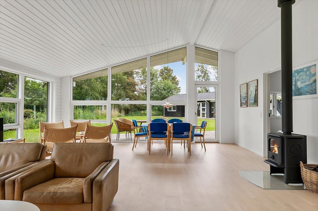 Da sommerhuset blev opført i 2015, blev det selvfølgelig udstyret med store glaspartier i stuen, så du kan mærke nærheden til naturen og få glæde af det smukke sollys – selv på de dage, hvor du har mest lyst til at hygge inden døre. Hvis du kan løsrive blikket fra Kattegat, er der fladskærms-tv i stuen, og en brændeovn står klar til at sprede både varme og hygge, når vejret indbyder til det. Et veludstyret køkken ligger i åben forbindelse med stuen, og ikke bare her, men også på badeværelset og de to soveværelser er indretningen lys og let, så rummene emmer af sommerlig feriestemning.