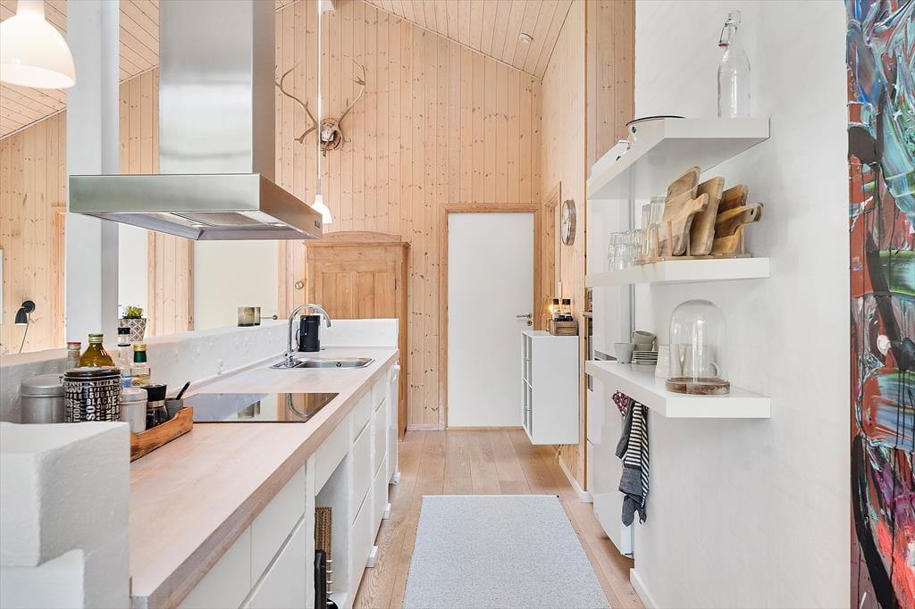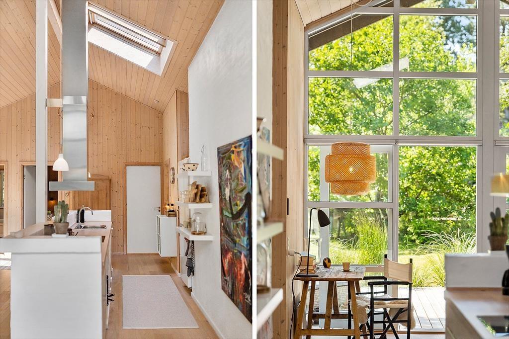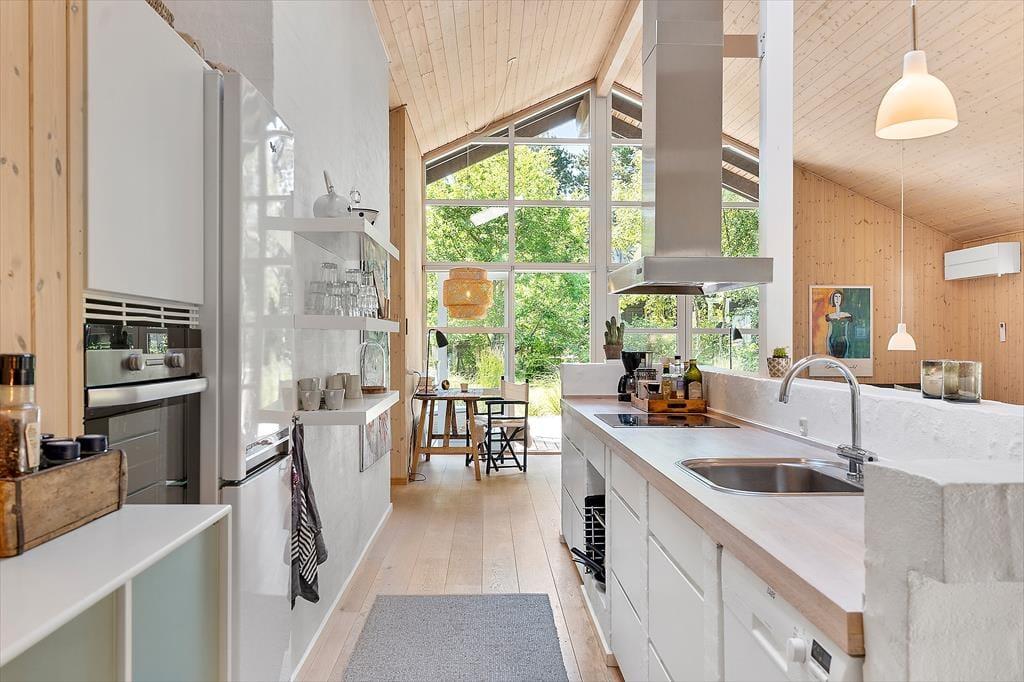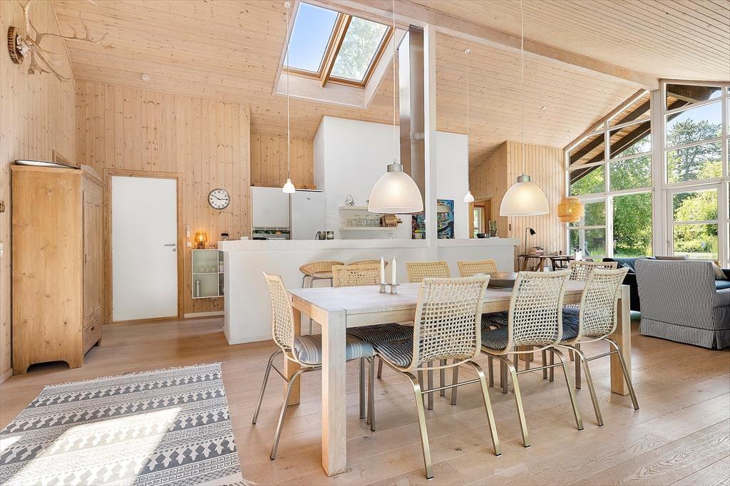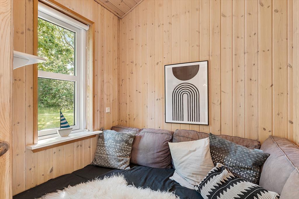 Indendørs møder du en dejlig og lys sommerhusstemning – præcis som man ønsker sig det, når ferien skal bruges på afslapning og kvalitetstid. Indretningen er hyggelig og smagfuld med lette farver og små personlige detaljer, der giver huset sjæl og varme. Loftet er ført til kip, hvilket giver en rummelig og luftig fornemmelse i opholdsrummet, og lysindfaldet gør, at det altid føles rart at være inden døre – også når det regner udenfor, og I har fundet brætspillene frem. Stuen ligger i åben forbindelse med køkkenet, så uanset om der skal laves morgenmad eller hygges med eftermiddagskaffe, kan hele familien være sammen om det. Sommerhuset har god plads til seks personer, og der er gode muligheder for at finde sig en hyggelig krog – måske med en bog eller lidt feriesløv strikning? Det er den slags feriestemning, der er let at falde ind i, når rammerne er så rare som her.