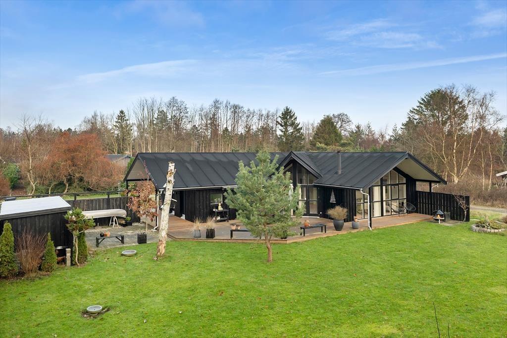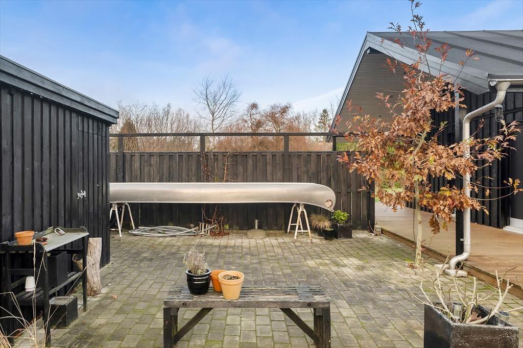 Terrassen er et kapitel for sig og smyger sig næsten hele vejen rundt om sommerhuset, så du kan følge solen fra morgen til aften. Her er der rig mulighed for at finde en lækrog eller et solspot, alt efter humør og vejr. Start dagen med morgenmad under åben himmel, mens duggen stadig ligger i græsset, og slut den af med aftensmad og lange sommeraftener, hvor himlen langsomt skifter farve. Terrassen fungerer som en naturlig forlængelse af opholdsrummene og gør det nemt at veksle mellem inde og ude. Haven og de rolige omgivelser giver plads til både leg, afslapning og små pauser med en god kop kaffe, mens hunden snuser rundt og nyder ferien lige så meget som jer.