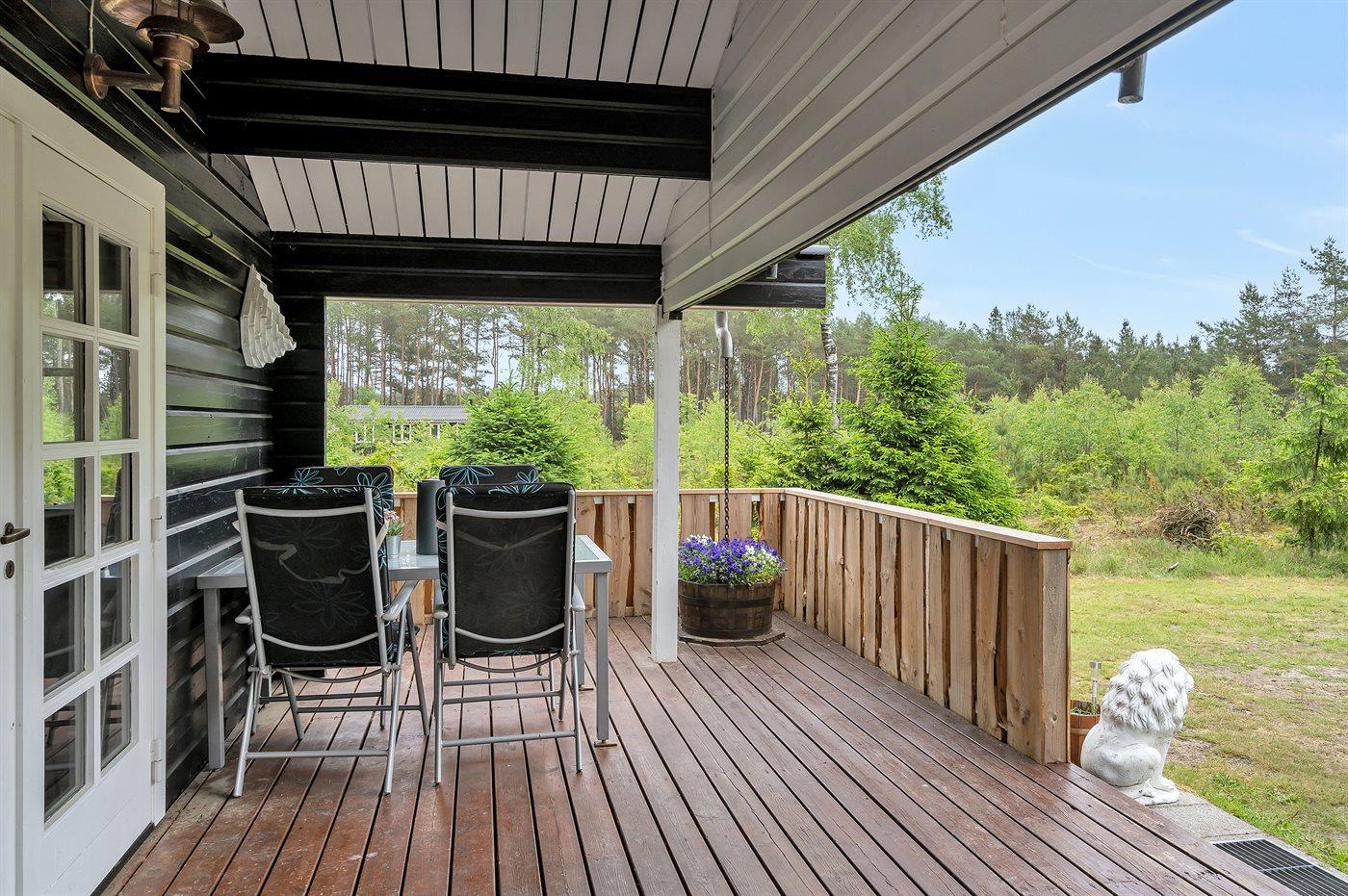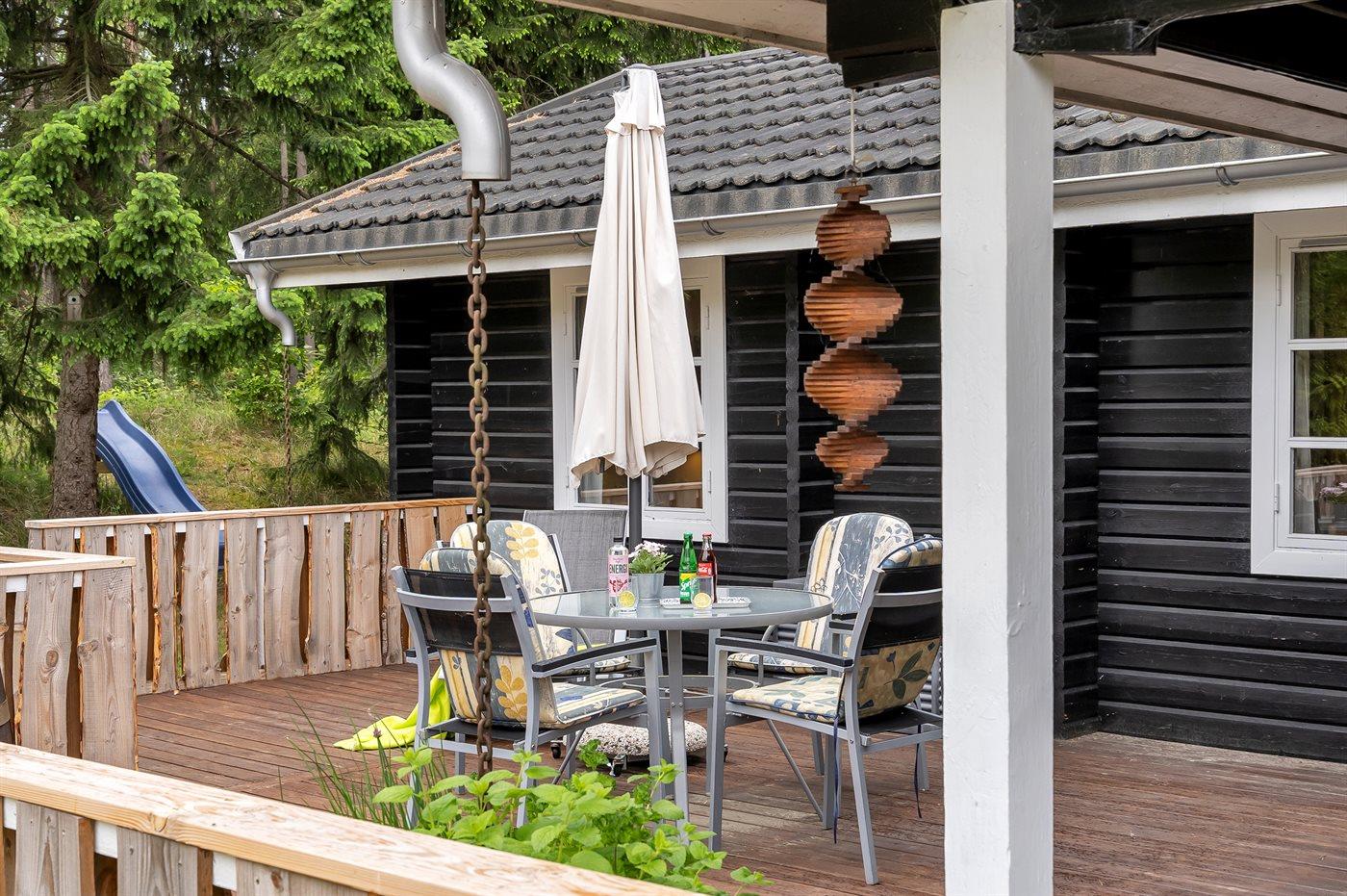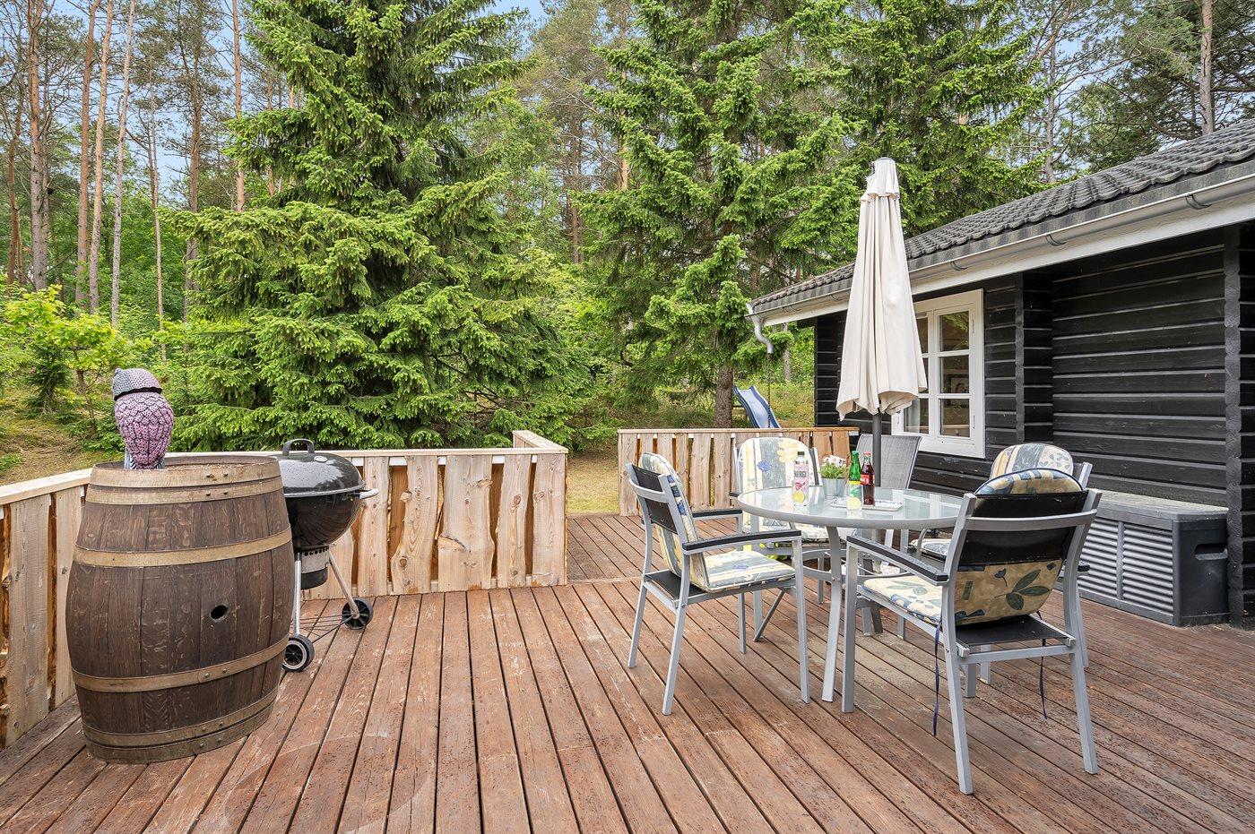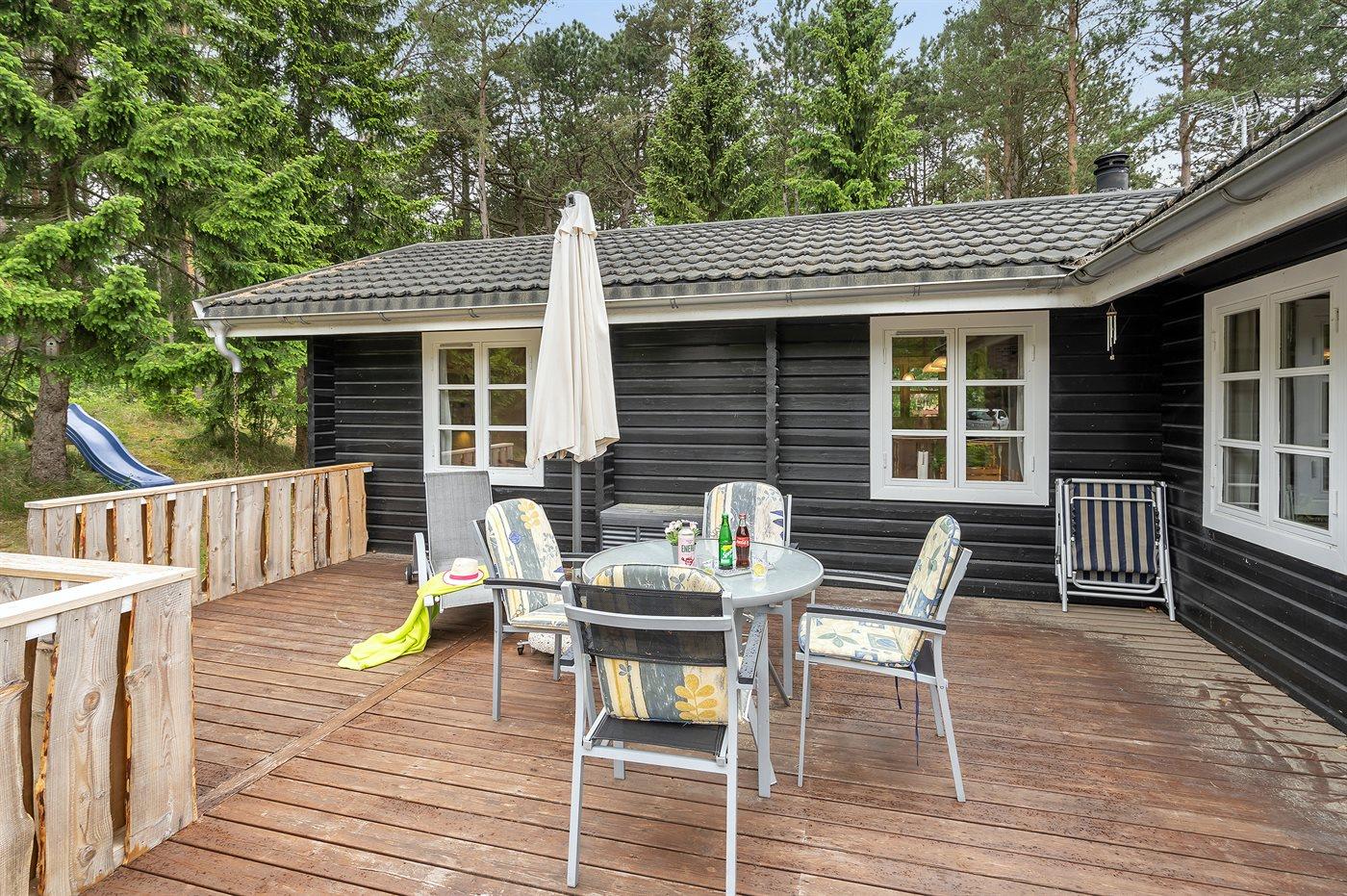 Udendørs kan I slappe af på den 60 m² store terrasse eller den 20 m² overdækkede terrasse, som bidrager til at de dejlige sommeraftener kan forlænges med flere timer. Den næsten 5000 m² store naturgrund giver masser af plads til leg og udeliv med gynge, rutchebane og sandkasse til de mindste. Havet ligger blot 1200 meter væk, perfekt til en frisk gåtur gennem naturen.