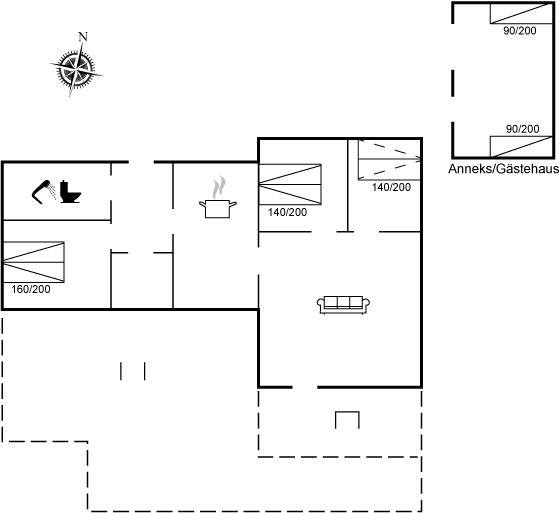 Indenfor byder huset på et funktionelt køkken med keramiske kogeplader, varmluftovn, mikrobølgeovn og opvaskemaskine. Der er 4 soveværelser, hvoraf det ene ligger i det hyggelige anneks. Sovepladserne fordeler sig på 2 dobbeltsenge, 1 dobbelt sovesofa og 2 enkeltsenge i annekset. Derudover findes både barneseng og barnestol.