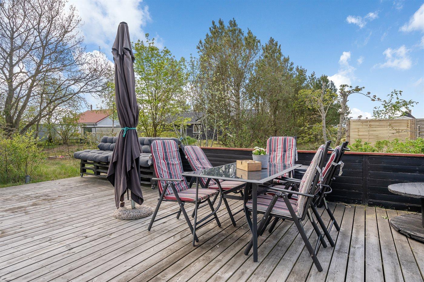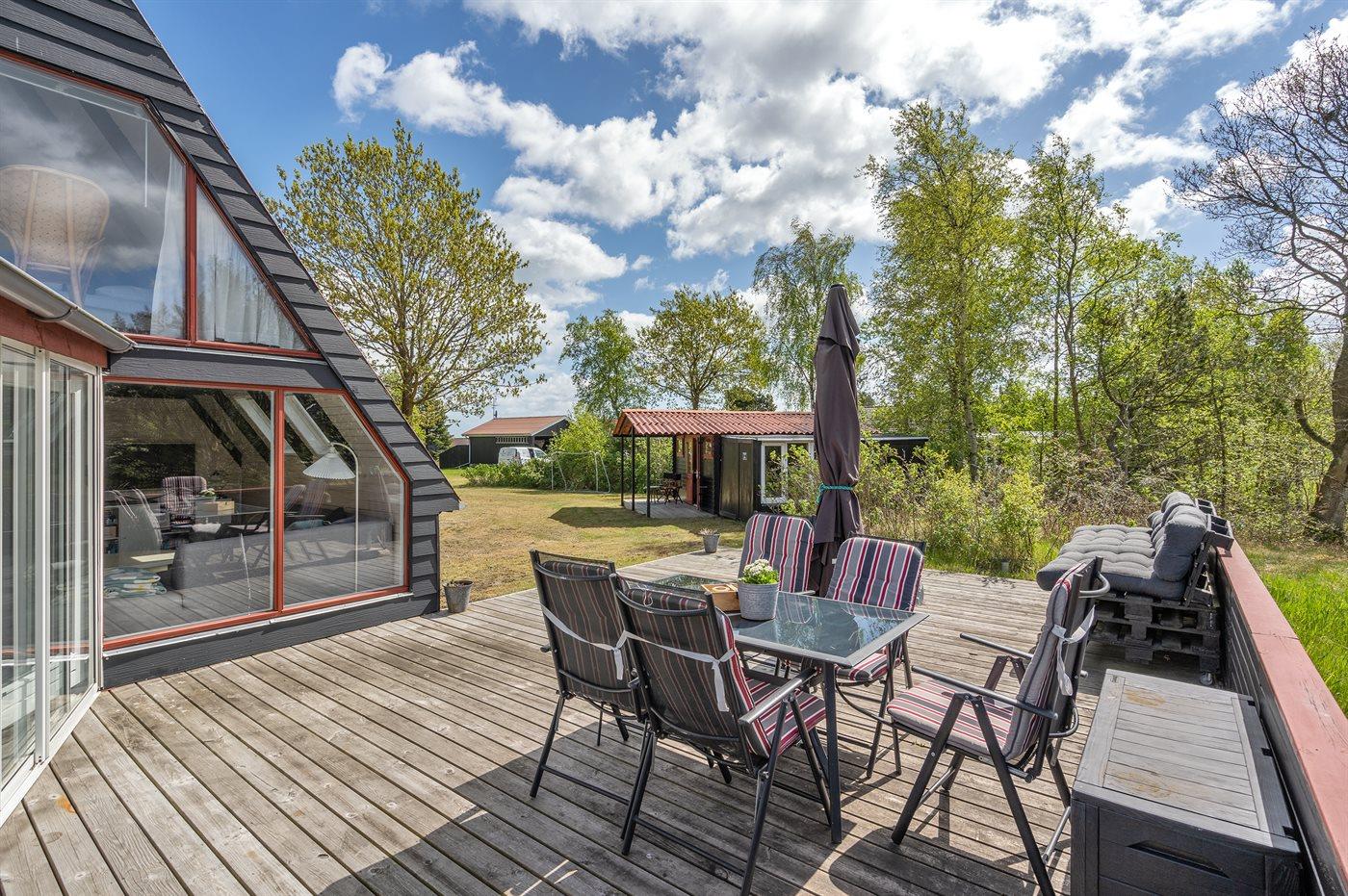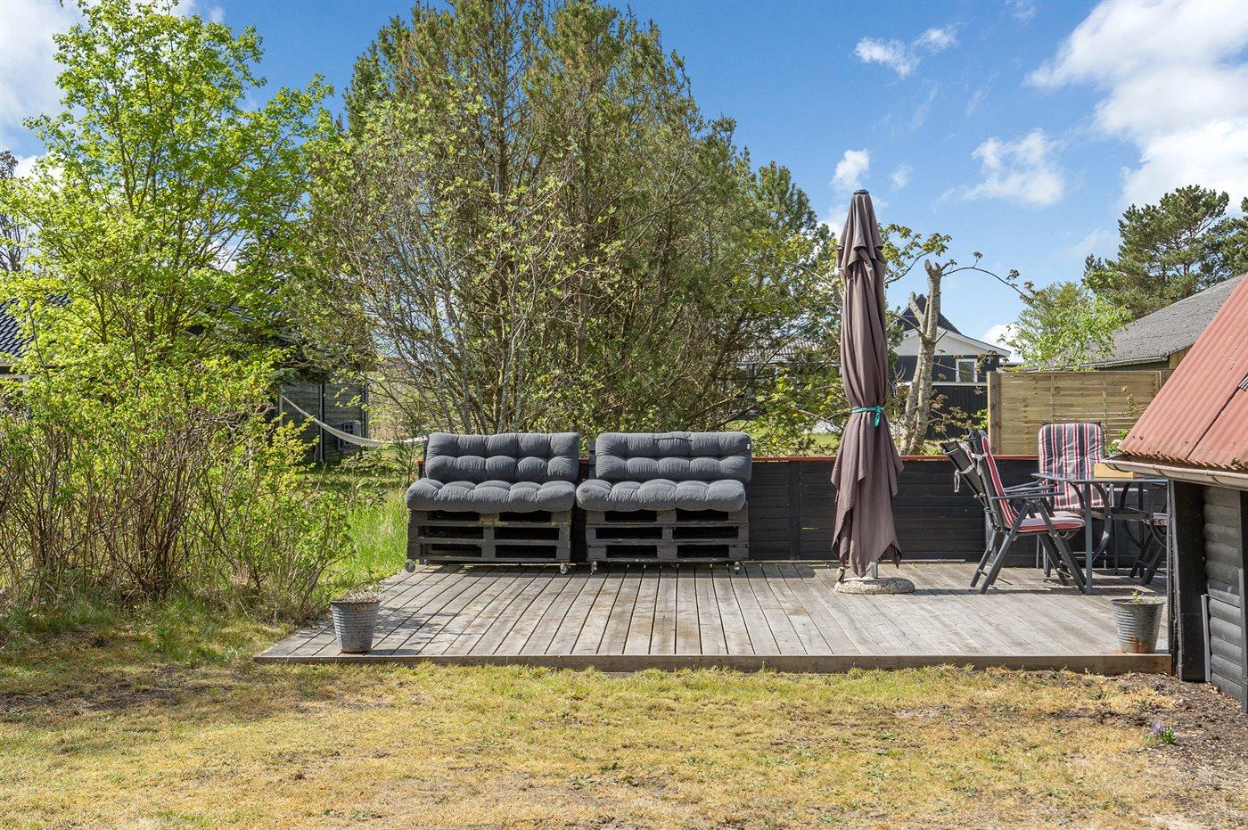 Ferieboligen er beliggende på en 1114 m² stor havegrund. Der er 200 m til havet. Der er 4500 m til fjorden. Nærmeste forretning er beliggende i en afstand af 1500 m. Der er en golfbane i en afstand af 13700 m. Til ferieboligen hører åbent terrasseareal. Desuden er der overdækket terrasse. Grill til rådighed. Parkering ved ferieboligen.