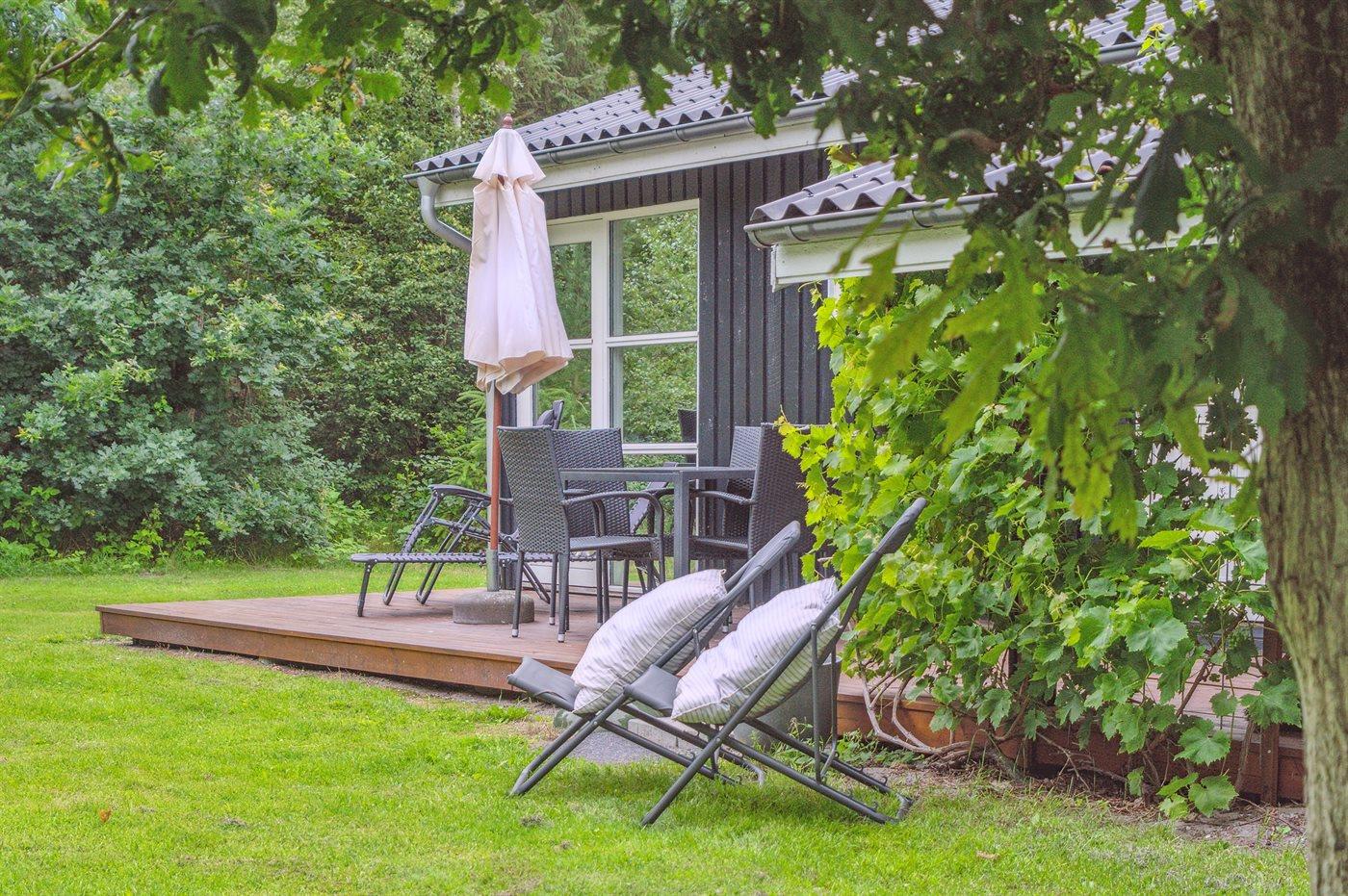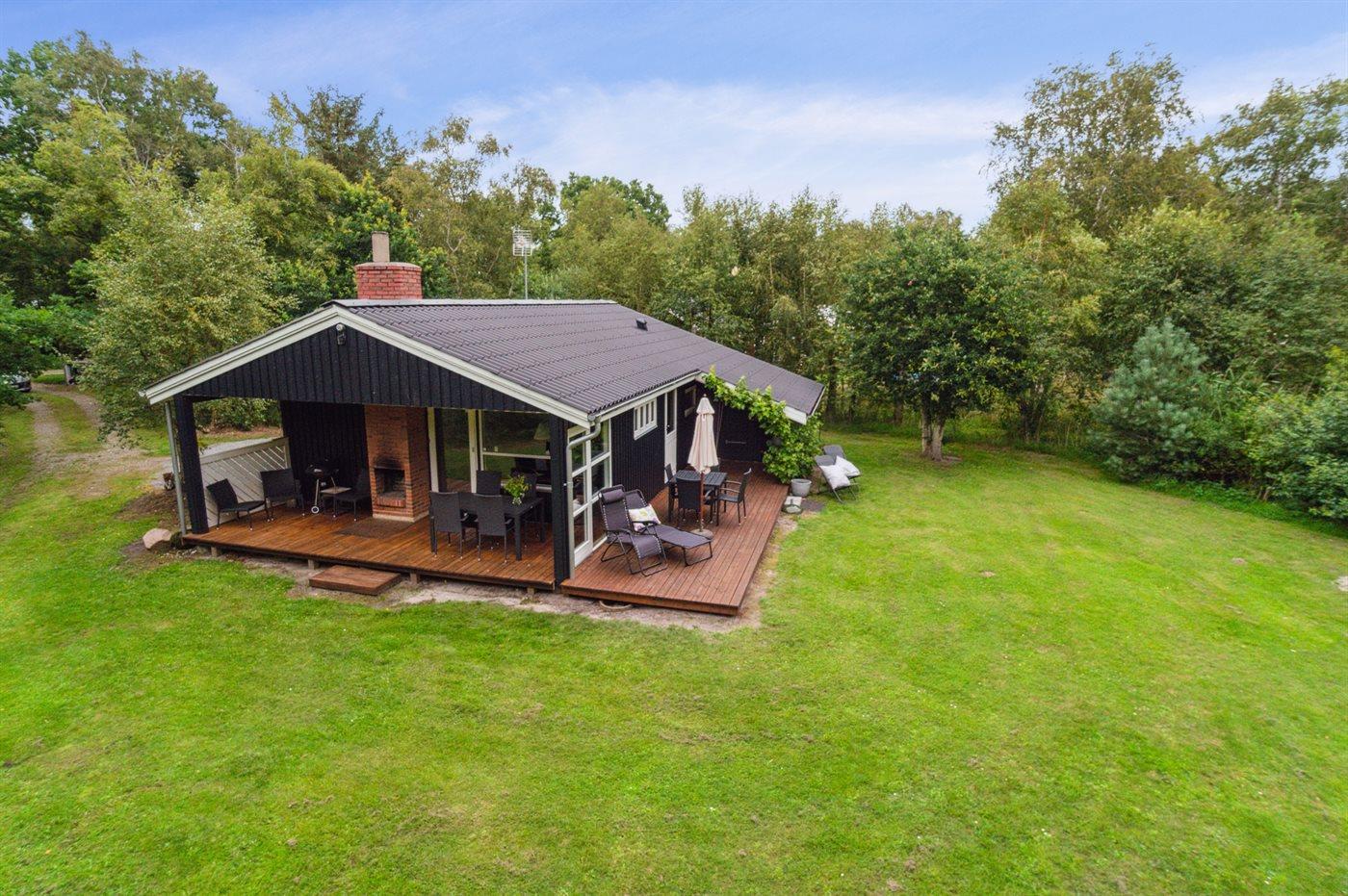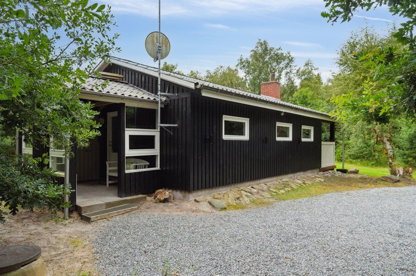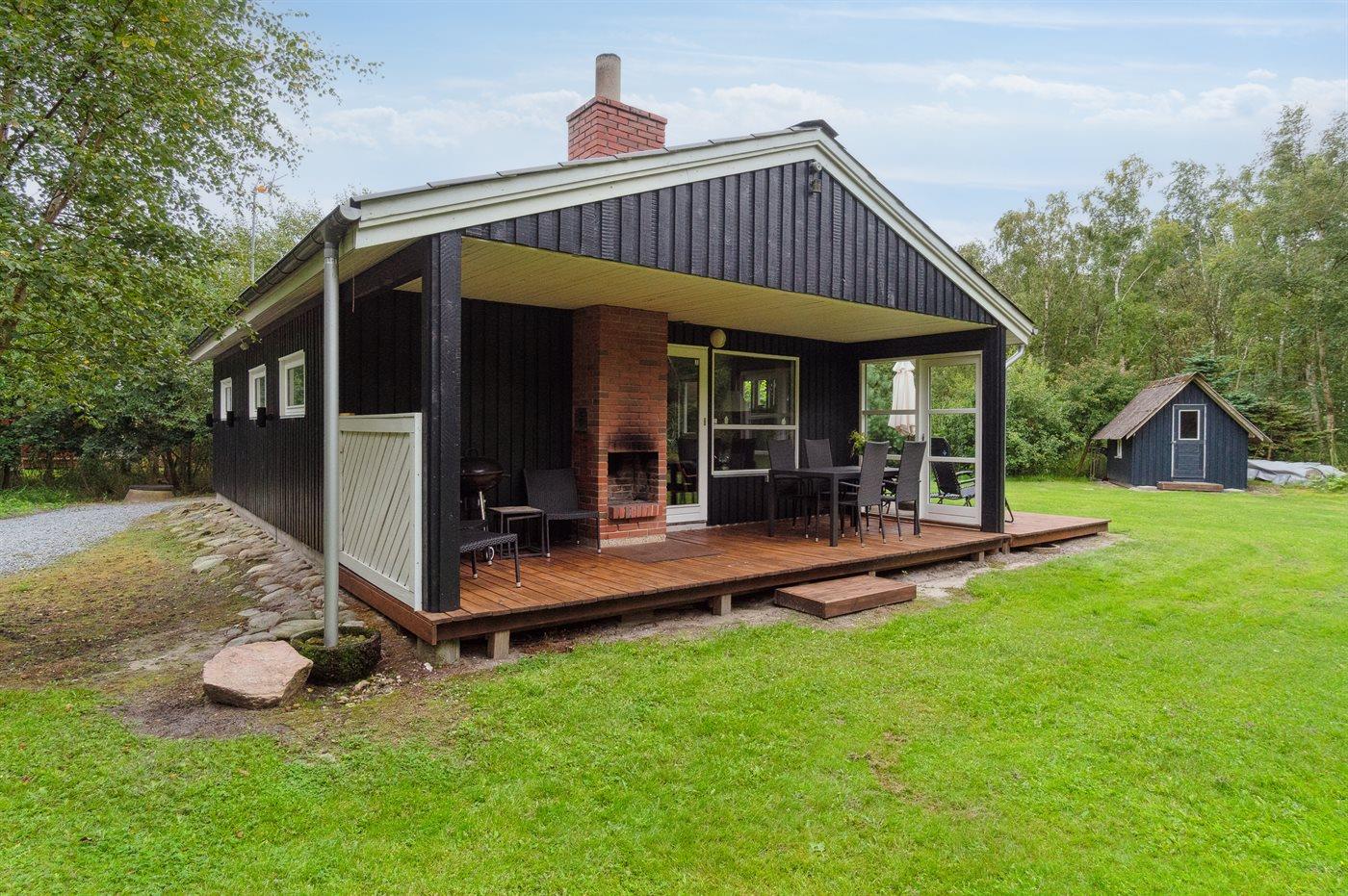 Tæt ved havet inde i skoven ligger dette hyggelige sommerhus på en dejlige, ugenert grund. I de lidt kølige sommeraftener kan du tænde op i den udendørs pejs, som står på en af de 2 overdækkede terrasser. Der er altid plads til leg og spil i haven, imens du gør klar til at grille på terrassen.