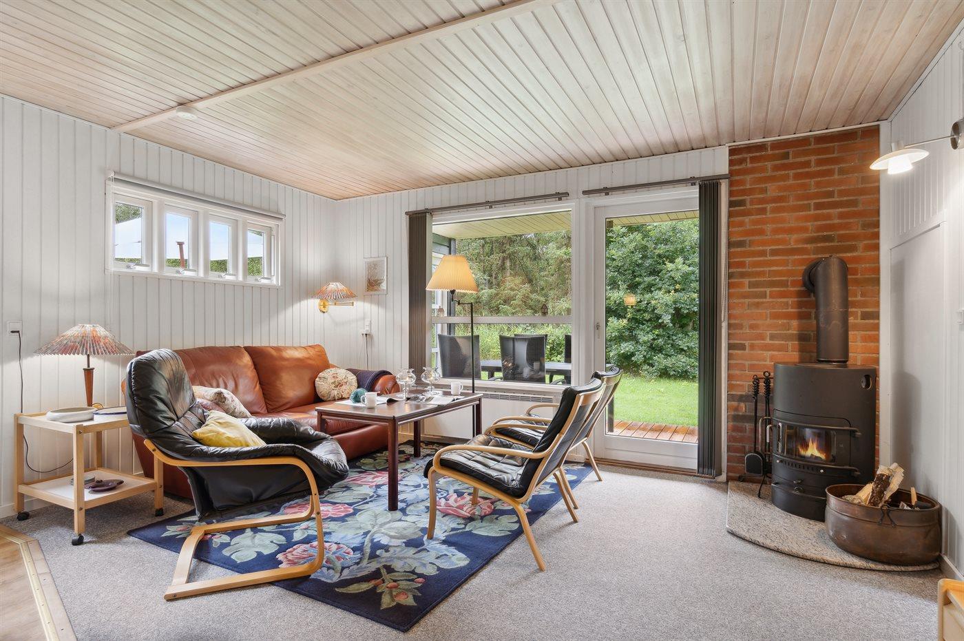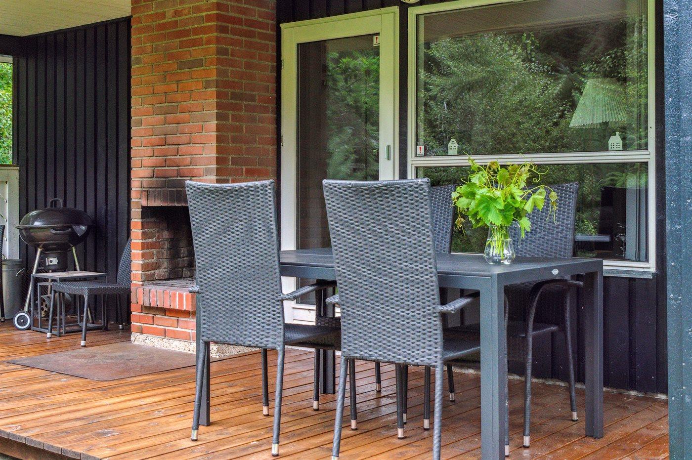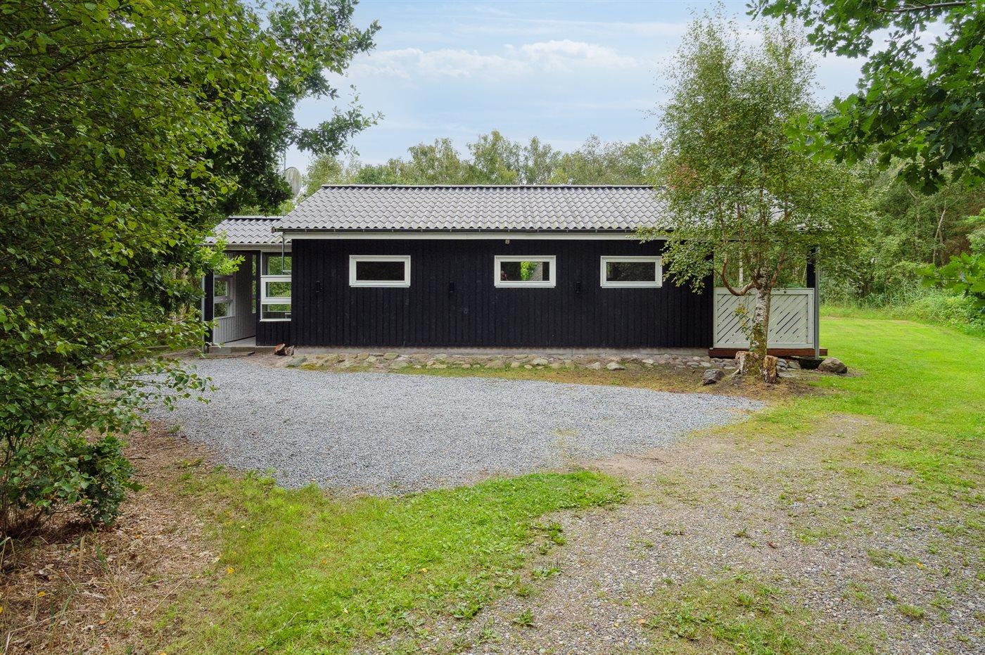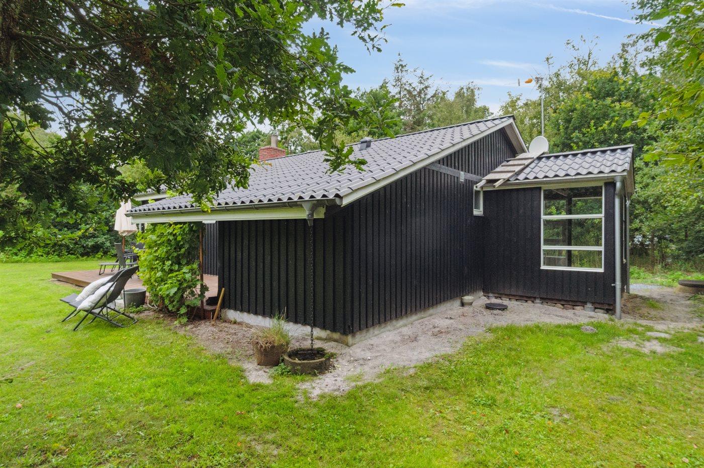 Tæt ved havet inde i skoven ligger dette hyggelige sommerhus på en dejlige, ugenert grund. I de lidt kølige sommeraftener kan du tænde op i den udendørs pejs, som står på en af de 2 overdækkede terrasser. Der er altid plads til leg og spil i haven, imens du gør klar til at grille på terrassen.