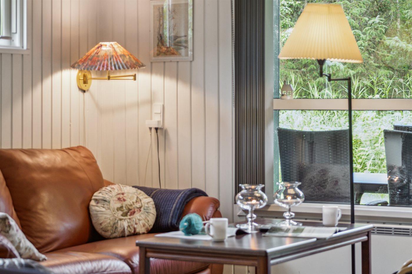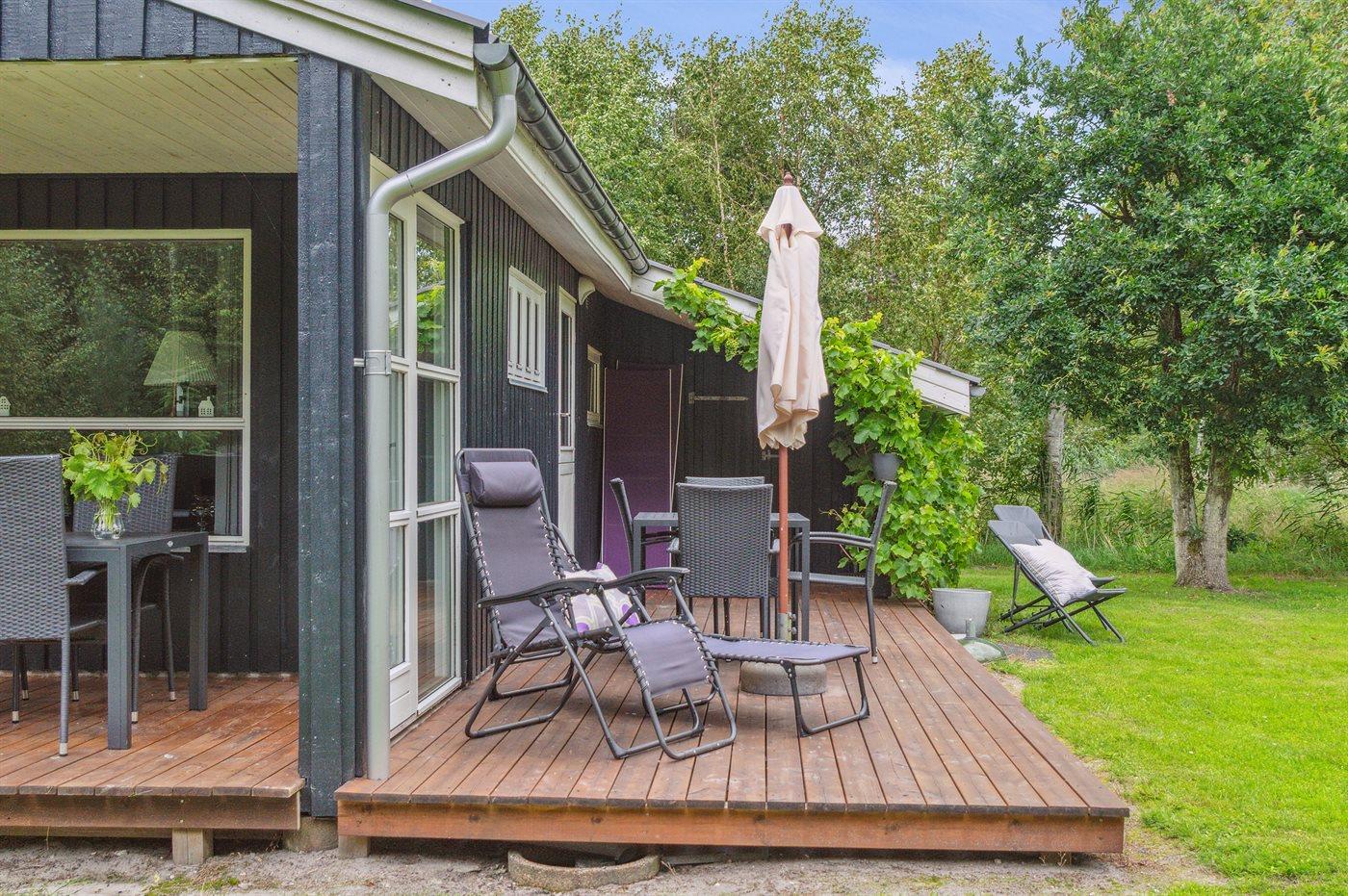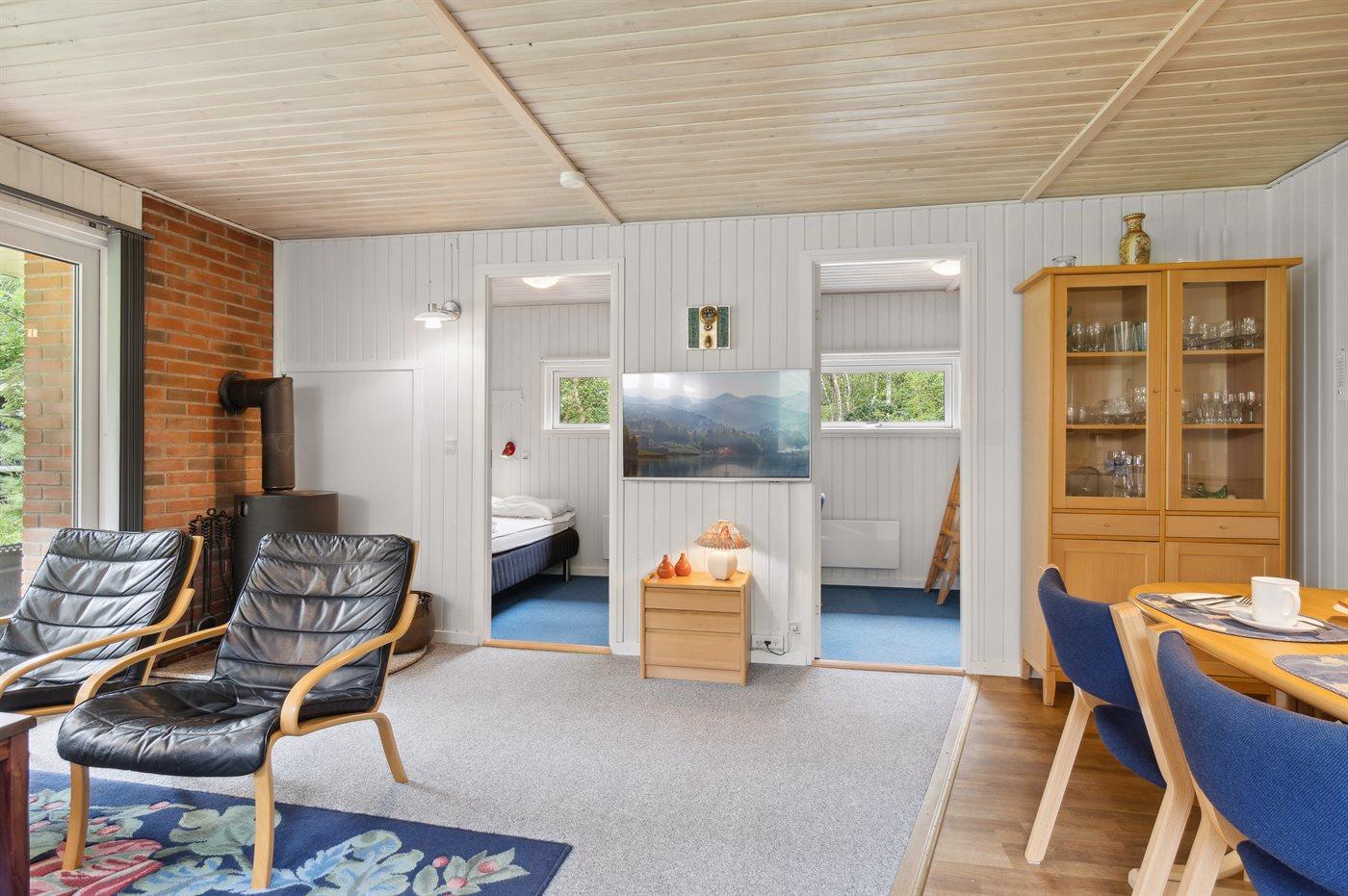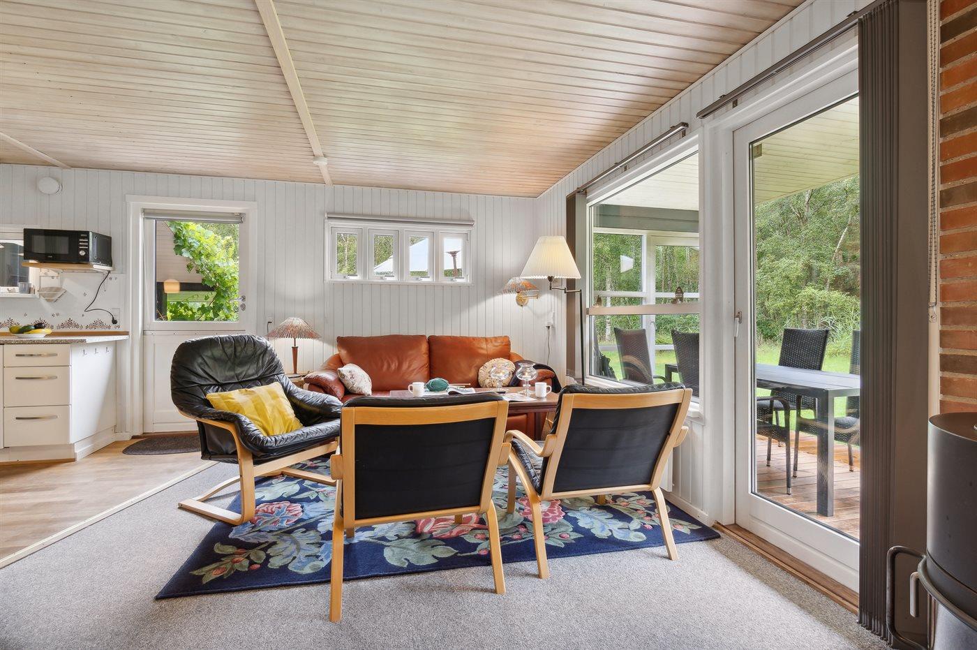 Tæt ved havet inde i skoven ligger dette hyggelige sommerhus på en dejlige, ugenert grund. I de lidt kølige sommeraftener kan du tænde op i den udendørs pejs, som står på en af de 2 overdækkede terrasser. Der er altid plads til leg og spil i haven, imens du gør klar til at grille på terrassen.