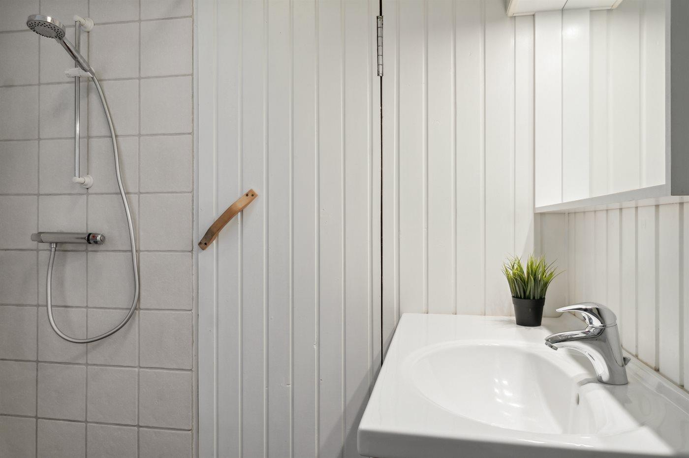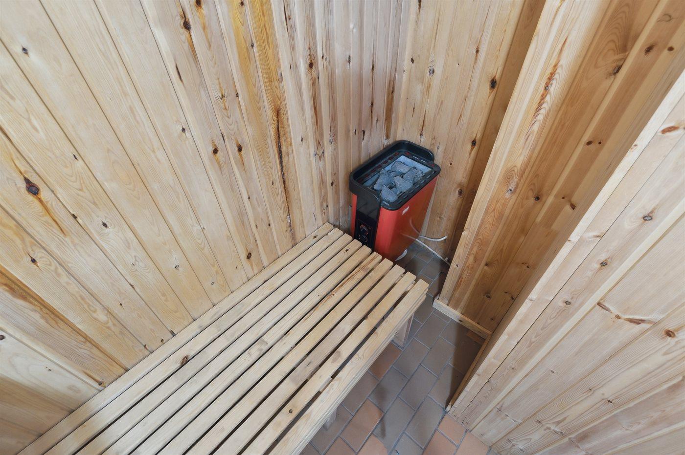 Der er 1 badeværelse med bruser og 1 toilet.. Der er gulvvarme på 1 badeværelse. I saunaen er der mulighed for afslapning.
