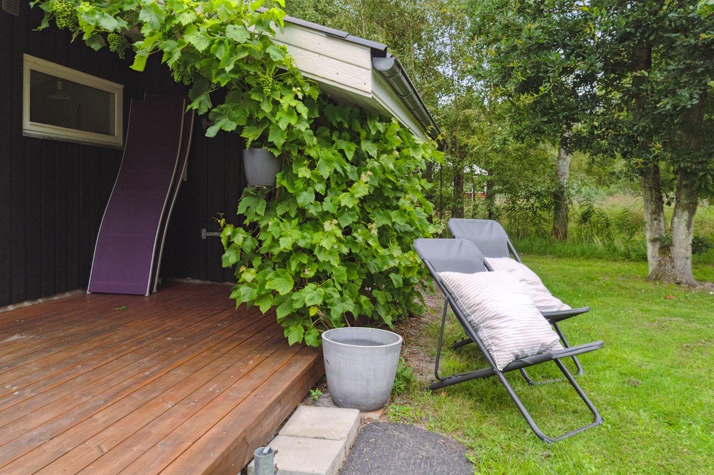 Ferieboligen er beliggende på en 1703 m² stor havegrund. Der er 420 m til havet. Der er 1600 m til fjorden. Nærmeste forretning er beliggende i en afstand af 4480 m. Der er en golfbane i en afstand af 13740 m. Til ferieboligen hører 20 m² terrasseareal. Desuden er der 15 m² overdækket terrasse. På lune aftener sørger en udendørs pejs for hyggelig stemning. Grill til rådighed. Parkering ved ferieboligen.