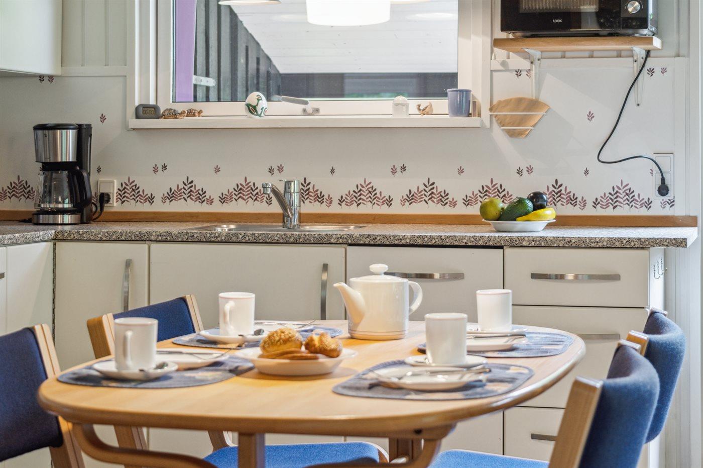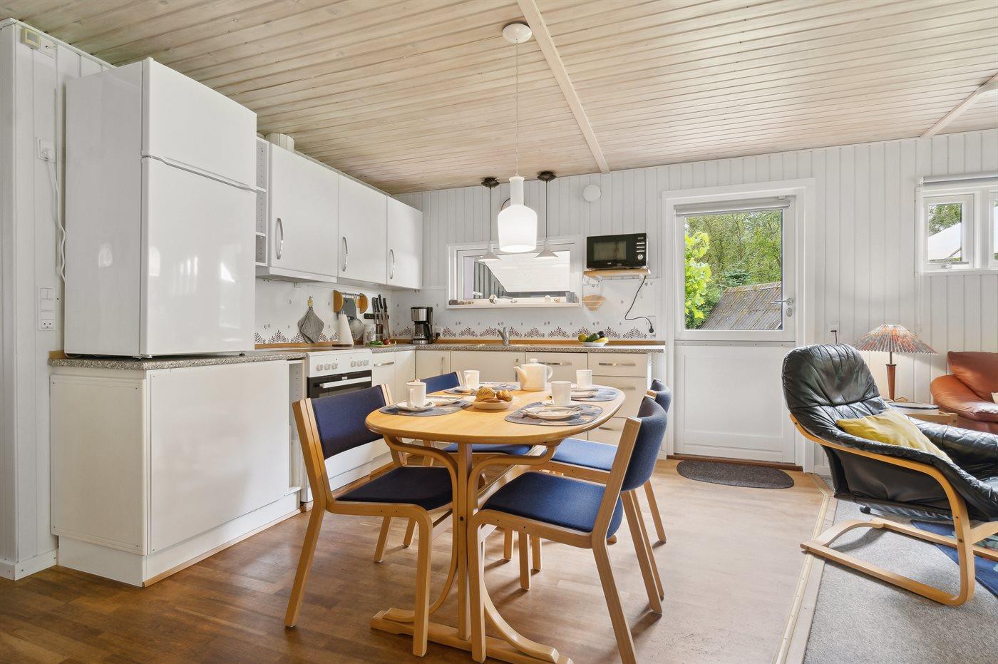 Køkkenet er udstyret med 1 køleskab. Der er 4 keramiske kogeplader, varmluftovn, mikrobølgeovn samt opvaskemaskine.