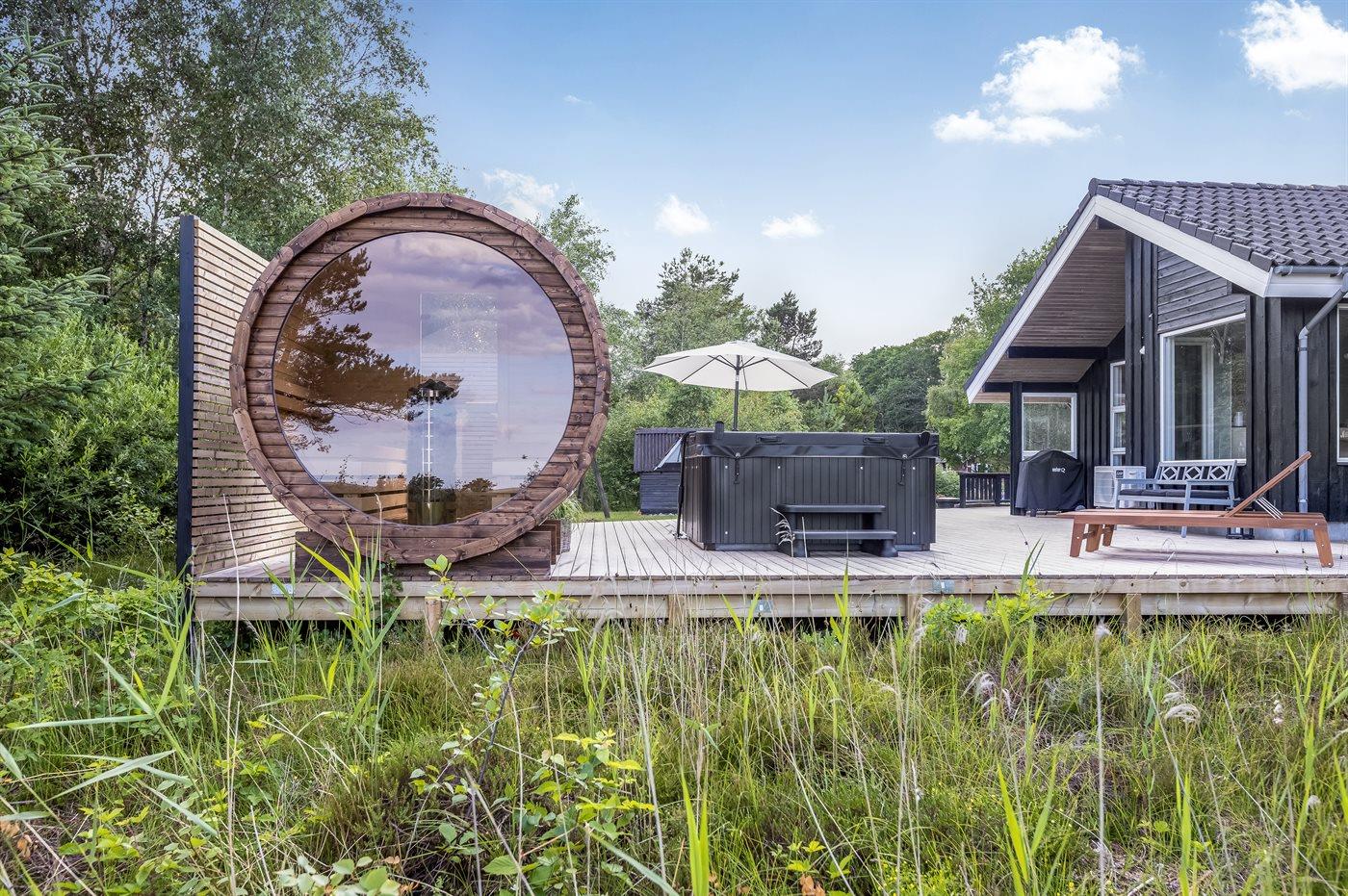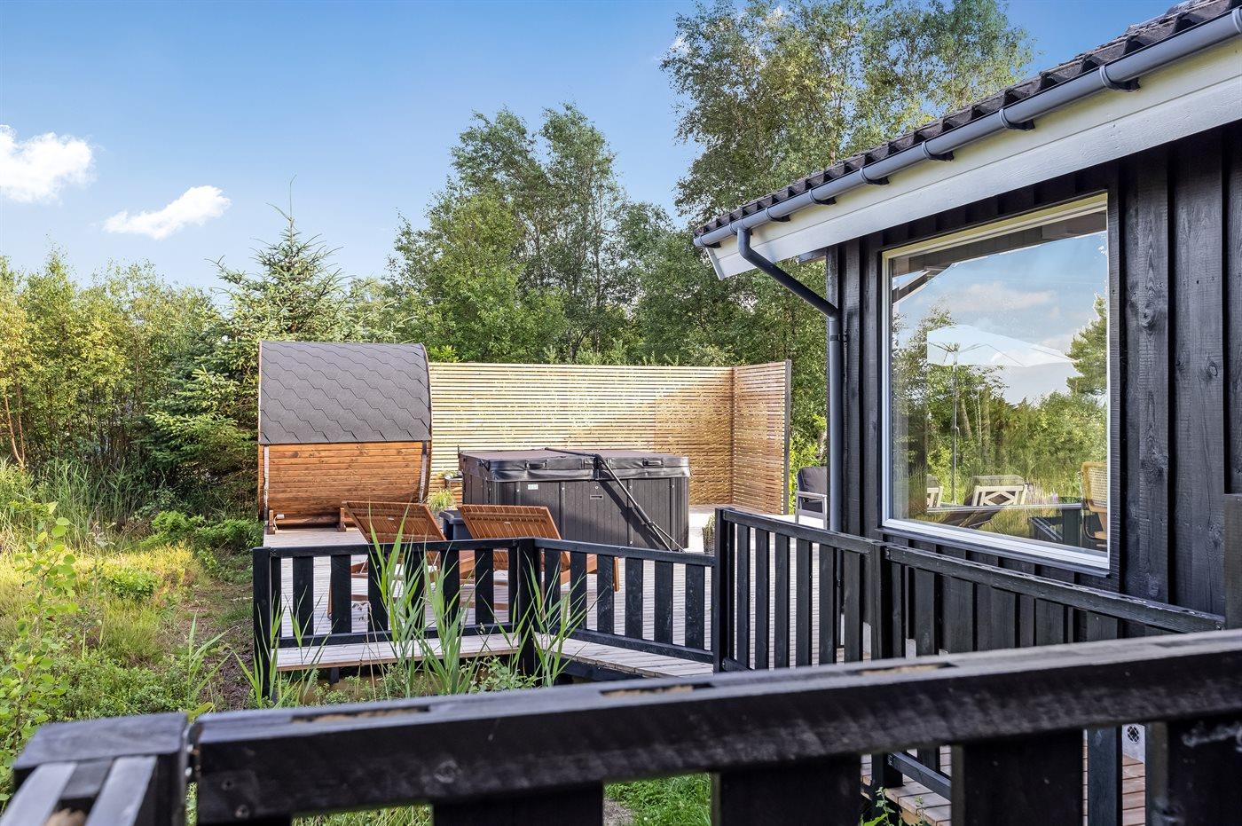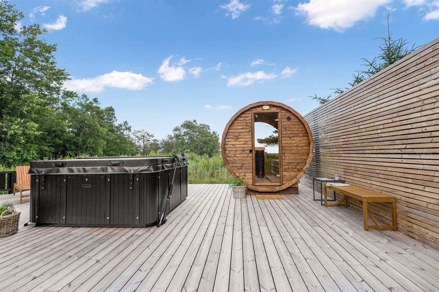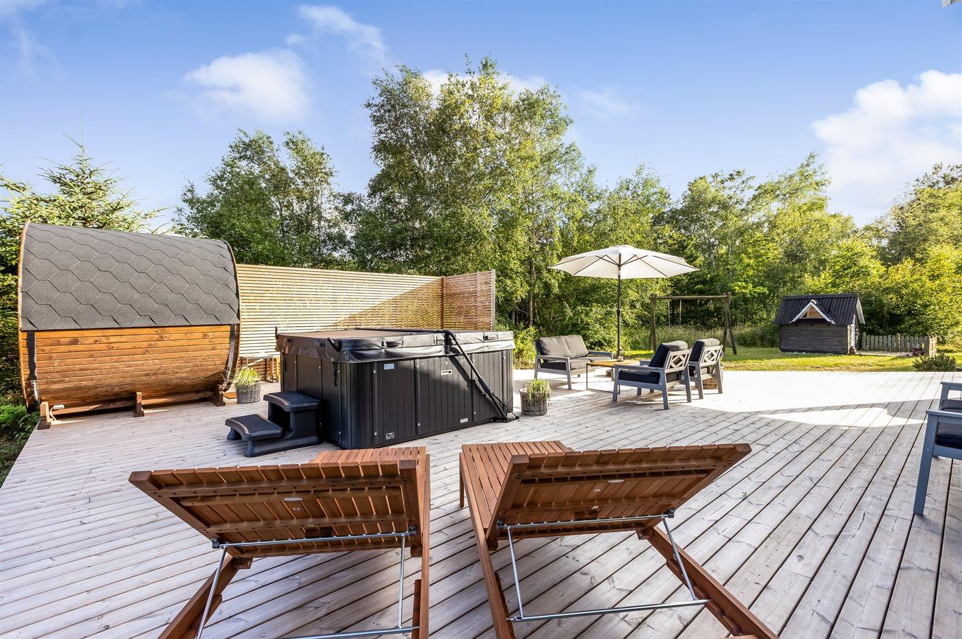 Den flotte udsigt går igen inde såvel som ude. Sommerhuset har et fantastisk terrasseareal, der netop er taget i brug i 2024 og, hvorfra det er muligt at nyde solen og de smukke omgivelser. På hjørnet af den store terrasse kan du sidde i det store og dejlige spabad med plads til hele familien og nyde udsigten og de fredelige omgivelser. Fra spabadet kan man nærmest hoppe direkte over i den udendørs sauna, hvor det også er en særlig oplevelse at sidde og kigge ud på den flotte natur via det store vinduesparti i saunaen. Her får man i høj grad en fornemmelse af at være midt i naturen.