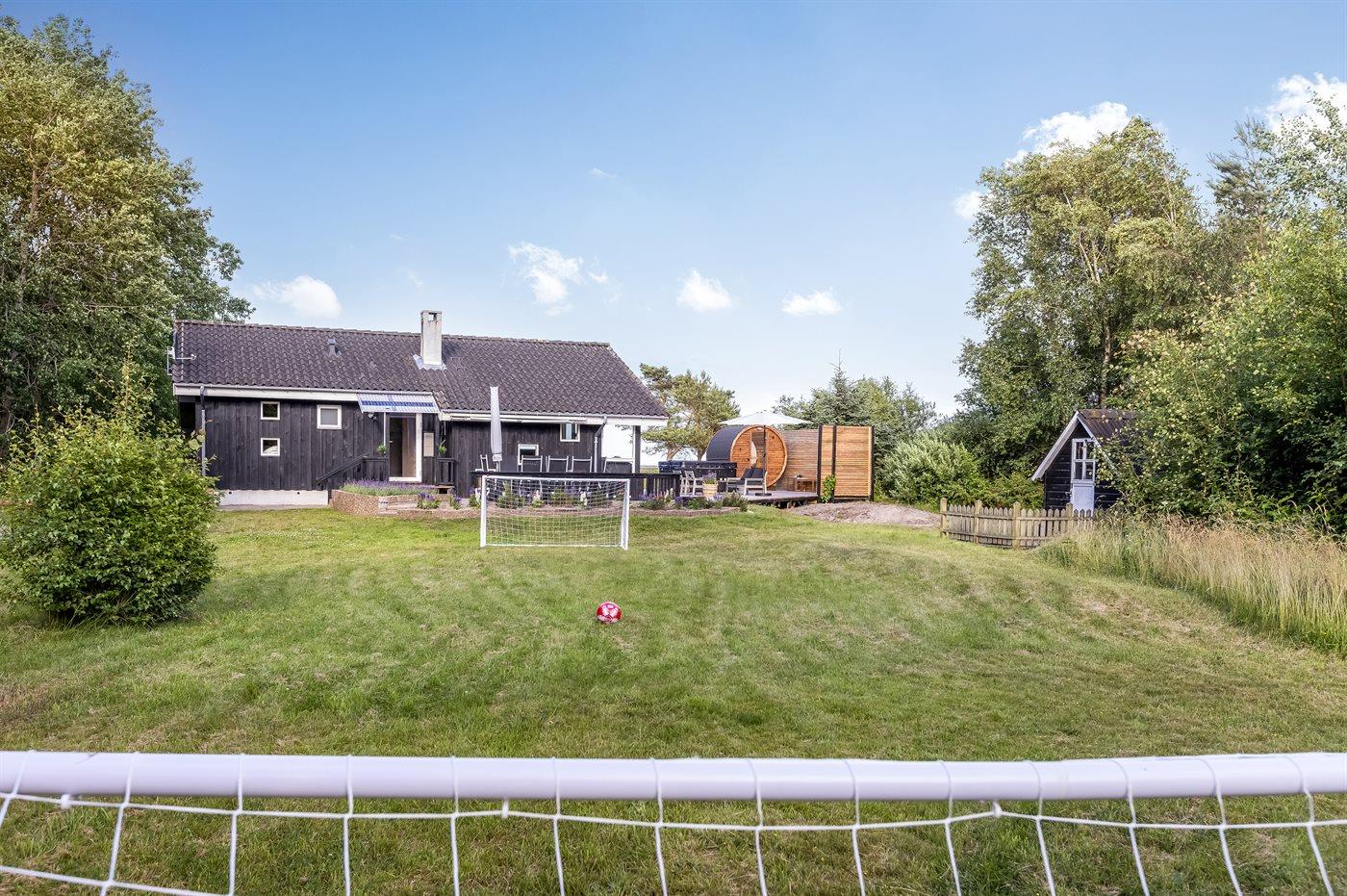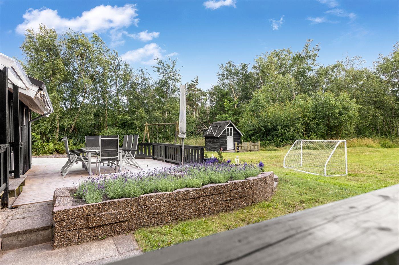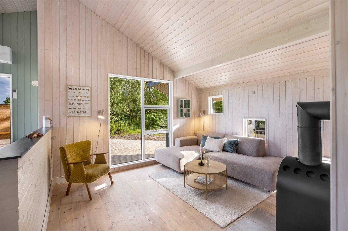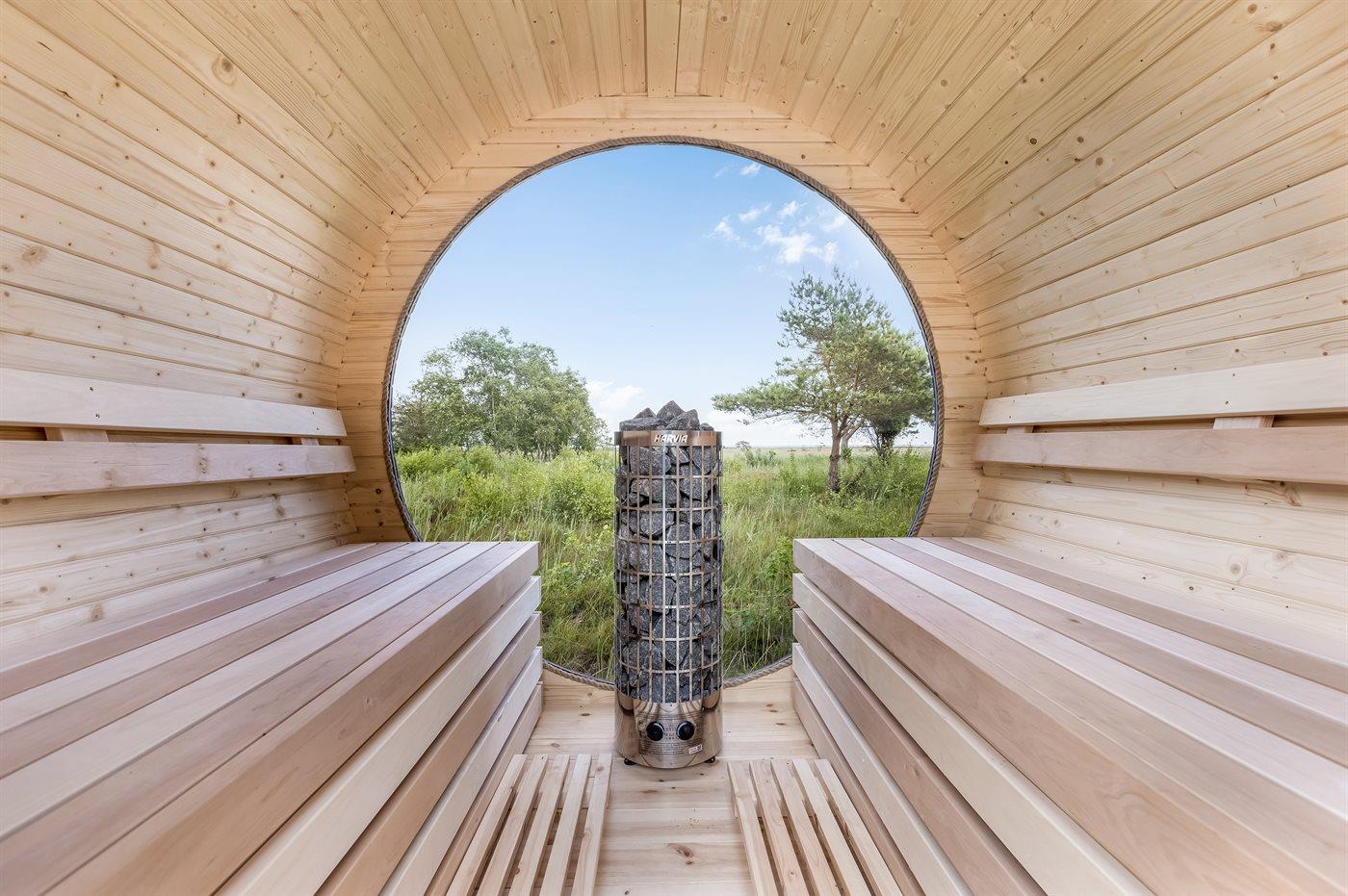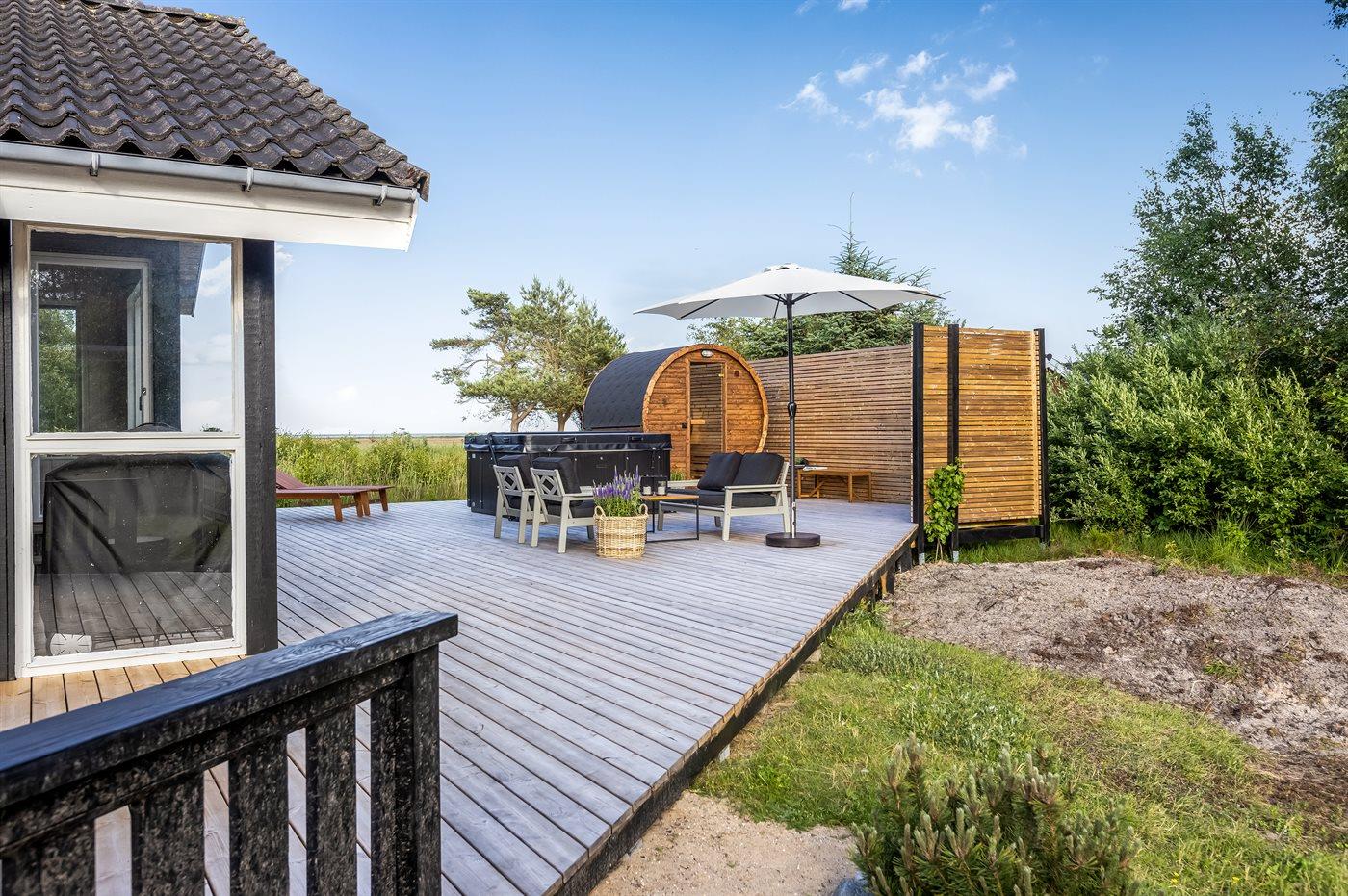 Den flotte udsigt går igen inde såvel som ude. Sommerhuset har et fantastisk terrasseareal, der netop er taget i brug i 2024 og, hvorfra det er muligt at nyde solen og de smukke omgivelser. På hjørnet af den store terrasse kan du sidde i det store og dejlige spabad med plads til hele familien og nyde udsigten og de fredelige omgivelser. Fra spabadet kan man nærmest hoppe direkte over i den udendørs sauna, hvor det også er en særlig oplevelse at sidde og kigge ud på den flotte natur via det store vinduesparti i saunaen. Her får man i høj grad en fornemmelse af at være midt i naturen.