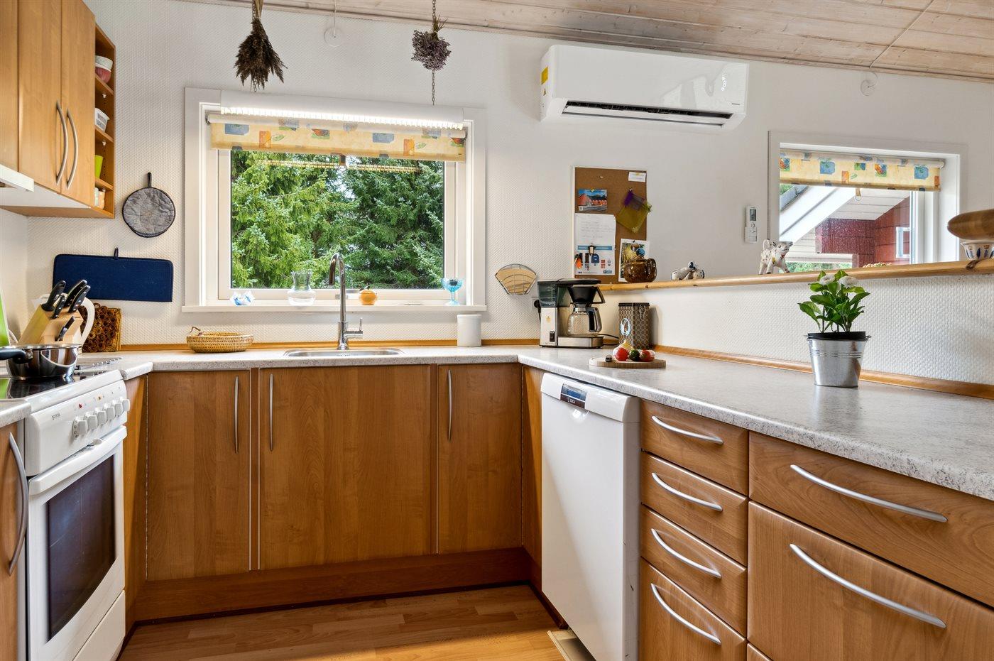 Køkkenet er udstyret med 1 køleskab. Der er 4 induktionskogeplader, varmluftovn samt opvaskemaskine.