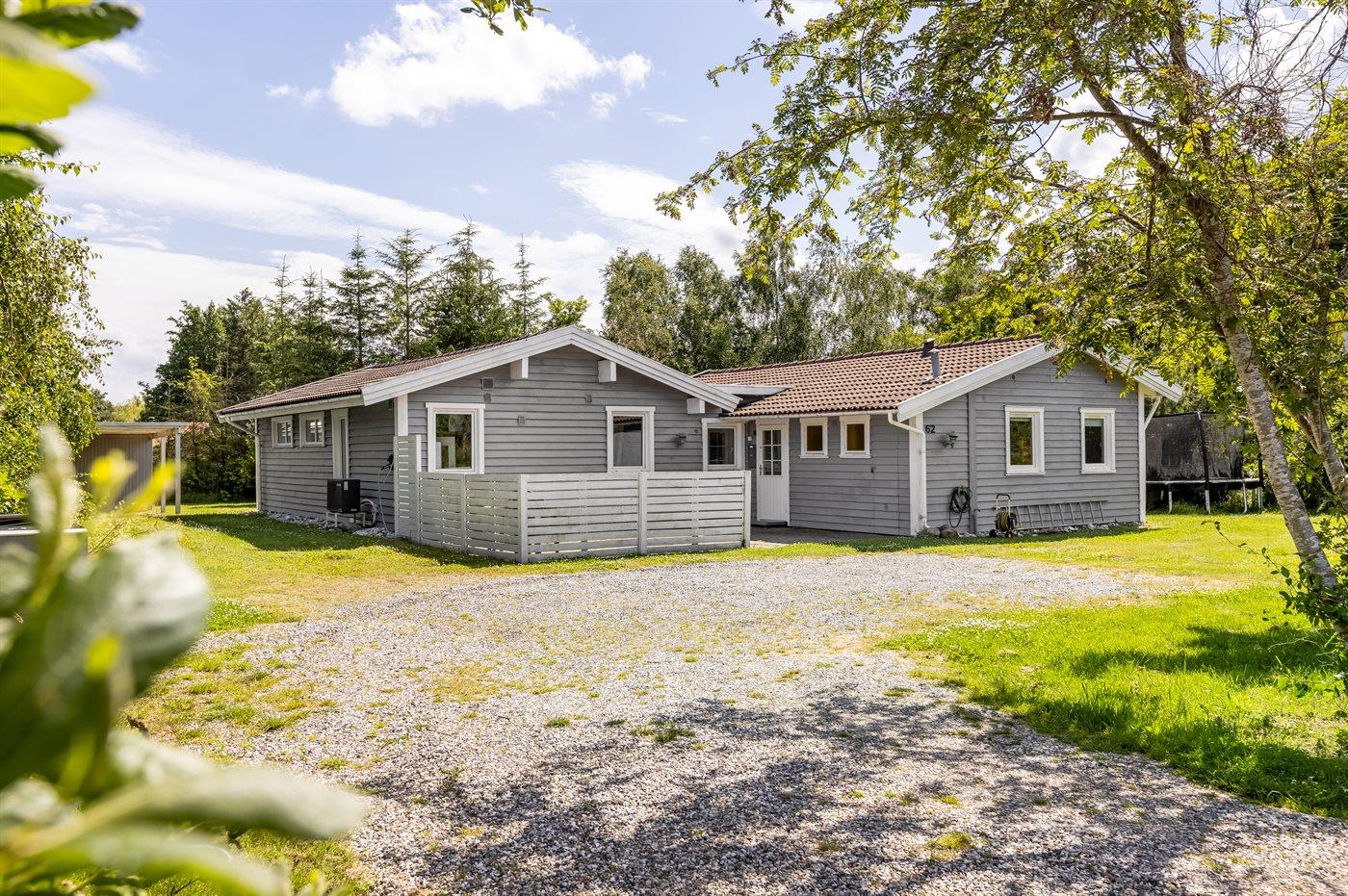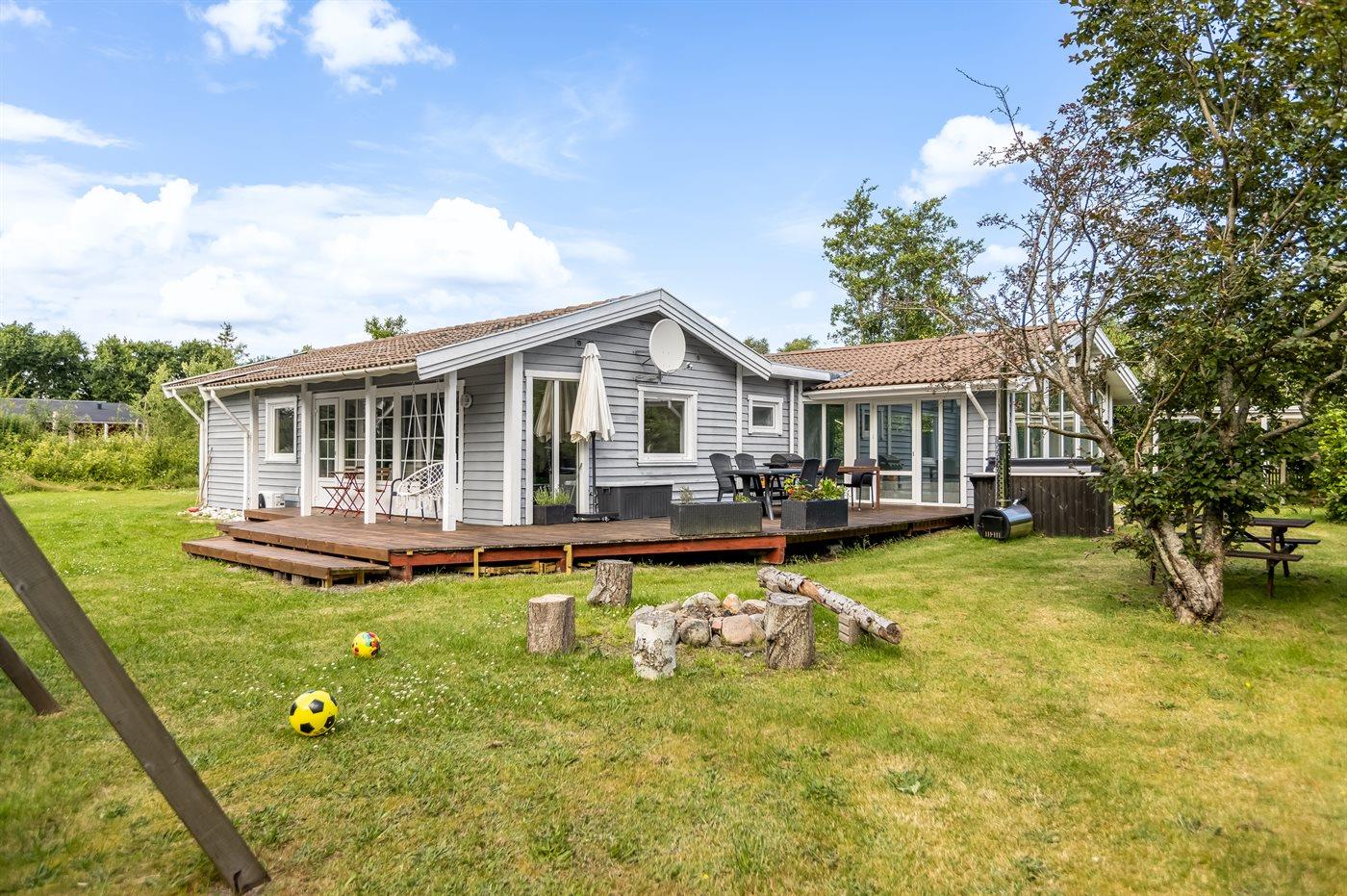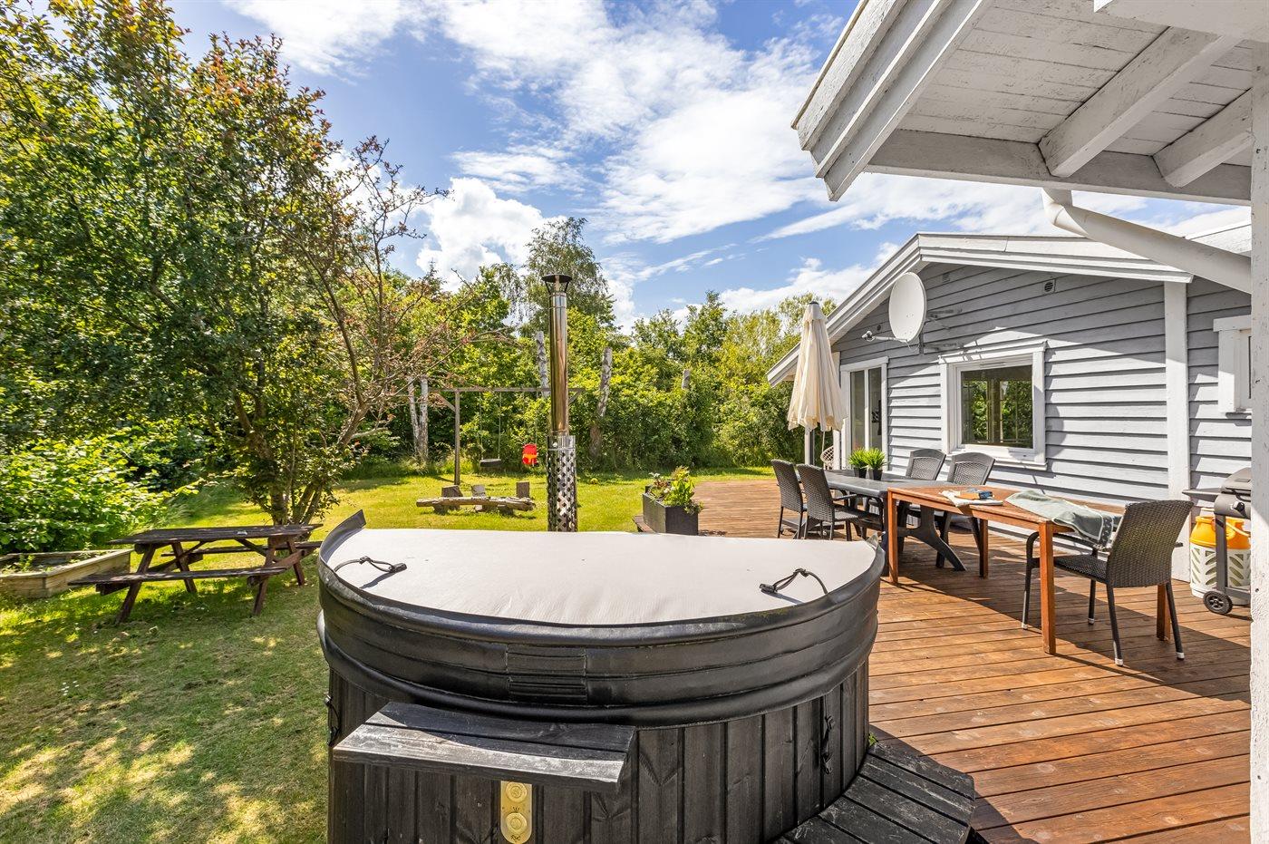 Ferieboligen er beliggende på en 1204 m² stor naturgrund. Der er 950 m til havet. Der er 2700 m til fjorden. Nærmeste forretning er beliggende i en afstand af 2800 m. Der er en golfbane i en afstand af 12700 m. Til ferieboligen hører åbent terrasseareal. Desuden er der overdækket terrasse. Gynge. Sandkasse. Trampolin. Bålsted. Grill til rådighed. Der er installeret stik til opladning af elbil. Type 2 stik. Med 11 kW ladeeffekt. Parkering ved ferieboligen.