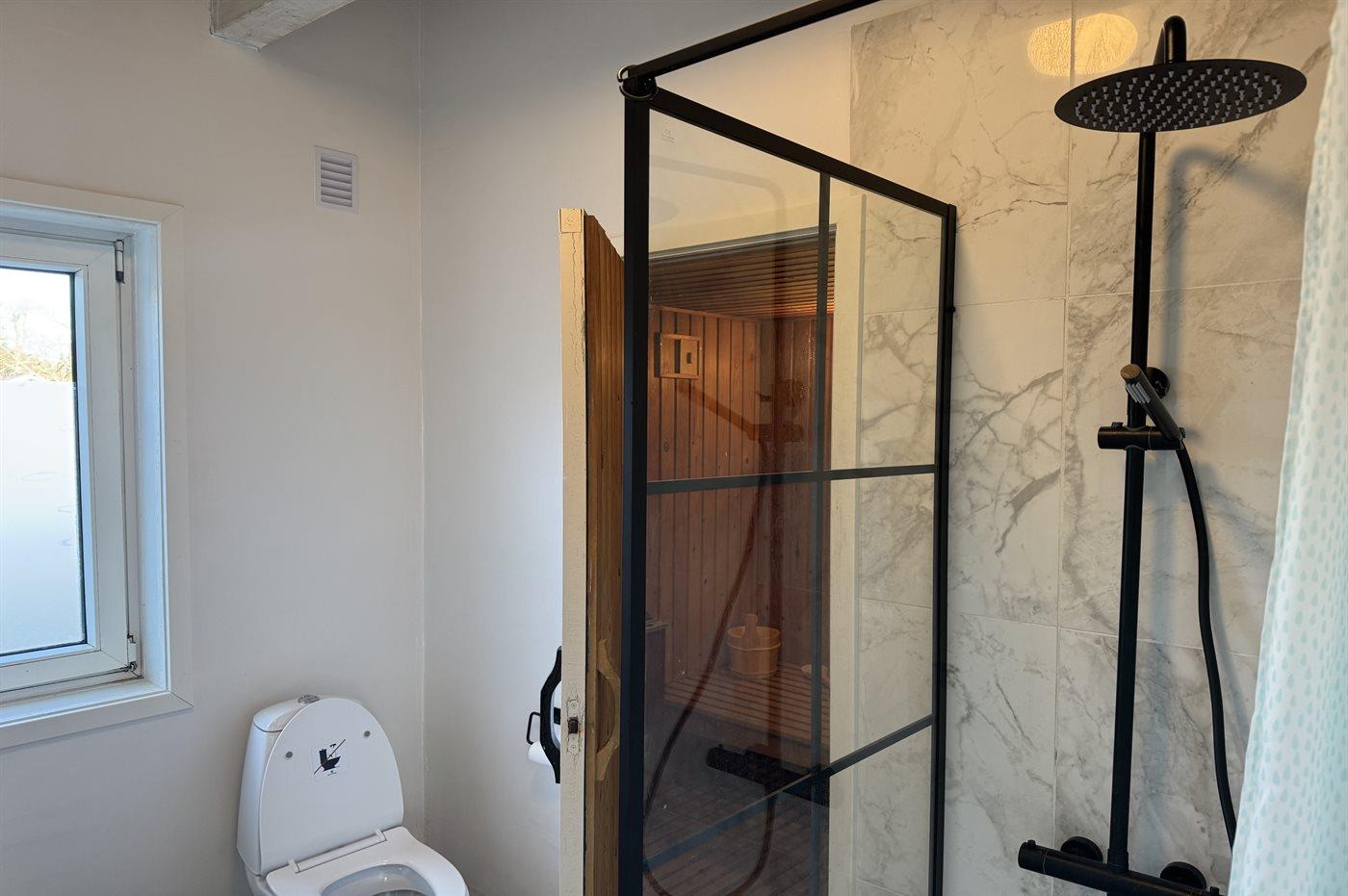 Der er 2 badeværelser med bruseniche og 2 toiletter. Der er gulvvarme på 1 badeværelse. I saunaen er der mulighed for afslapning.