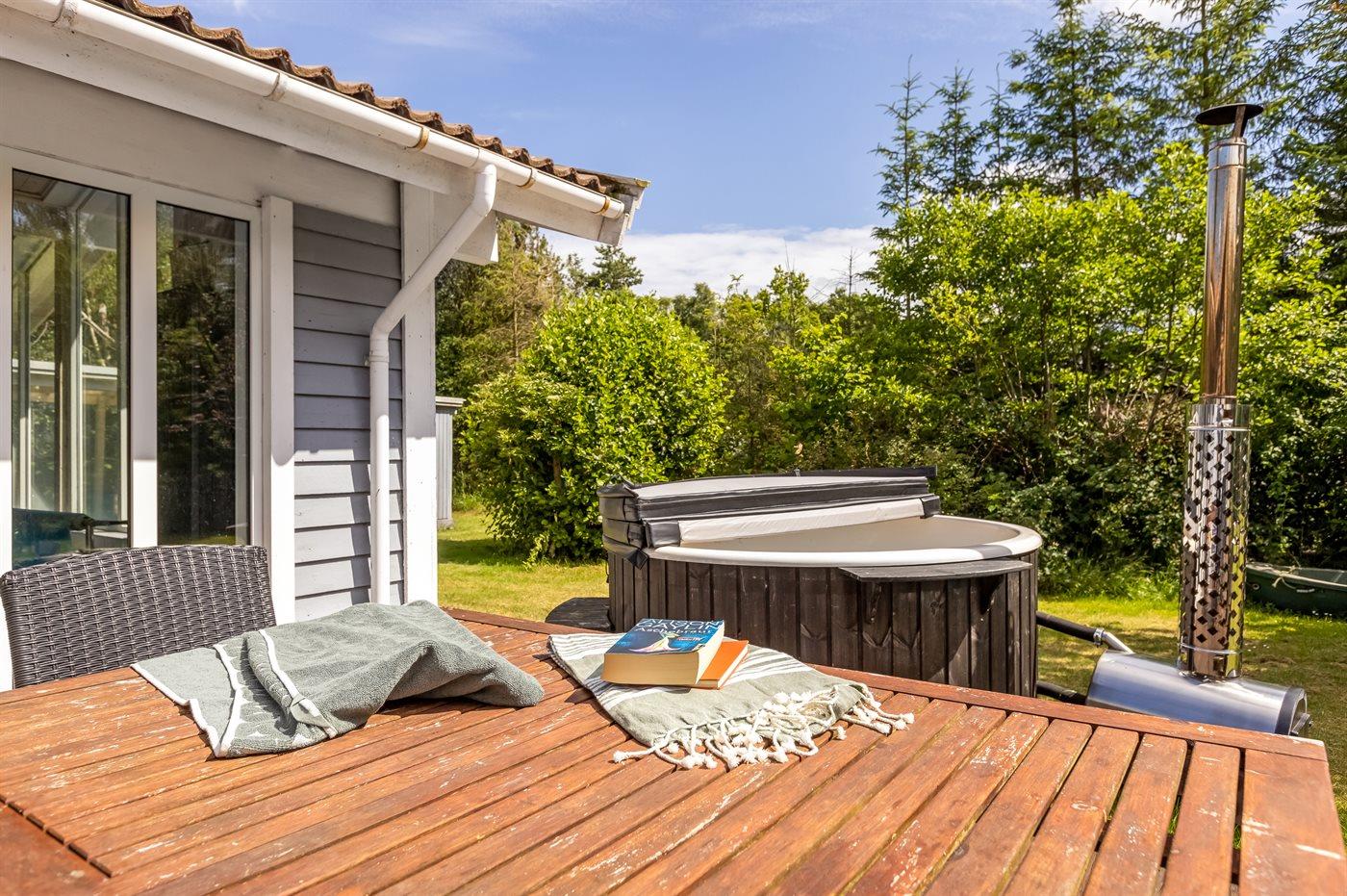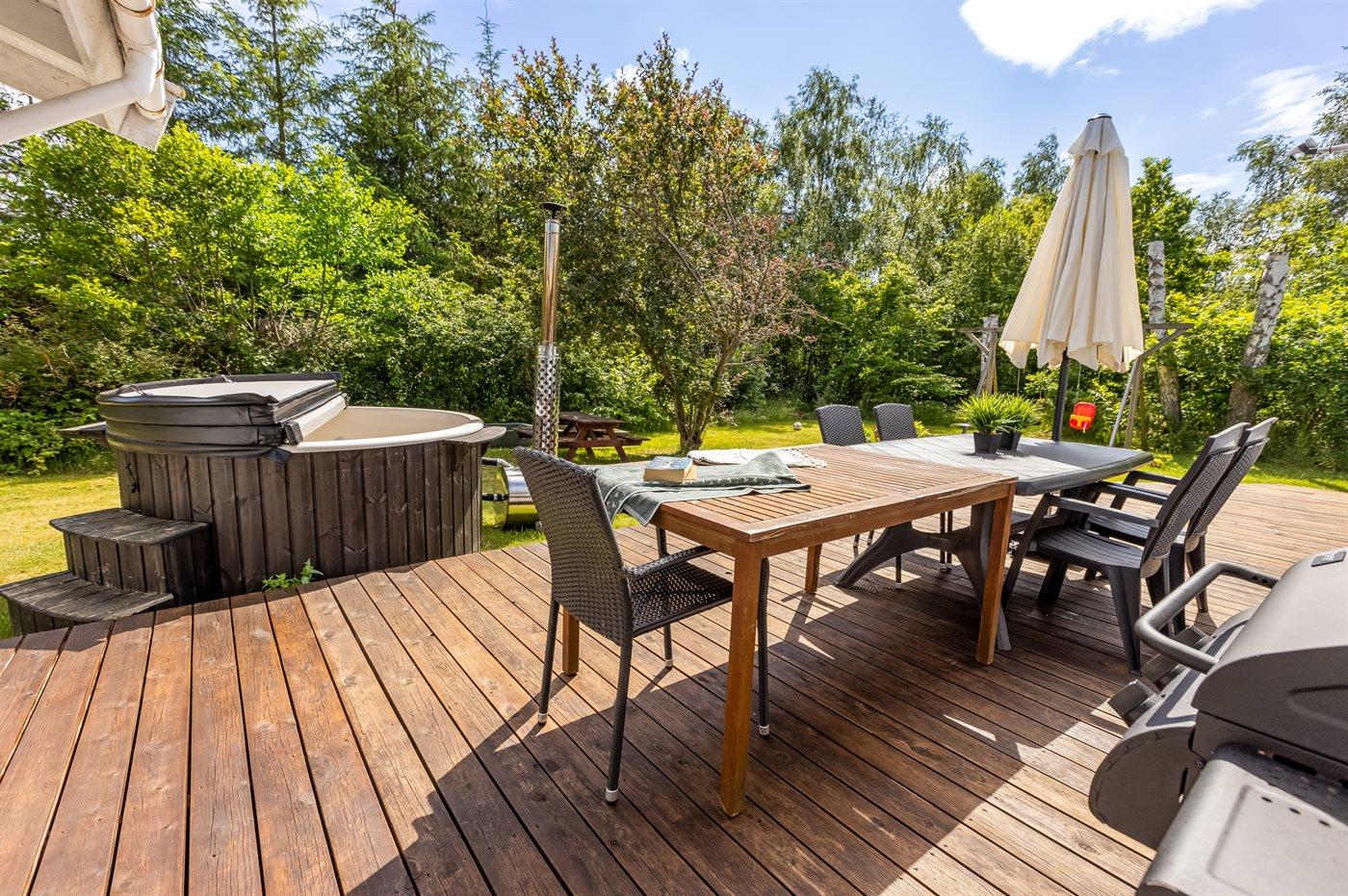 Skønt sommerhus i Helberskov med pool, sauna, spa og vildmarksbad tæt på Kattegat og Mariager Fjord.