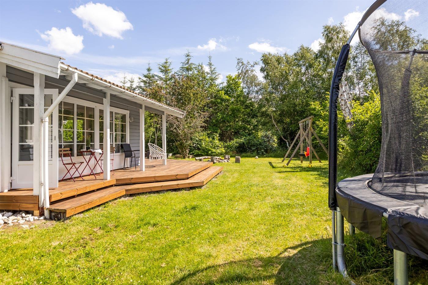 Ugenert have med gynge, trampolin, bålplads og god plads til spil og leg.