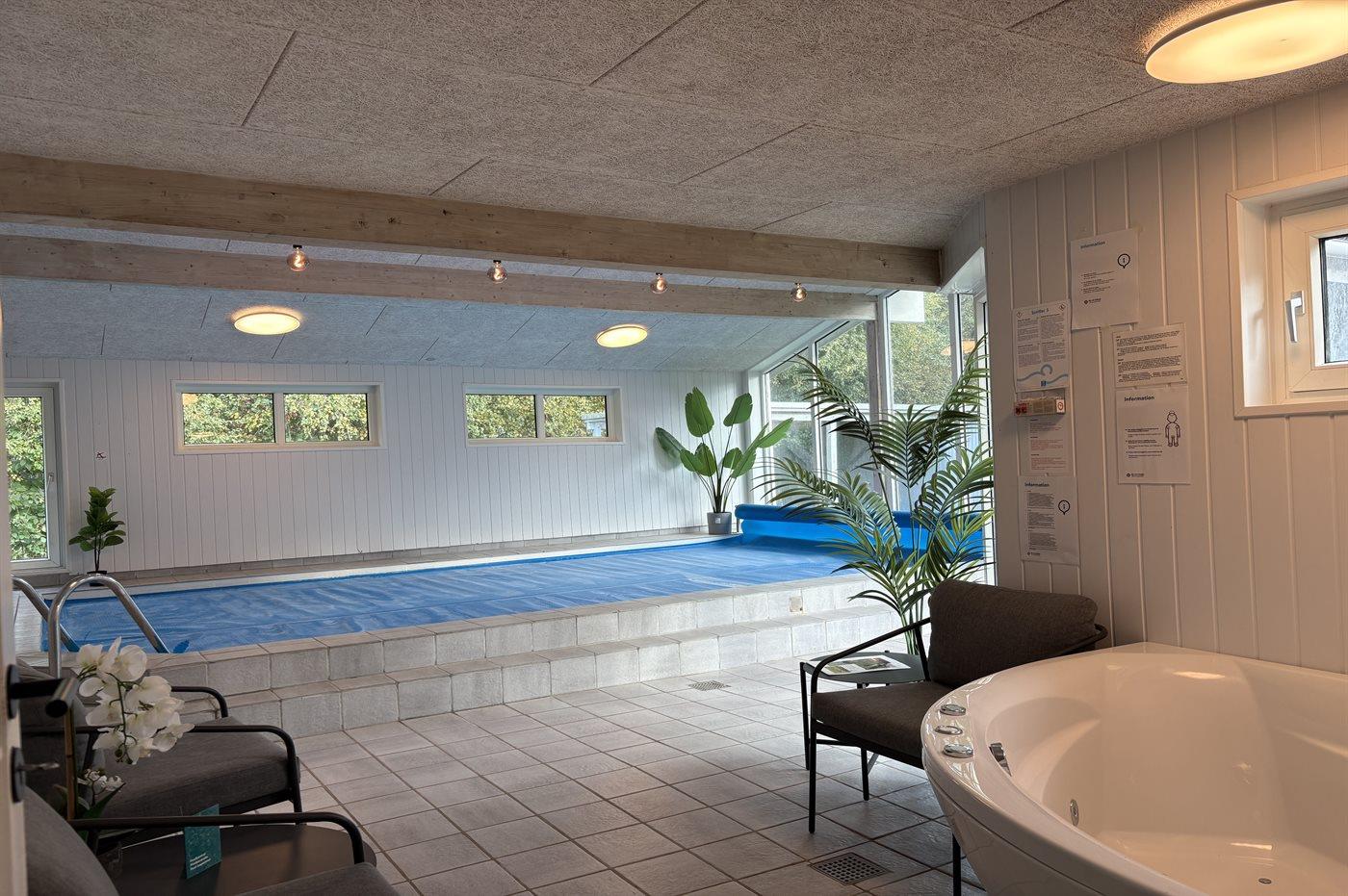 I den indendørs swimmingpool er der mulighed for leg og hyggeligt samvær.og den er op til 1,5 m dyb. Vandet er mellem 24 og 28° C varmt. Der er gulvvarme i swimmingpoolområdet.