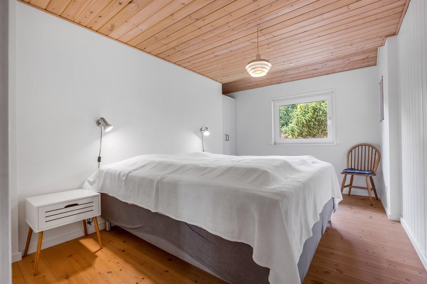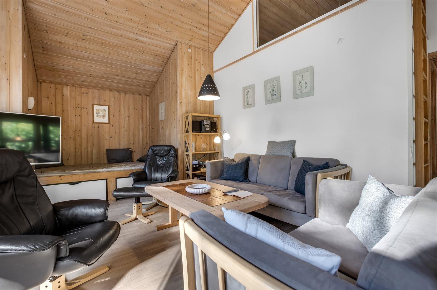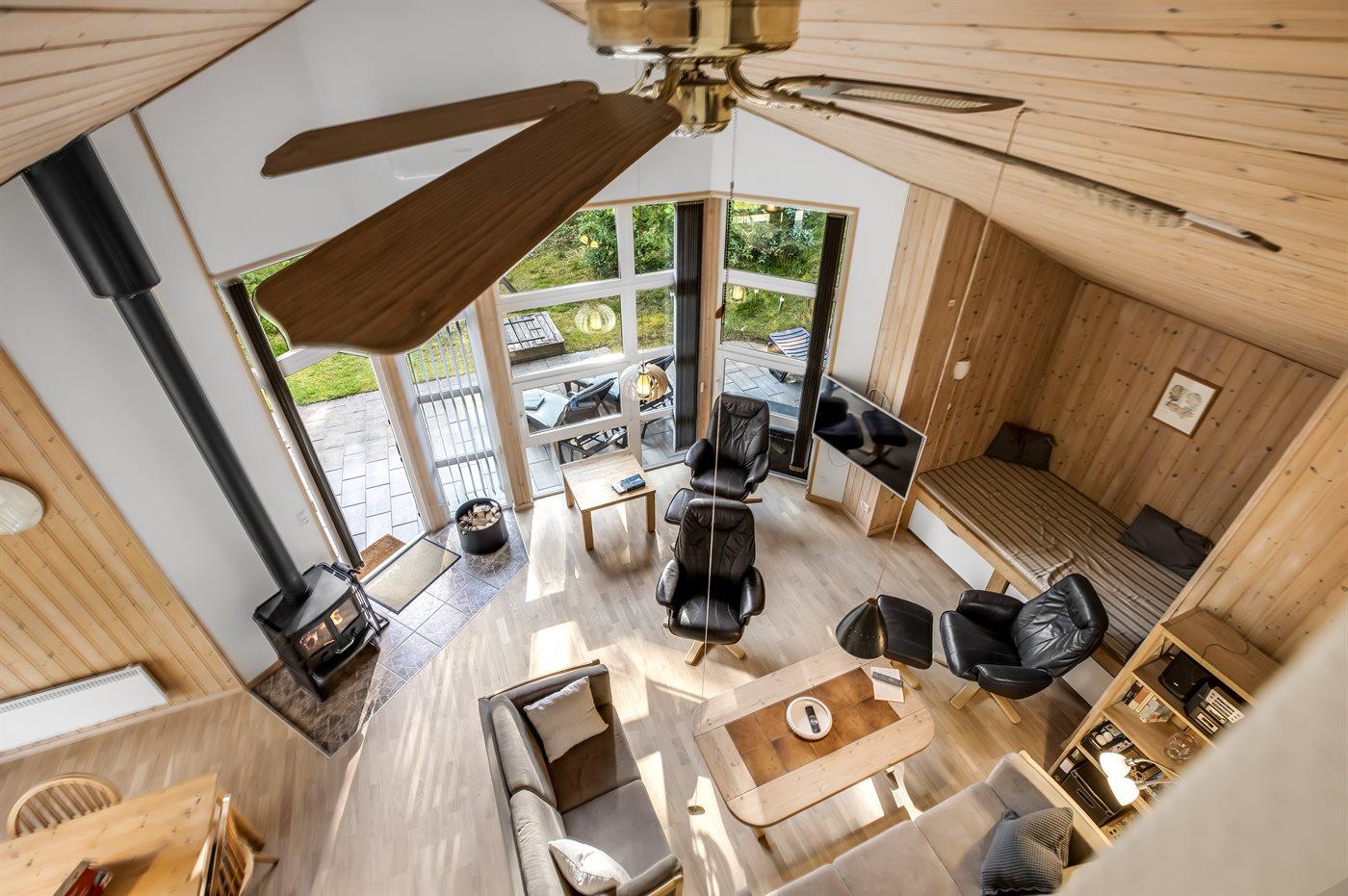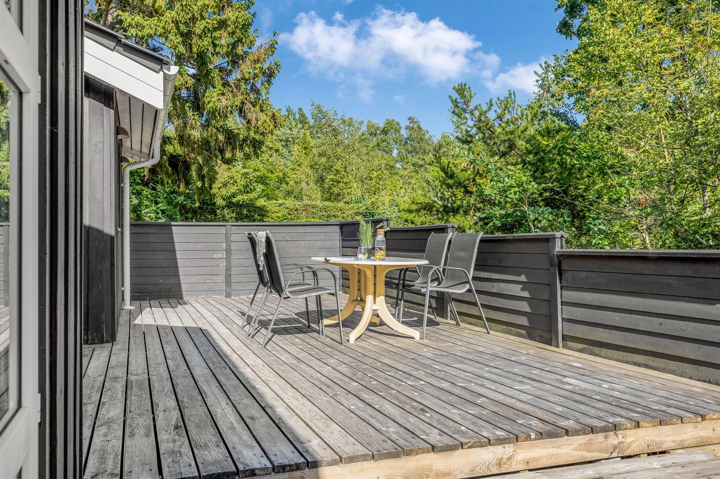 Det niveauopdelte hus ligger på en vidunderlig naturgrund midt i skoven omgivet af høje, gamle træer, hvor der dog trænger masser af sol igennem. På sommerhusets terrasser er der lagt op til timevis af solbadning, hygge, spil og naturligvis kulinariske grilleventyr.