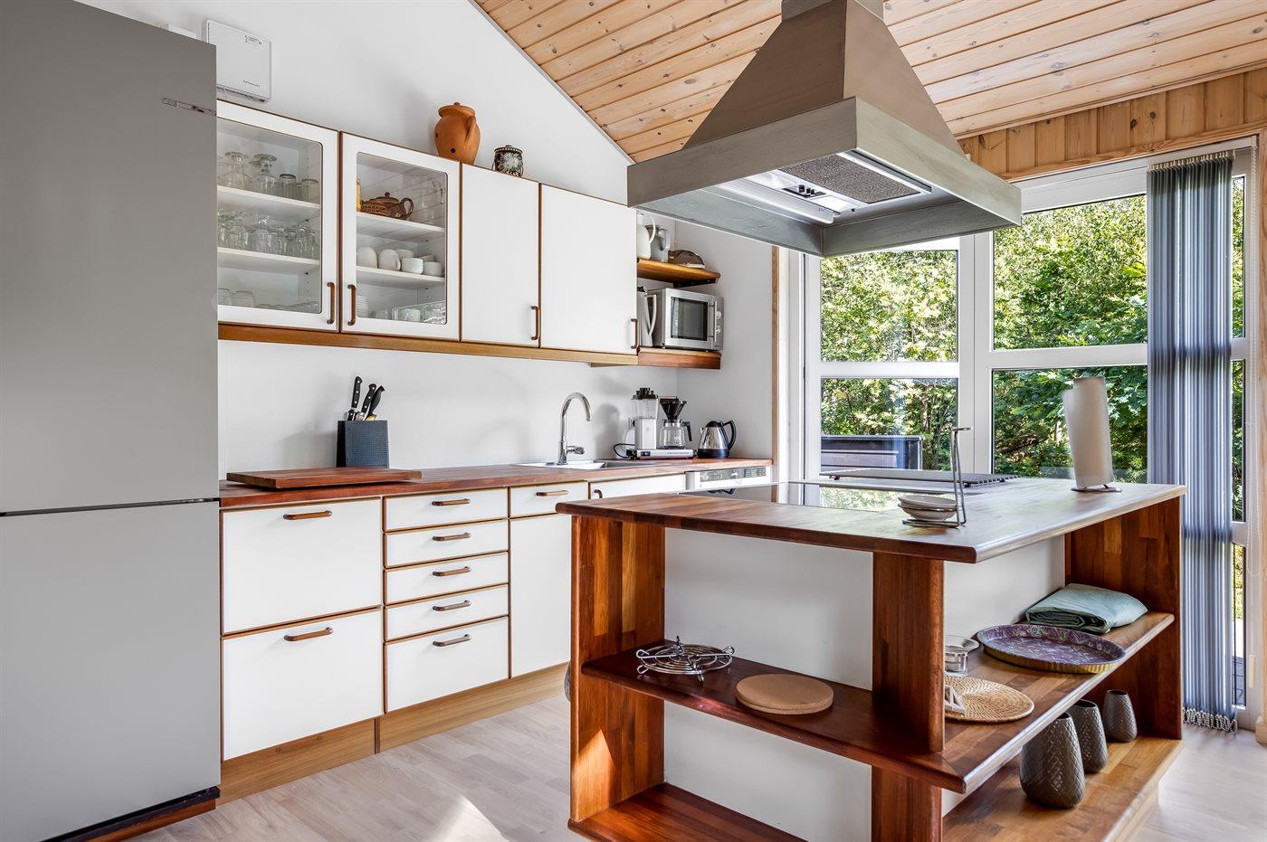 Køkkenet er udstyret med 1 køleskab. Der er 4 keramiske kogeplader, varmluftovn, mikrobølgeovn samt opvaskemaskine.