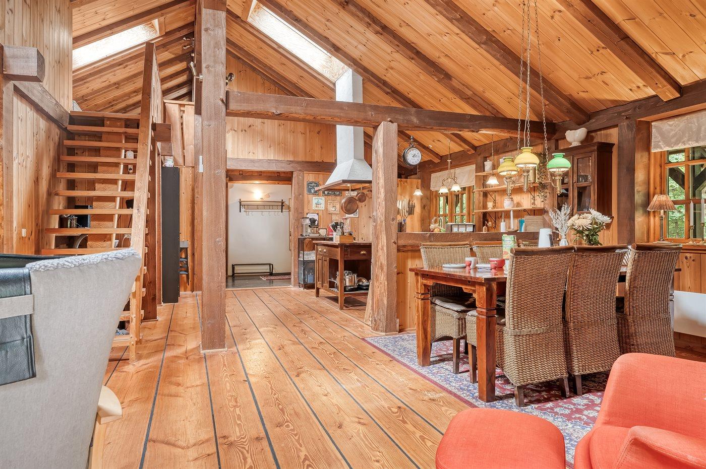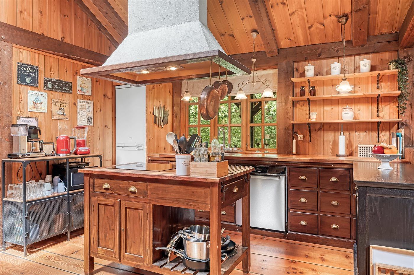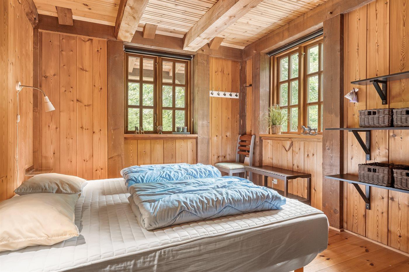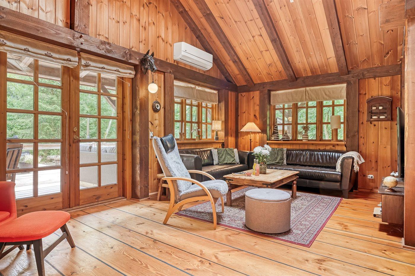 Fantastisk bjælke-sommerhus med spa, vildmarkskar og privat skovgrund nær havet.