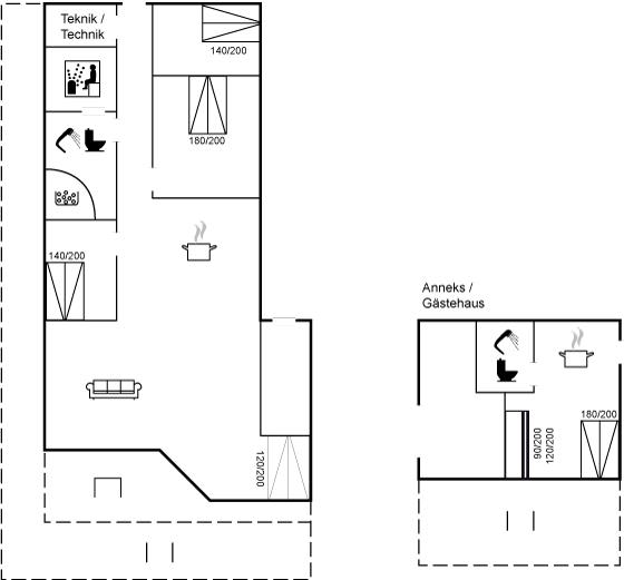 Der er i alt 4 soveværelser. Sovepladserne fordeler sig på: 8 sovepladser i dobbeltsenge. 2 sovepladser i køjeseng. 1 soveplads i alkove. 1 af disse sovepladser befinder sig i stuen, og 2 sovepladser findes i anneks. Derudover er der 1 stk. barneseng.