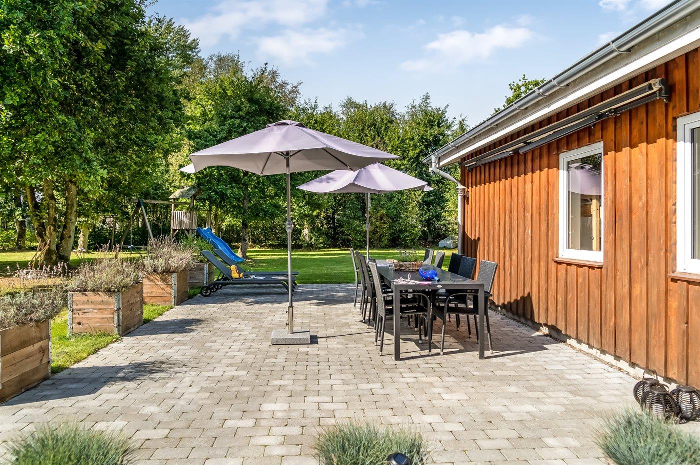 Huset ligger på en stor grund med gynge, bålplads og rigeligt med plads til leg og boldspil. De mange terrasser gør det muligt at følge solen hele dagen – og om aftenen kan I samle jer til hyggelige grillaftener i fredelige omgivelser.