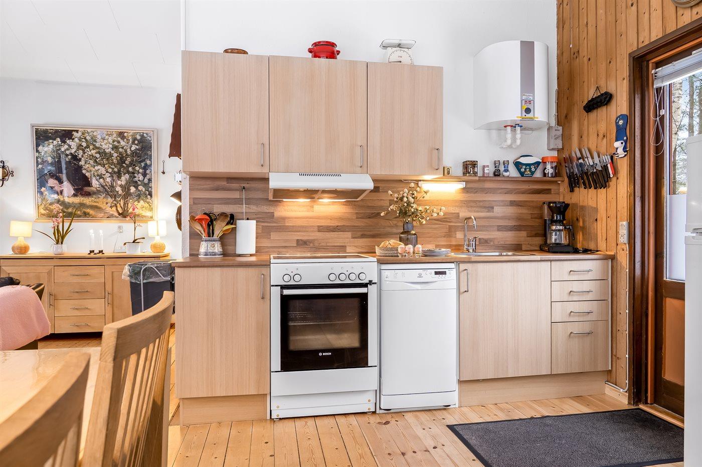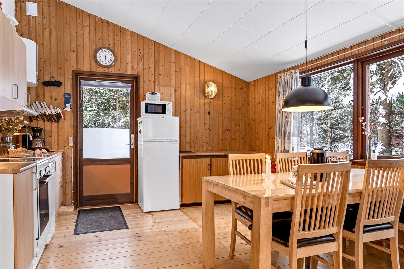 Køkkenet er udstyret med 1 køleskab. Der er 4 keramiske kogeplader, varmluftovn, mikrobølgeovn samt opvaskemaskine.