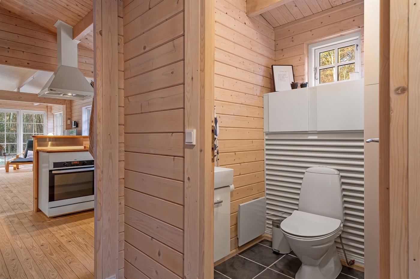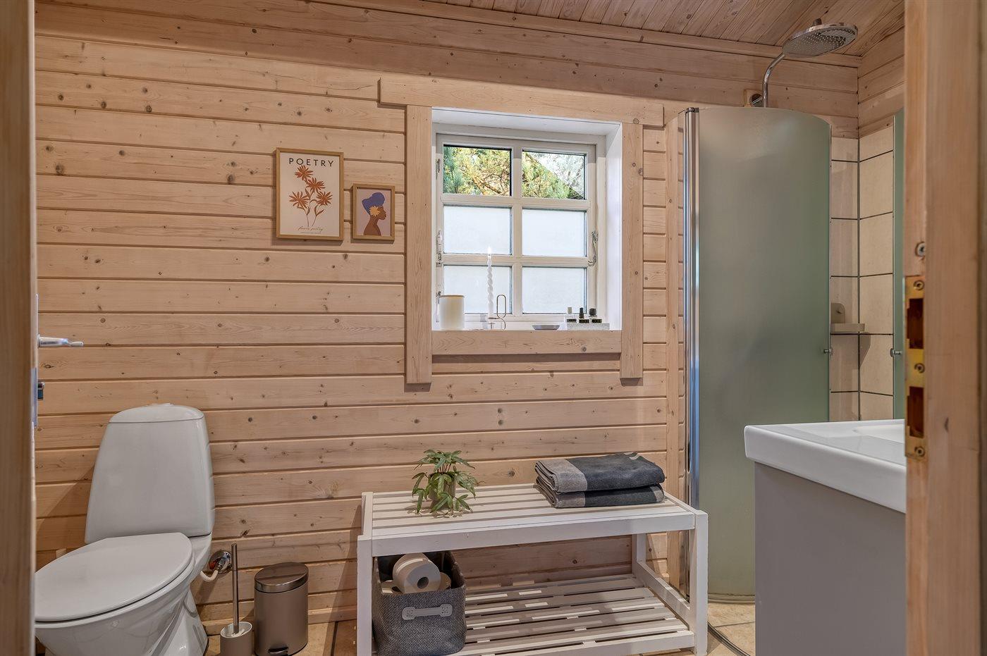 Badeværelset er indrettet med bruseniche med rainshower, behagelig gulvvarme samt kombineret vaskemaskine og tørretumbler. Derudover er et ekstra gæstetoilet.