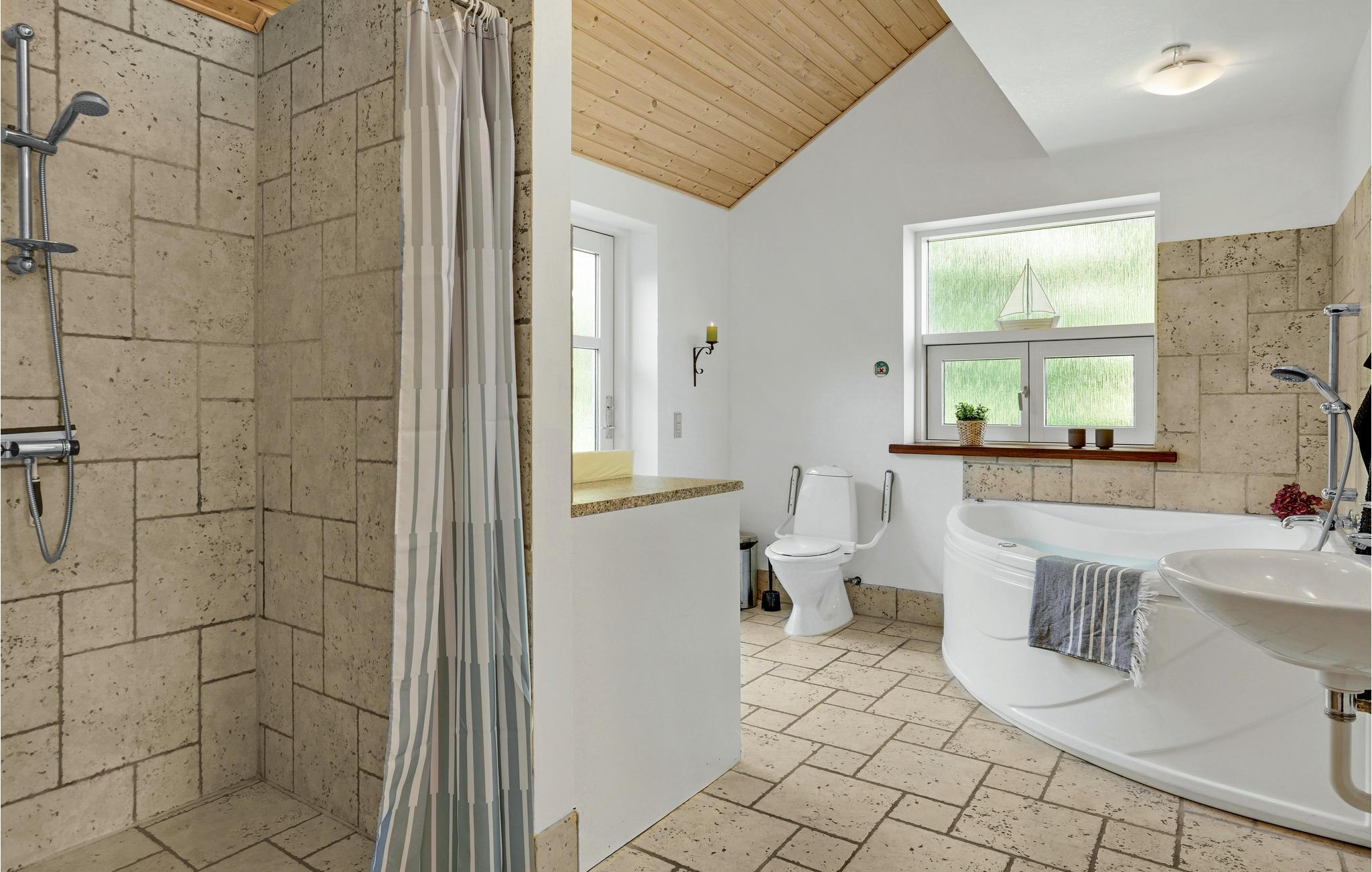 Huset har stor stue med udgang til terrasse og en tv afdeling med stor fladskærm. Den praktiske indretning med mange soverum og hele fire badeværelser gør huset velegnet til ferieophold for både to og tre familier. De store åbne og overdækkede terrasser gør at man kan nyde udelivet det meste af året. Kør en tur og oplev ’Rosernes by’ Mariager der oser af idyl, med gamle bindingsværkshuse og brostensgader. Besøg også Danmarks saltcenter, husk badetøjet og prøv at flyde i ’Det røde hav’, hvis saltkoncentration bærer jer oppe. Rundt om fjorden ligger hyggelige landsbyer og små kroer, gamle kirker og det gamle kloster. Slap også af ved stranden, tag fiskestangen med og fang din egen aftensmad. Inden for kort kørselsafstand finder man desuden det spændende " Lille Vildmosemuseum" og " Remissen " i Dokkedal. Huset er egnet til korestolsbrugere.
