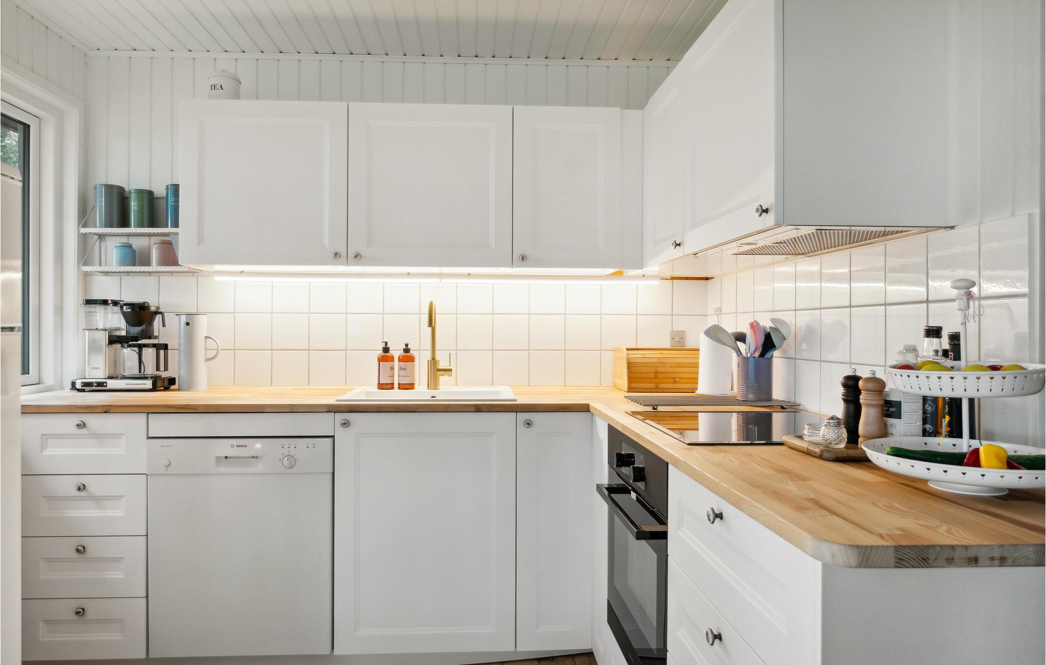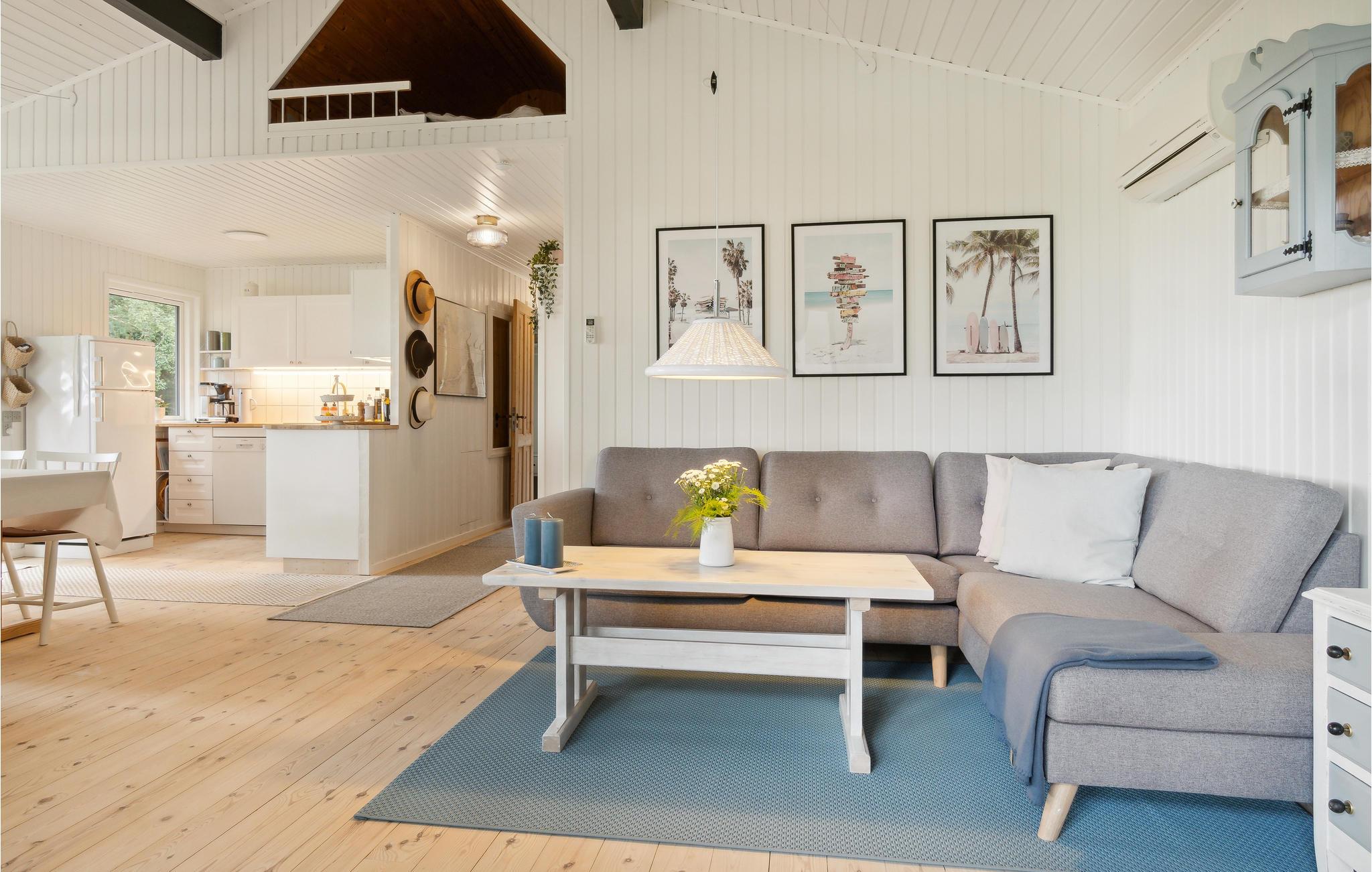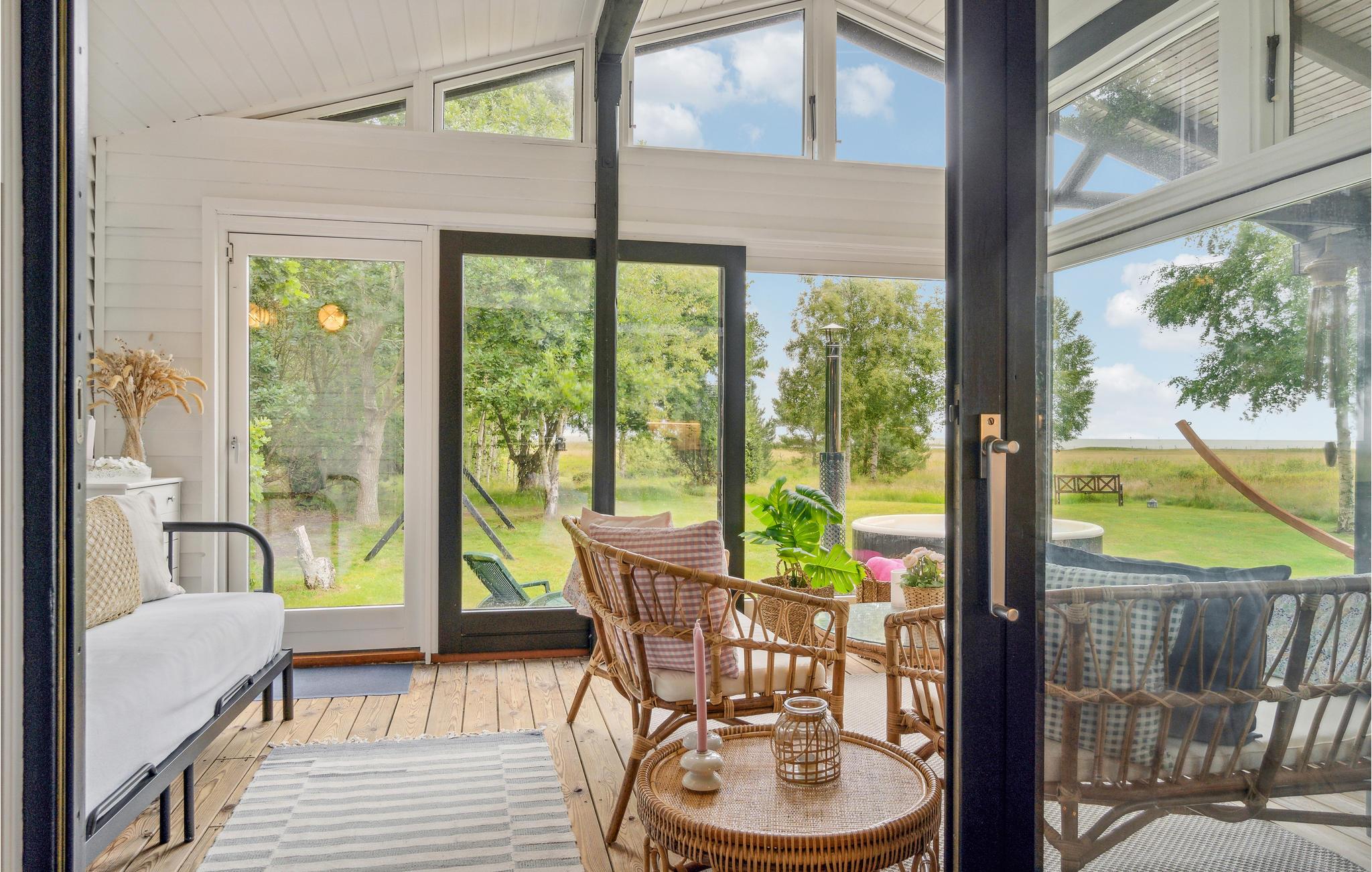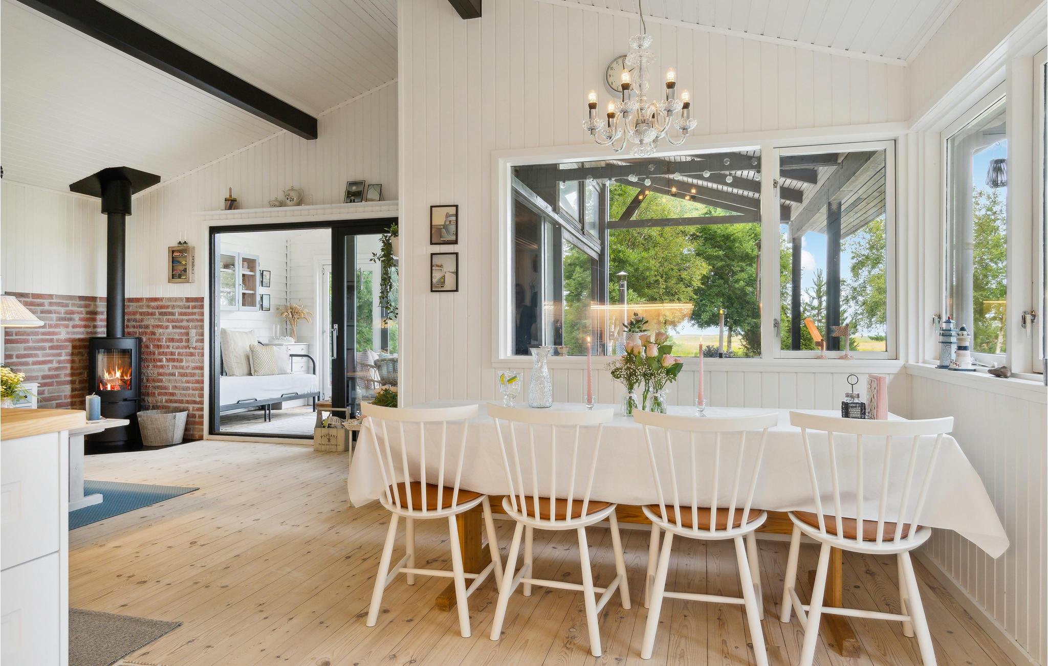 Dette smukke feriehus byder jer velkommen med attraktiv beliggenhed ved Kattegat. Indenfor venter jer en gennemtænkt indretning af høj kvalitet, der gør et smagfuldt og personligt indtryk. Takket være de mange store vinduespartier kan I nyde den vidunderlige udsigt, uanset om I sidder samlet rundt om spisebordet over lækre måltider eller slapper af i de forskellige sofaer. Tilbring hyggelige timer i udestuen med den bog, I længe har villet læse, og varm jer i de kolde årstider foran brændeovnen.
