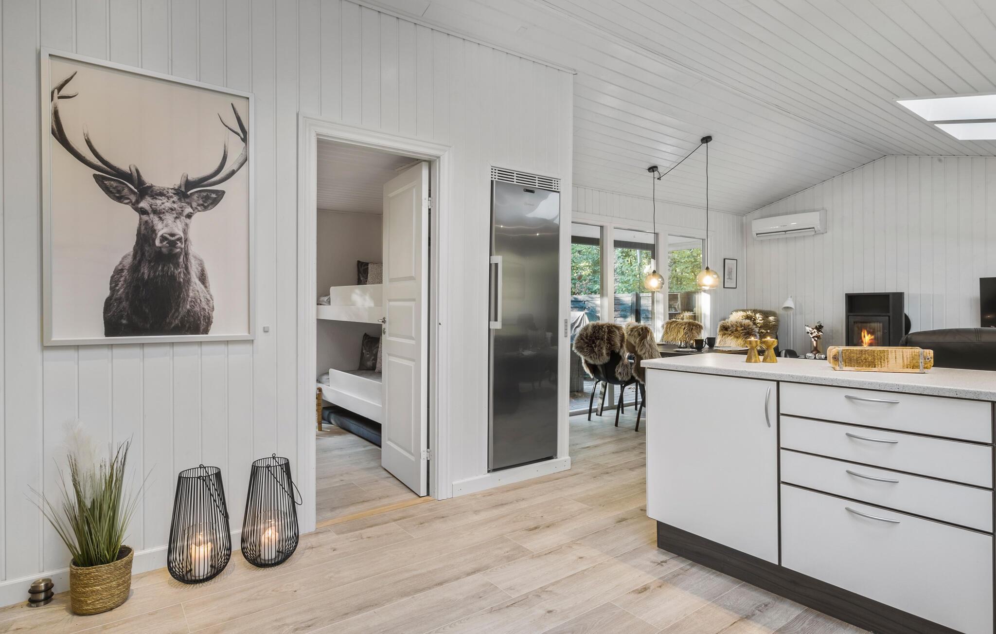 Dette skønne og familievenlige feriehus i Helberskov giver jer den perfekte balance mellem hygge og afslapning. Den varme, indbydende indretning og de kærlige detaljer skaber en afslappet atmosfære, hvor I straks vil føle jer hjemme. Lav mad sammen i det åbne køkken, eller nyd varmen fra brændeovnen i lænestolen. De lyse rum og den rummelige terrasse inviterer til rolige stunder udendørs, hvor I kan nyde den friske luft og områdets fred. Det er det ideelle sted at koble af og lægge hverdagens stress bag sig.