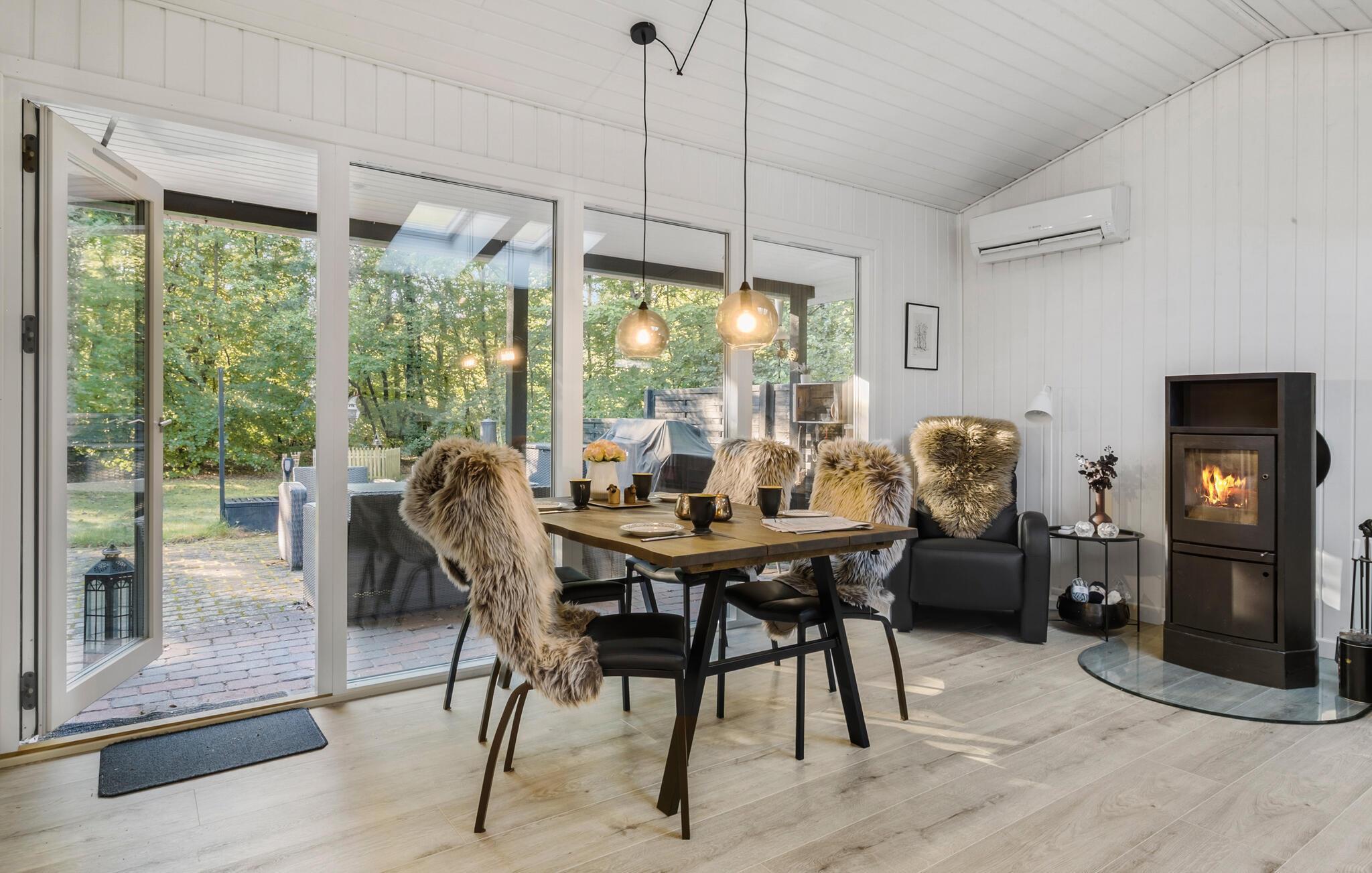 Hyggeligt feriehus i Helberskov med brændeovn, terrasse og nær strand - perfekt til afslapning i naturskønne omgivelser.