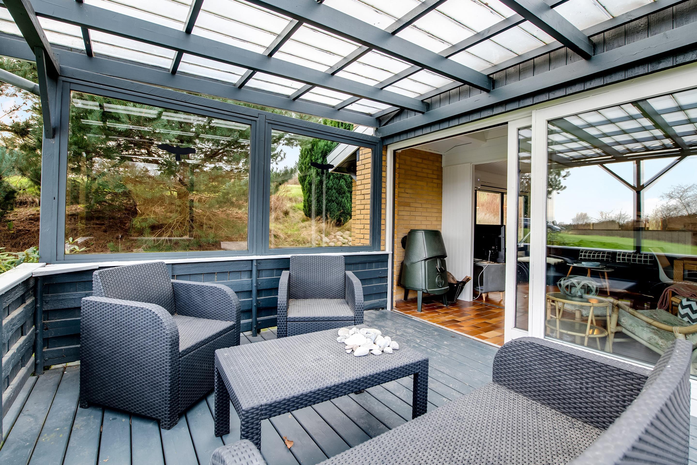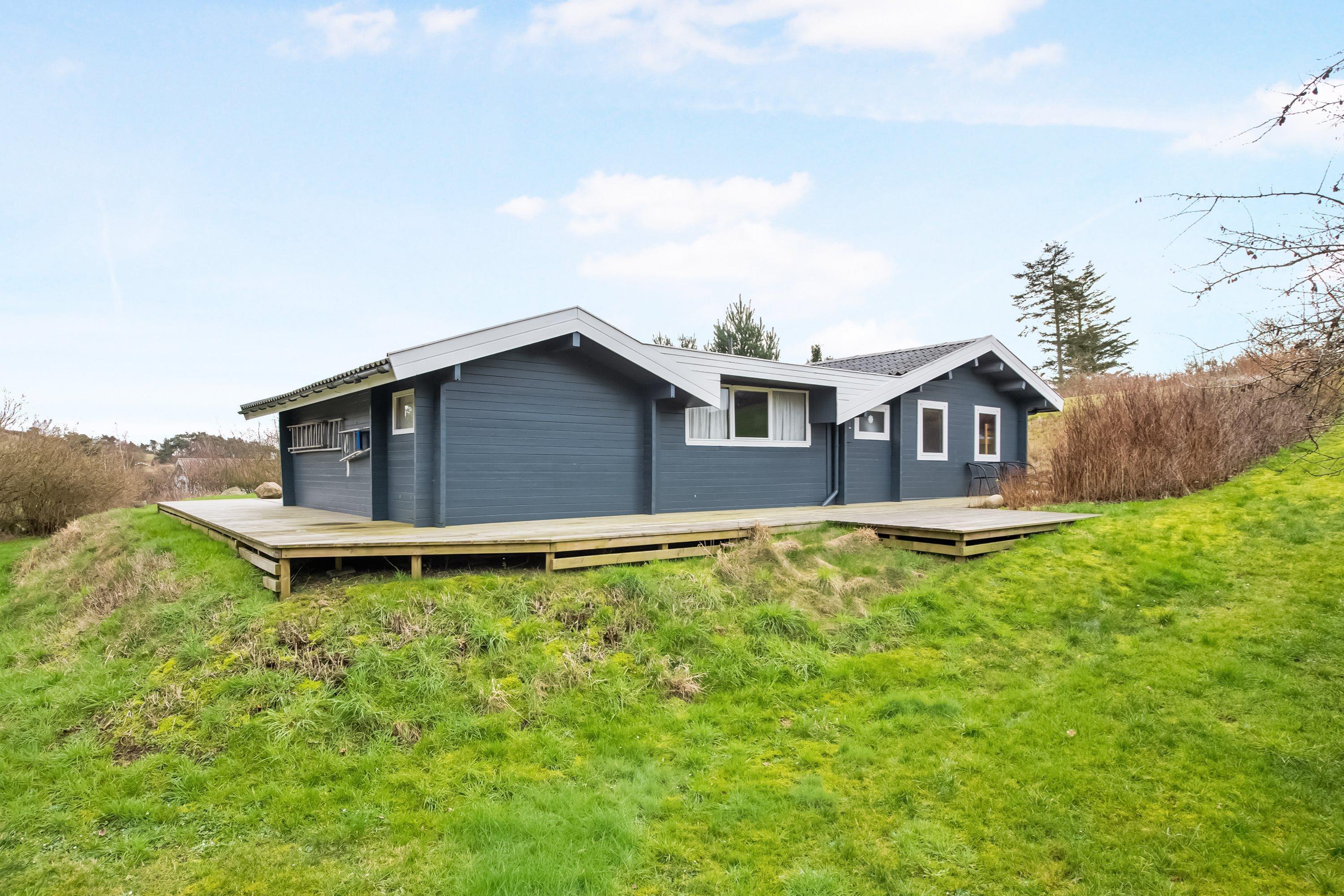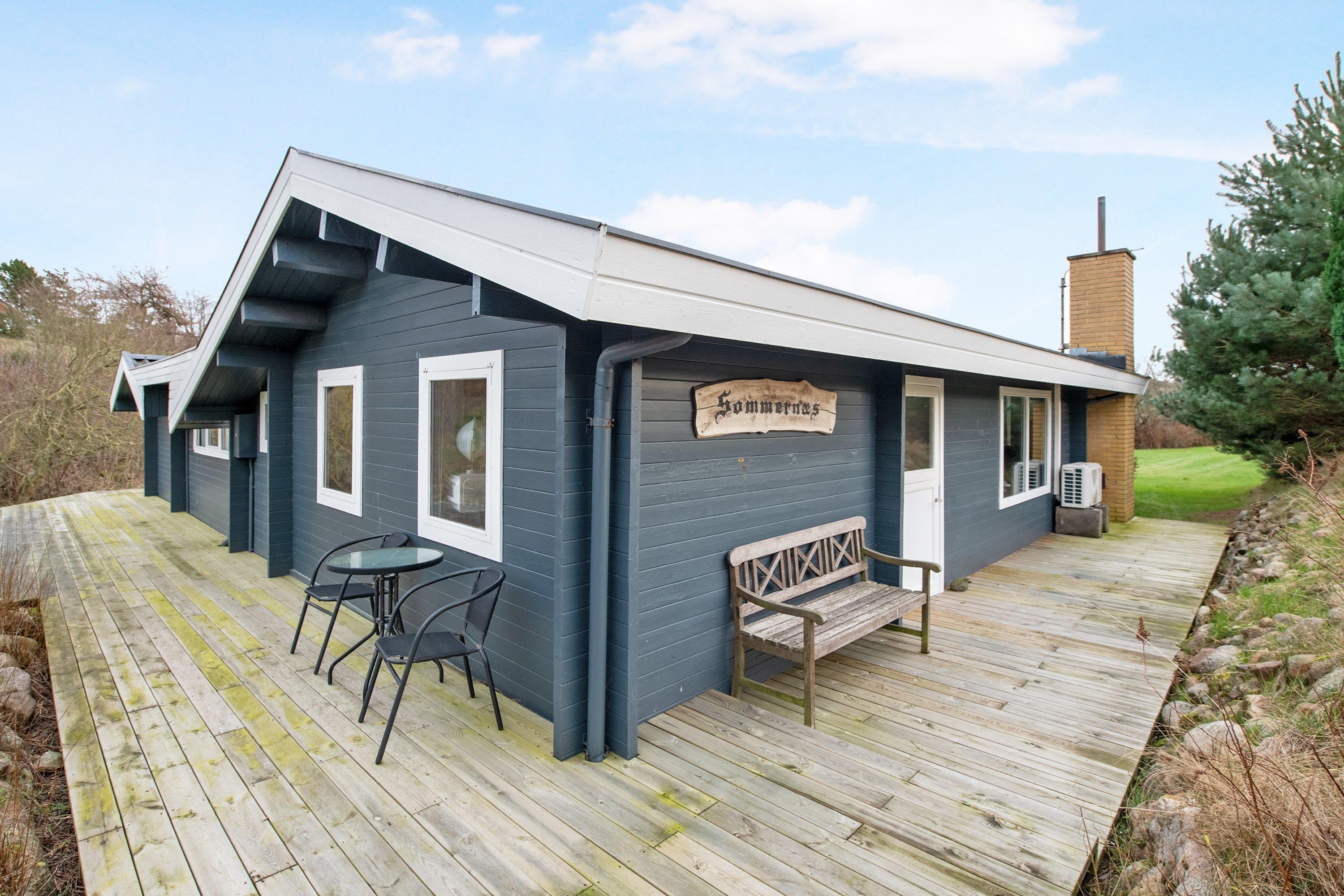 Charmerende bjælkehus på Helgenæs med stor terrasse, tæt på strand og natur, ideelt til afslapning og udendørs aktiviteter.