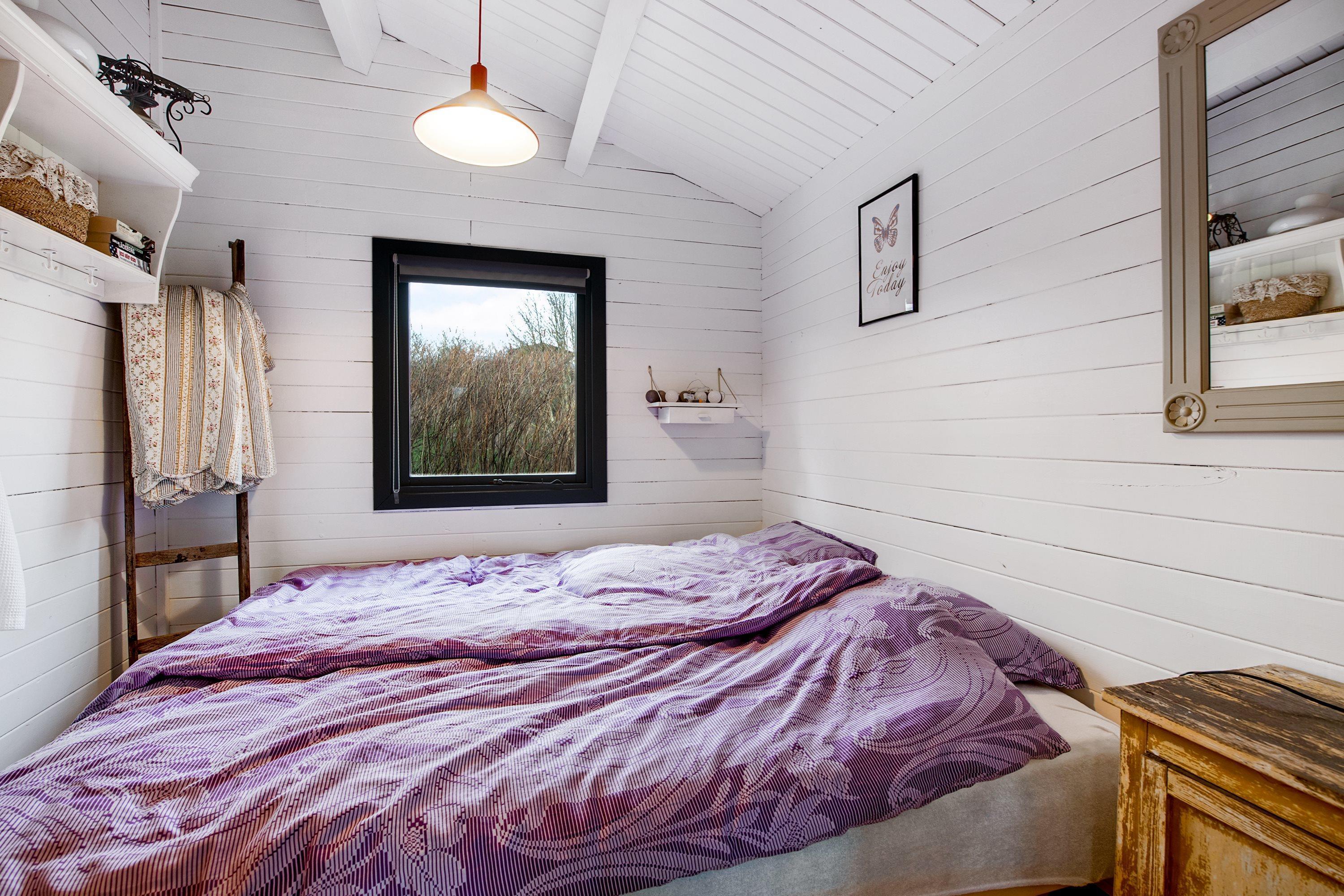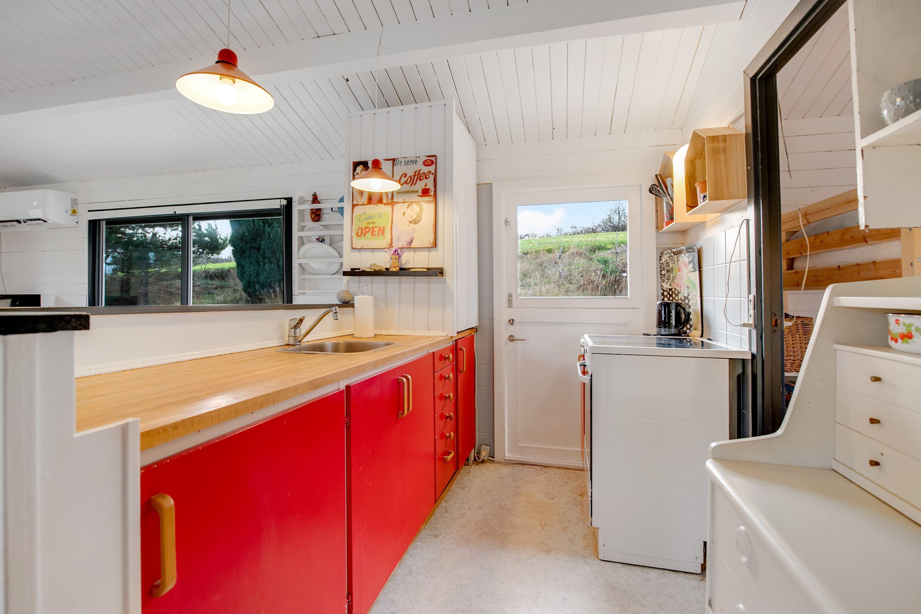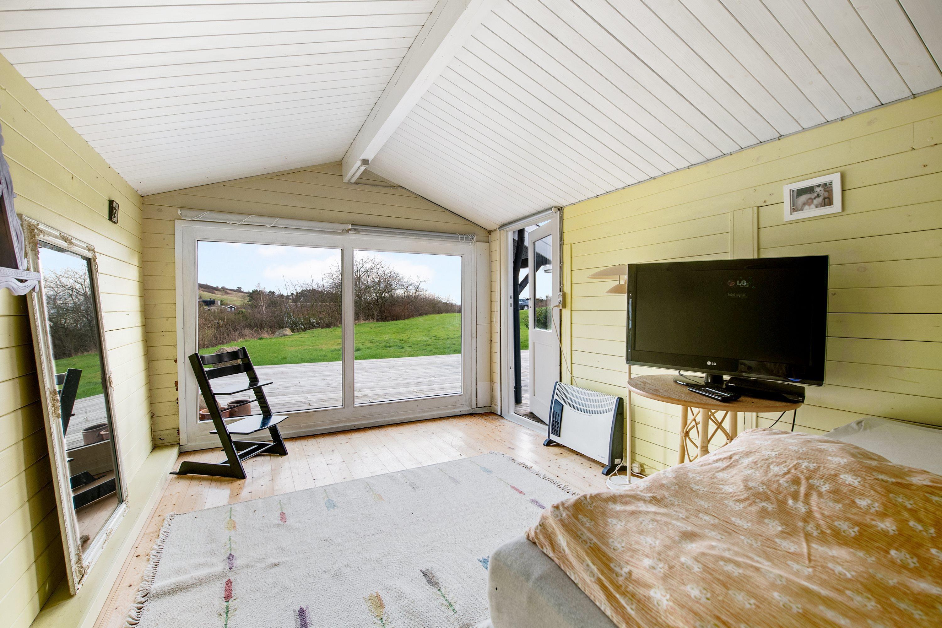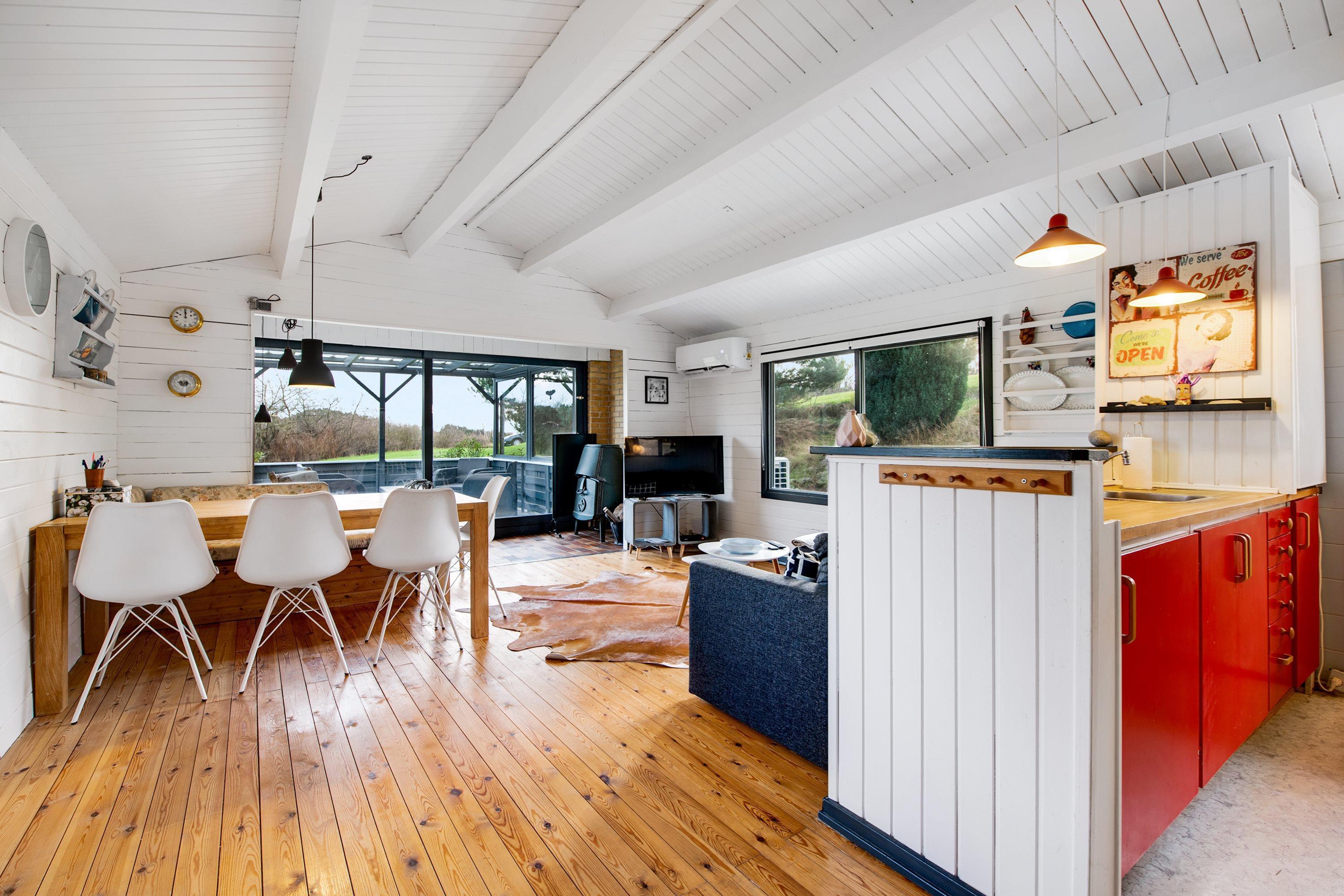 Den hyggelige, velmøblerede opholdsstue med udgang til overdækket terrasse/udestue fremstår som resten af huset lys og indbydende med hvidmalede vægge og lofter til kip. Her er spiseafdeling til 6 personer, brændeovn, dejligt sofahjørne og TV med danske gratis kanaler. Det lille men velindrettede køkken ligger i åben forbindelse med stuen og har komfur med keramiske kogeplader, ovn og køleskab. Husets i alt 6 sengepladser fordeler sig på 1 soveværelse med dobbeltseng, 1 værelse med køjeseng samt stort anneks med dobbeltseng og eget toilet. I hovedhuset er der varmepumpe og der et lyst og praktisk indrettet badeværelse med bruseniche samt badekar til de mindste. Der er ligeledes varmepumpe i annekset. Der er internetadgang.
