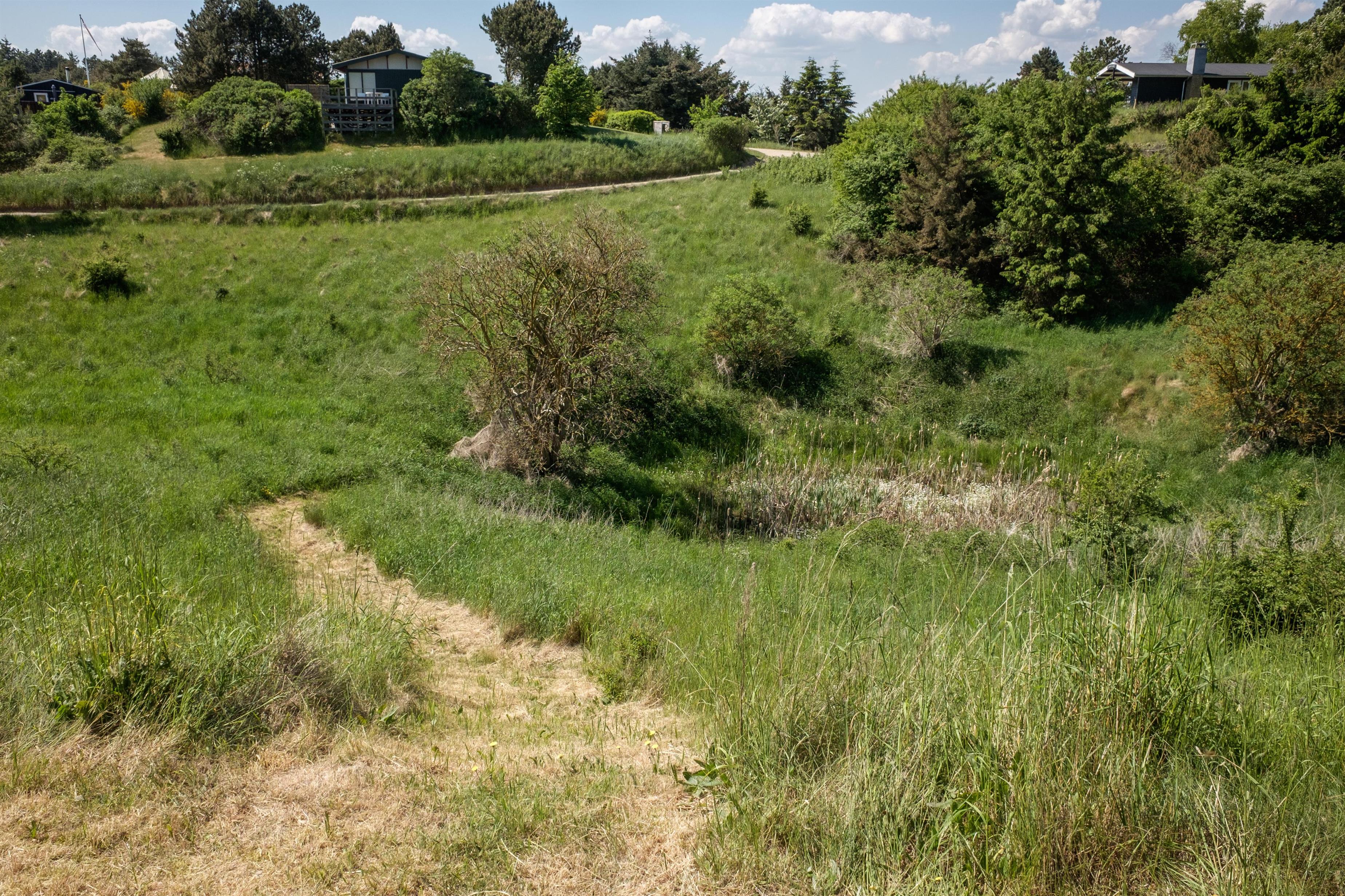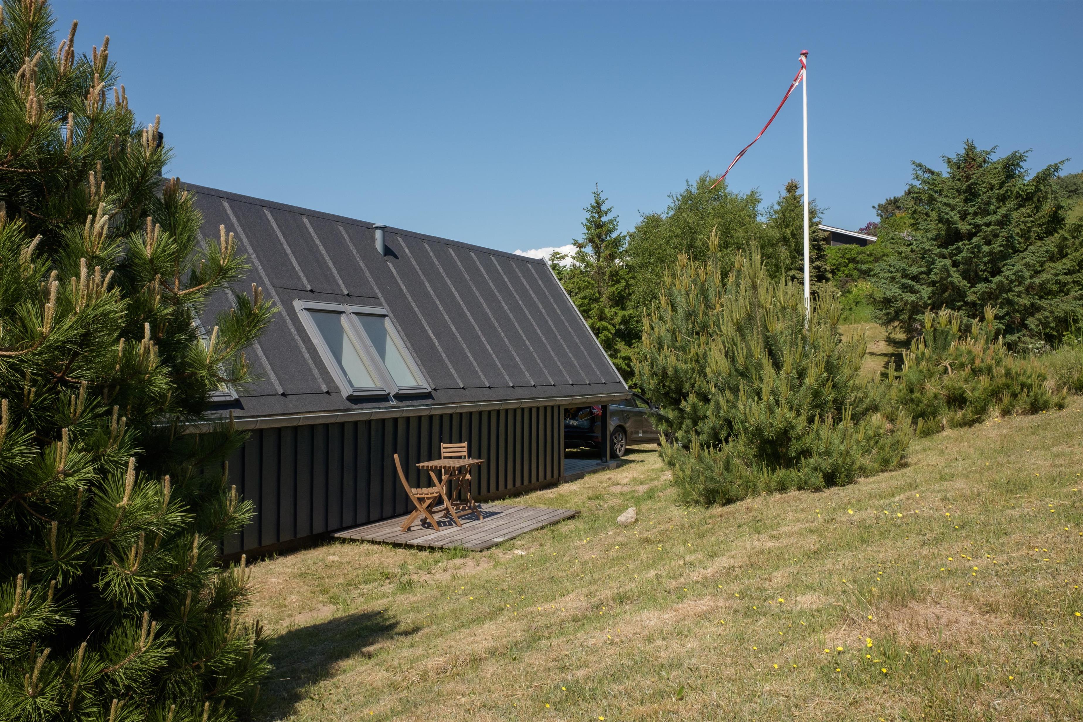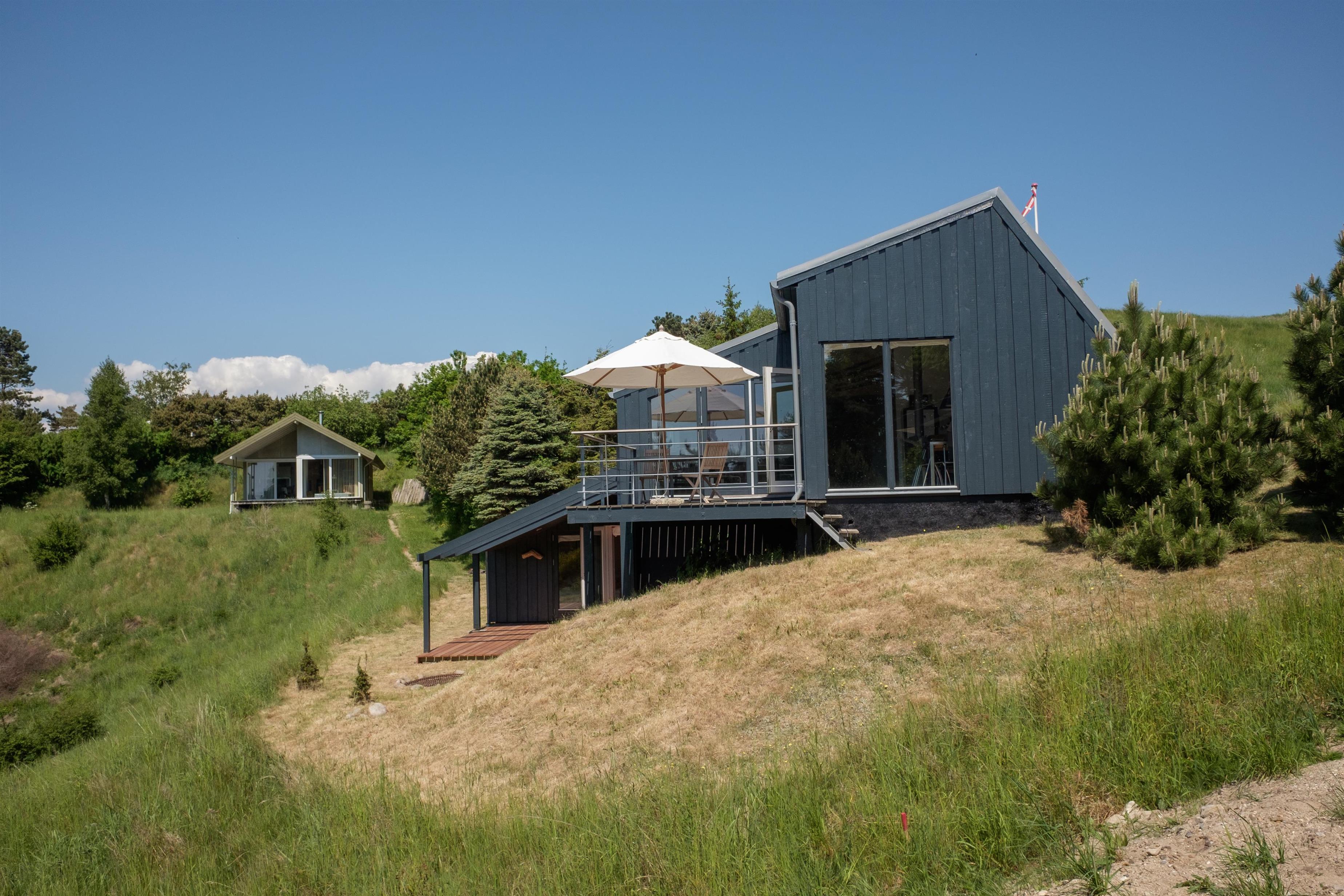Ualmindelig lækkert og spændende, nyere sommerhus på 135 kvm. i forskudte plan. Huset er højt beliggende på skrånende naturgrund med udsigt over det kuperede landskab på vestsiden af Helgenæs og bare 500 meter fra stranden. Her er 2 skønne terrasser i forskellige plan, den ene overdækket, med havemøbler, liggestole, parasol og grill.