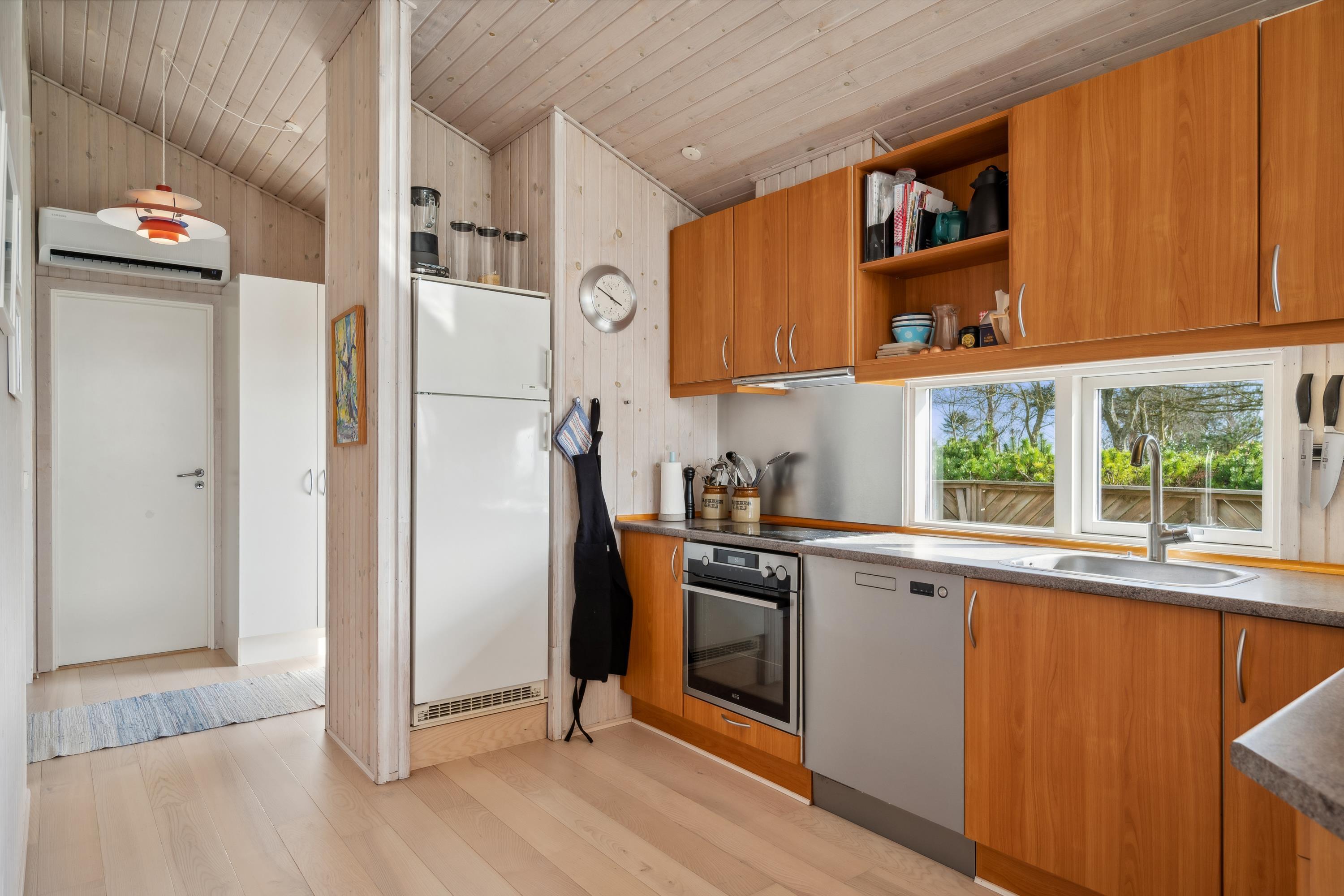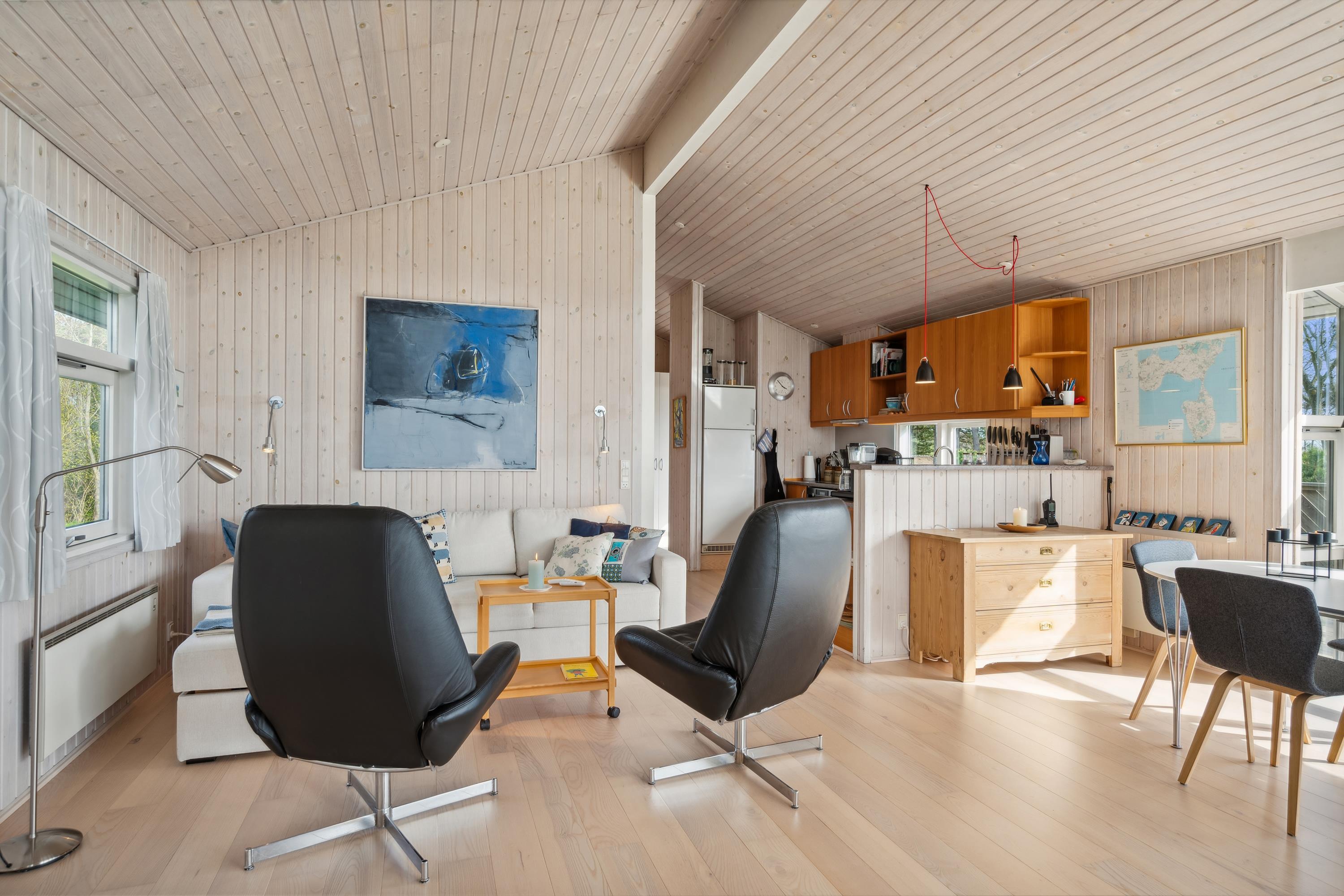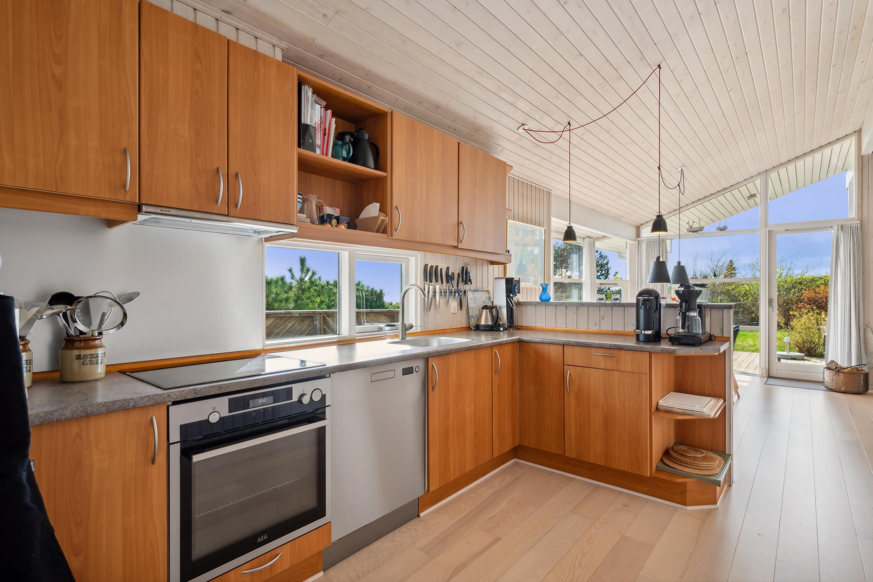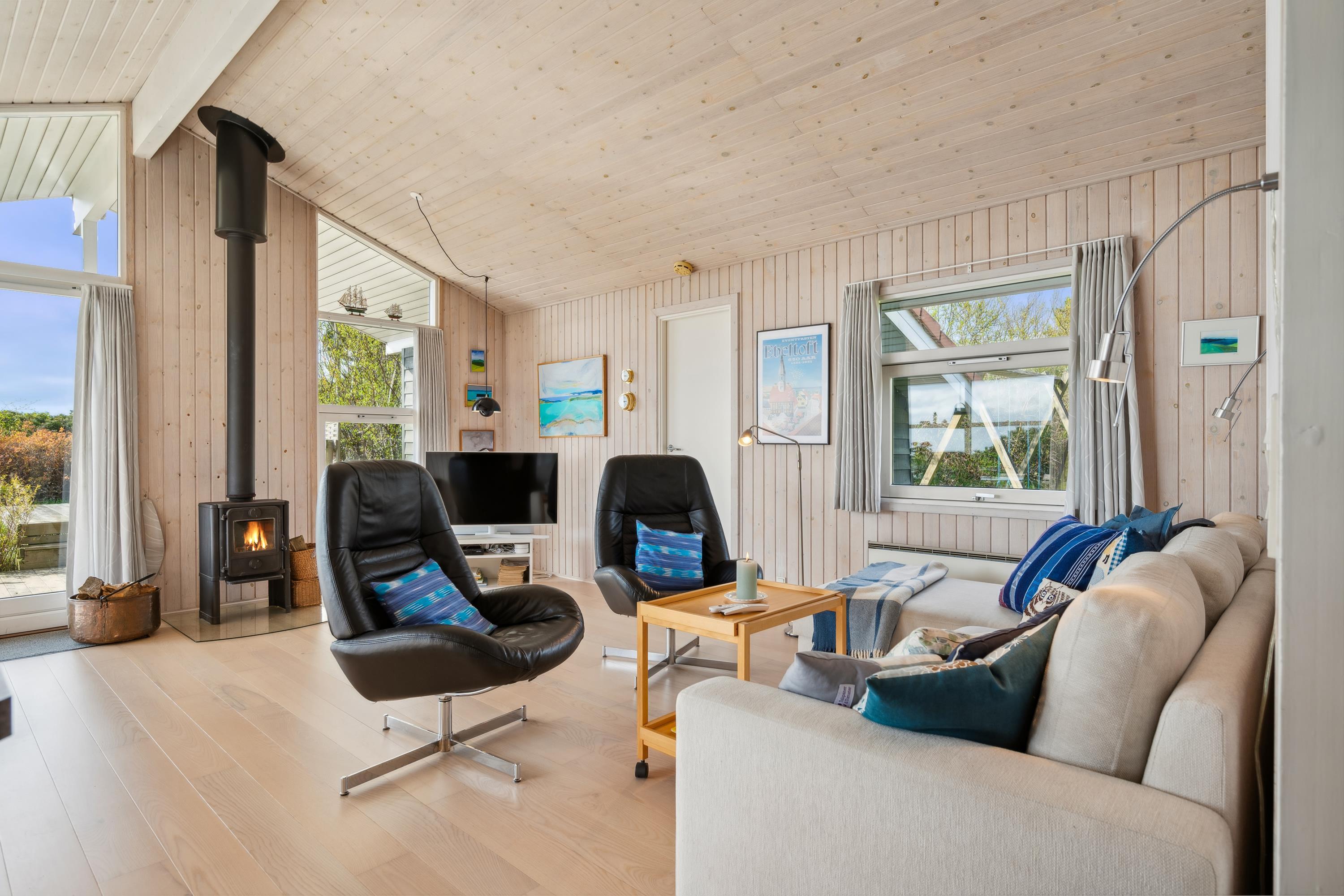Wauuu- sikken en udsigt er det første man siger, når man ankommer til dette flotte feriehus. Her finder man en hyggelig og velmøbleret stue med brændeovn og varmepumpe samt en dejlig spiseafdeling med udsigt til vandet. Fra stuen er der udgang til både overdækket og åben terrasse med havemøbler og grill. Flot køkken med b.la. opvaskemaskine. Lækkert badeværelse med gulvvarme, bruseniche og badekar samt adgang til husets sauna. Gæstetoilet med håndvask og adgang til vaskemaskine. Husets sovepladser fordeler sig på tre hyggelige værelser med dobbeltsenge. TV foregår via Chromecast/internet. Huset er beliggende på en dejlig grund med stor græsplæne, velegnet til leg og udendørsaktiviteter. Her er der fodboldmål og gynger og der er også en hyggelig bålplads. Et virkeligt flot feriehus og er man flere familier afsted, som gerne vil være tæt på hinanden, udlejer vi fem andre huse på samme vej.