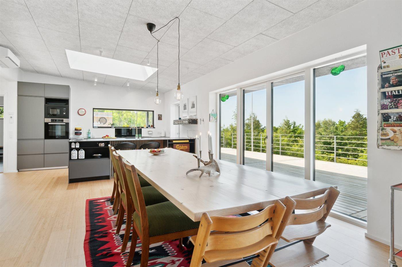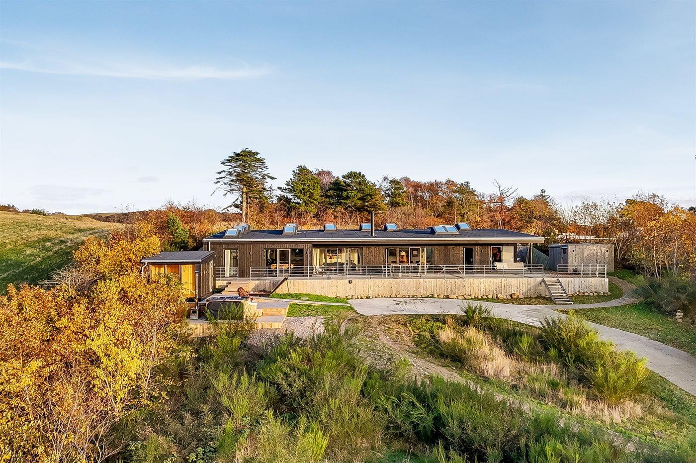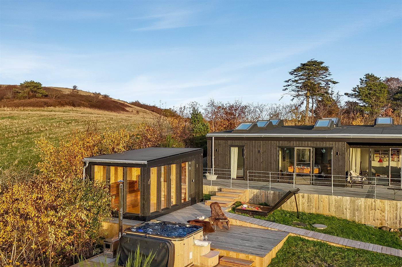 Moderne sommerhus på Helgenæs med fantastisk havudsigt og aktivitetsrum, perfekt til afslapning og sjov.