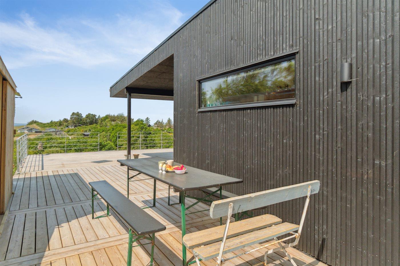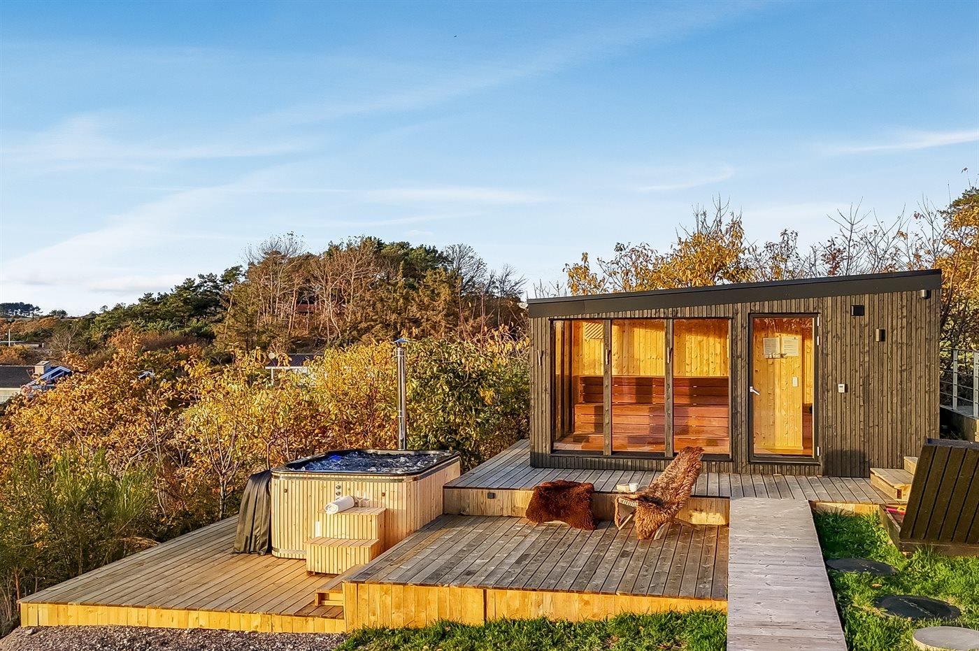 Ferieboligen er beliggende på en 3676 m² stor naturgrund. Der er 500 m til havet. Nærmeste forretning er beliggende i en afstand af 5000 m. Til ferieboligen hører 250 m² terrasseareal. Desuden er der 50 m² overdækket terrasse. Der er redskabsrum. Sandkasse. Udendørs sauna. 2 udendørs brusere. Der er installeret stik til opladning af elbil. Med 11 kW ladeeffekt. Parkering ved ferieboligen.